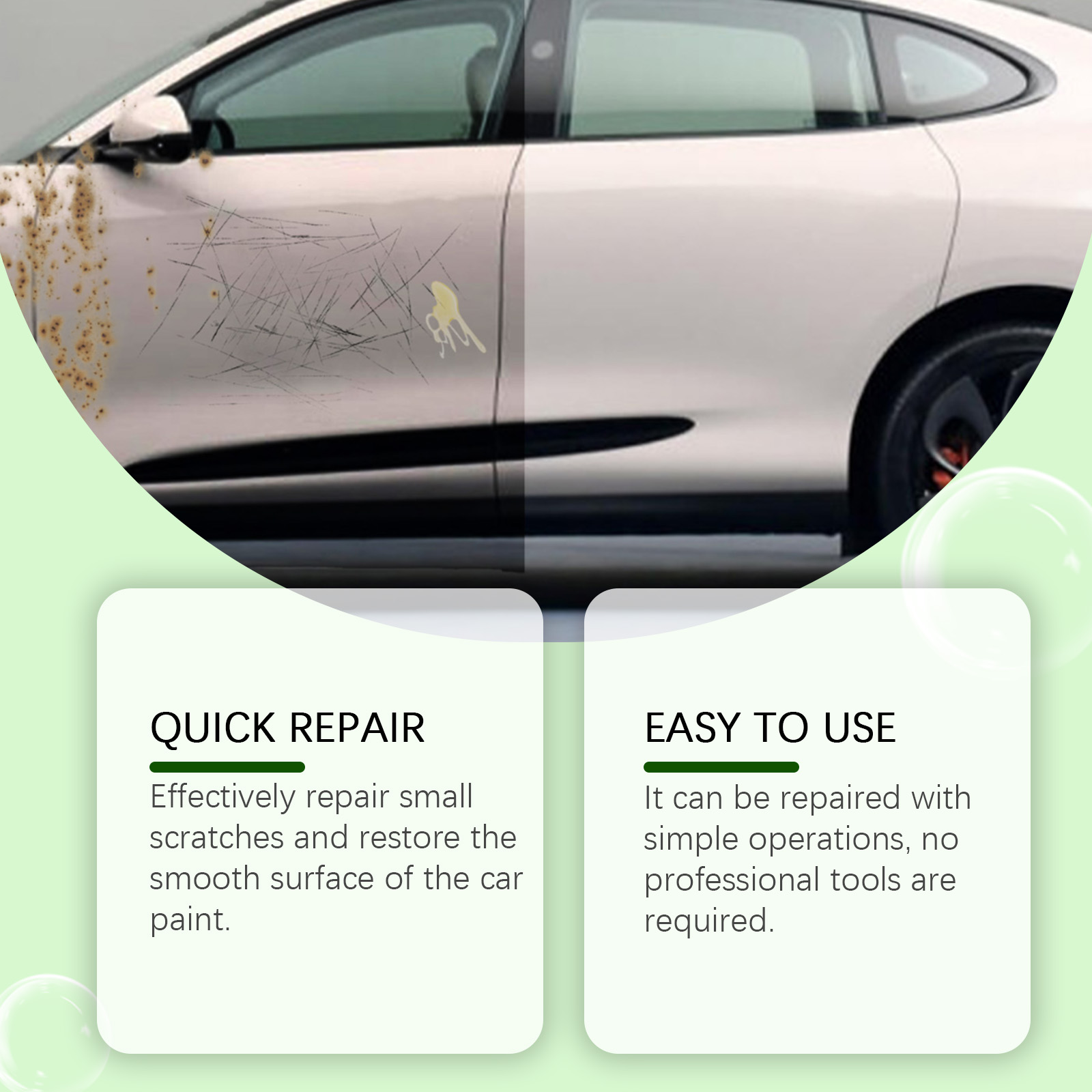 Our car scratch repair lotion contains sodium dodecyl sulfate and sodium carboxymethyl cellulose. It can effectively repair small scratches and restore the smooth finish of the car. It is simple to use: it can be repaired with simple operation and no professional tools are required. And can enhance the surface hardness, improve the repair effect.