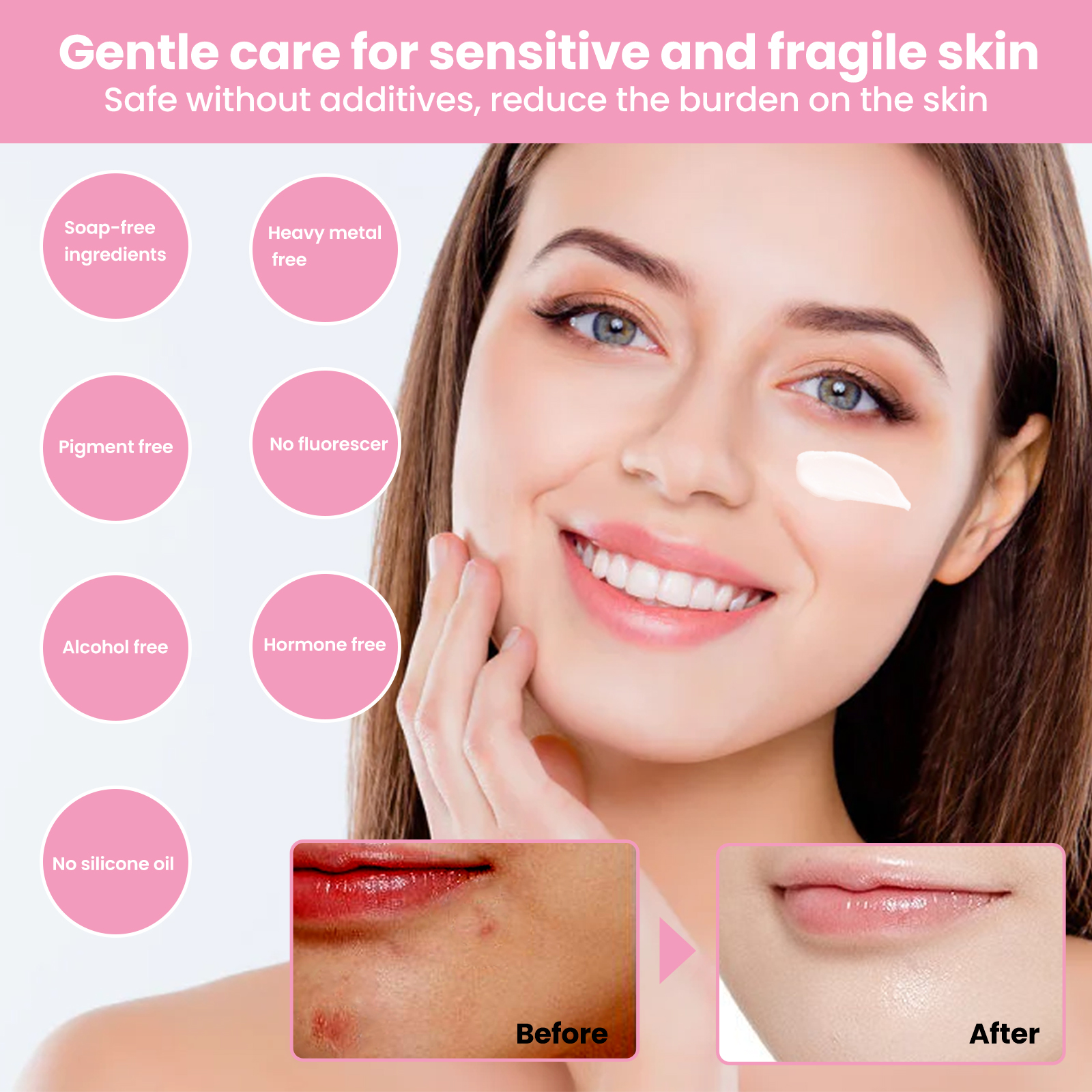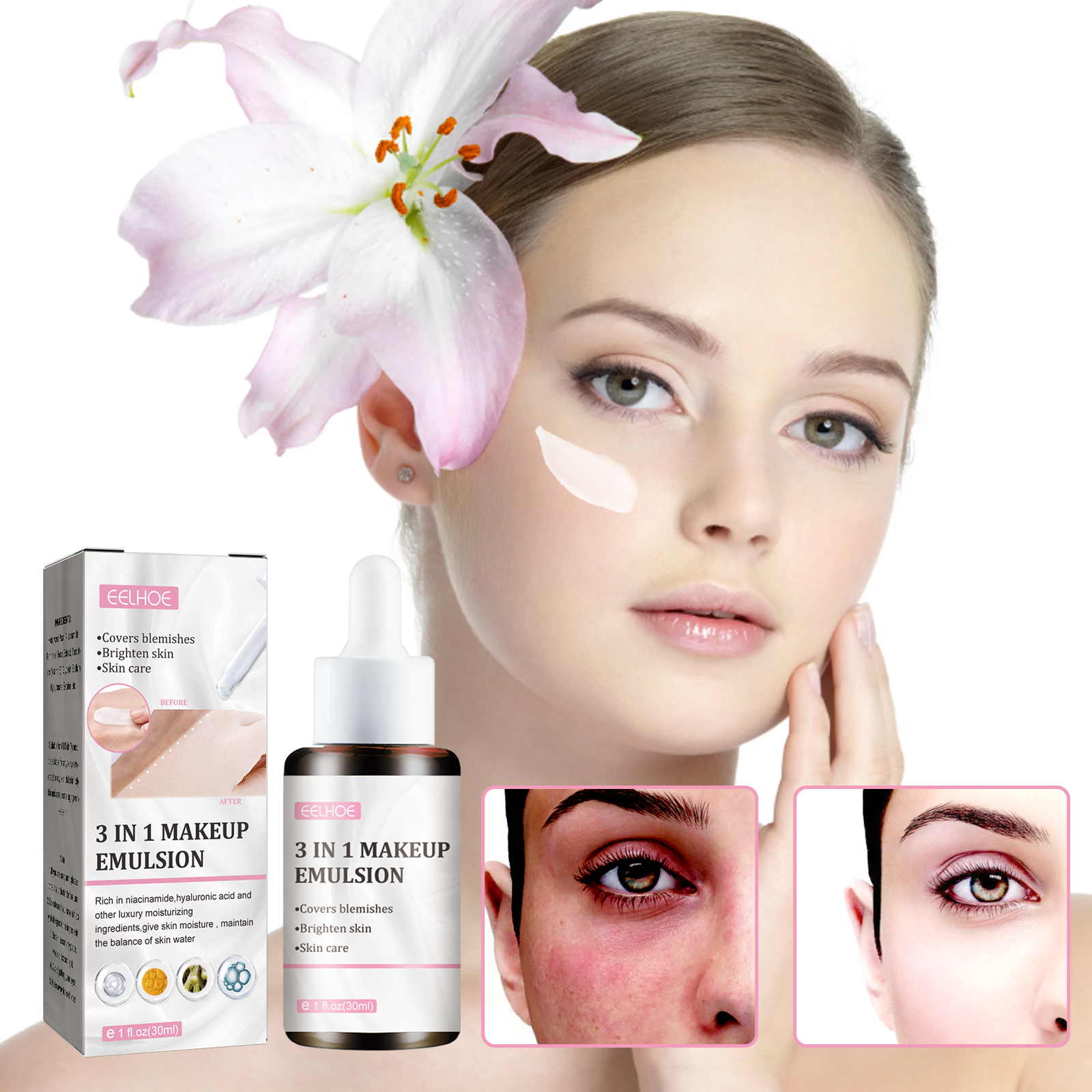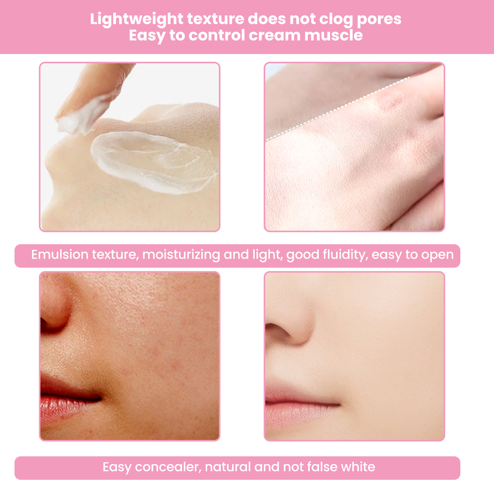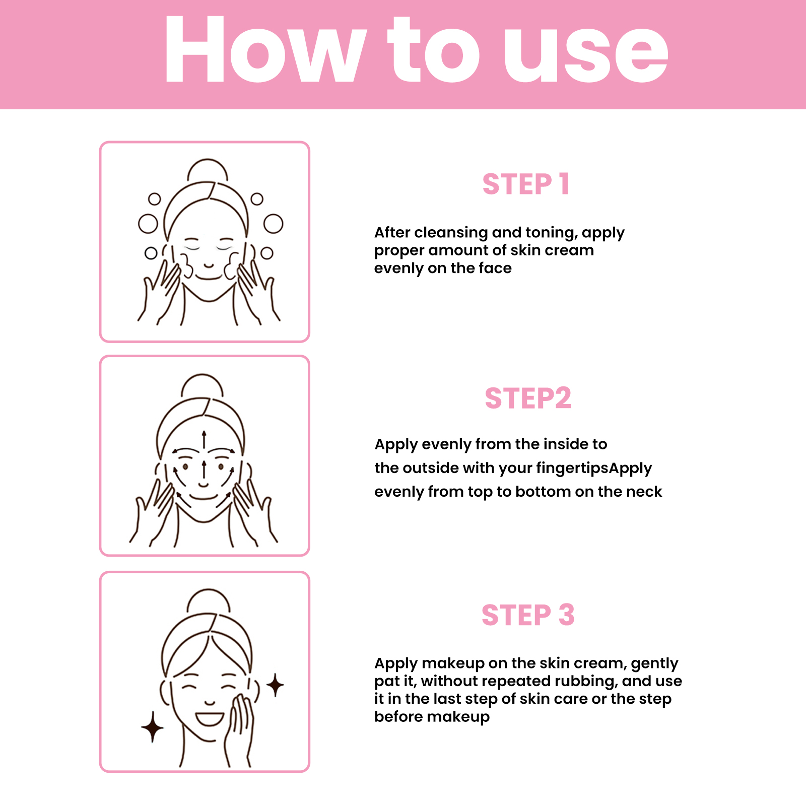 Our 3-in-1 cream contains niacinamide, provitamin B5, hydrolyzed pearls. It can lighten the skin, say goodbye to the dark false white powder, natural brightening, brightening ingredients, improve the dark skin; A variety of skin nourishing ingredients, deep moisturizing and hydrating, lock skin moisture, easy to apply and makeup. Its use method is very simple: 1. After cleansing and toning, take appropriate amount of cream evenly apply to the face; 2. Apply evenly on the neck with fingertips from inside to outside, from top to bottom; 3. Apply the makeup to the skin cream, gently pat it, do not rub it repeatedly, and use it in the last step of the skin care or the step before makeup. Natural long-lasting makeup, not false white, not sticky powder, not greasy, good extensibility; No need to remove makeup. Wash with facial cleanser.