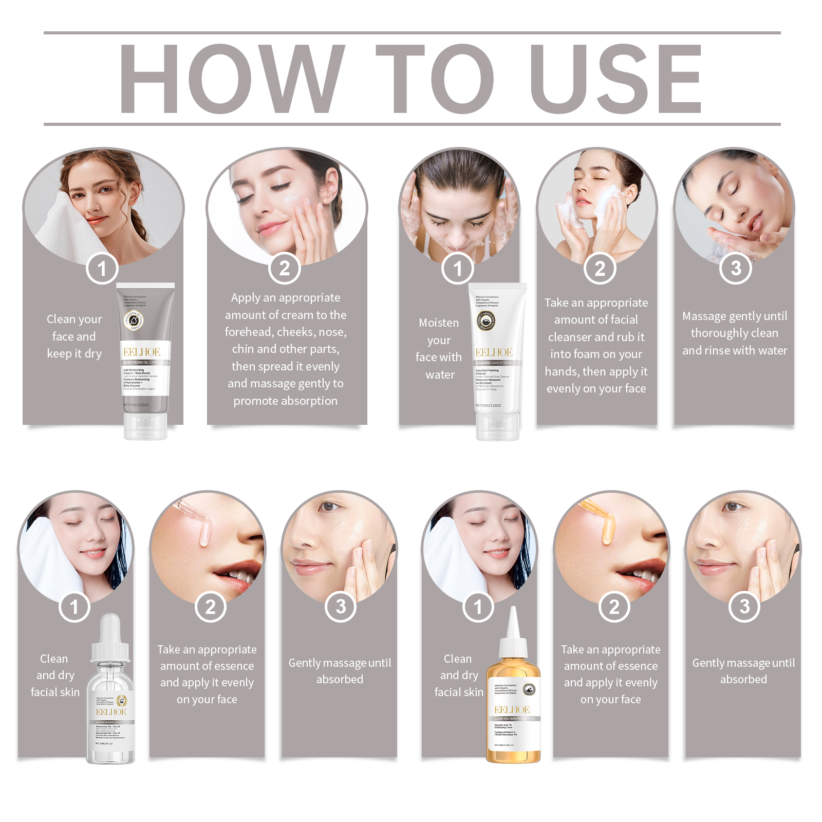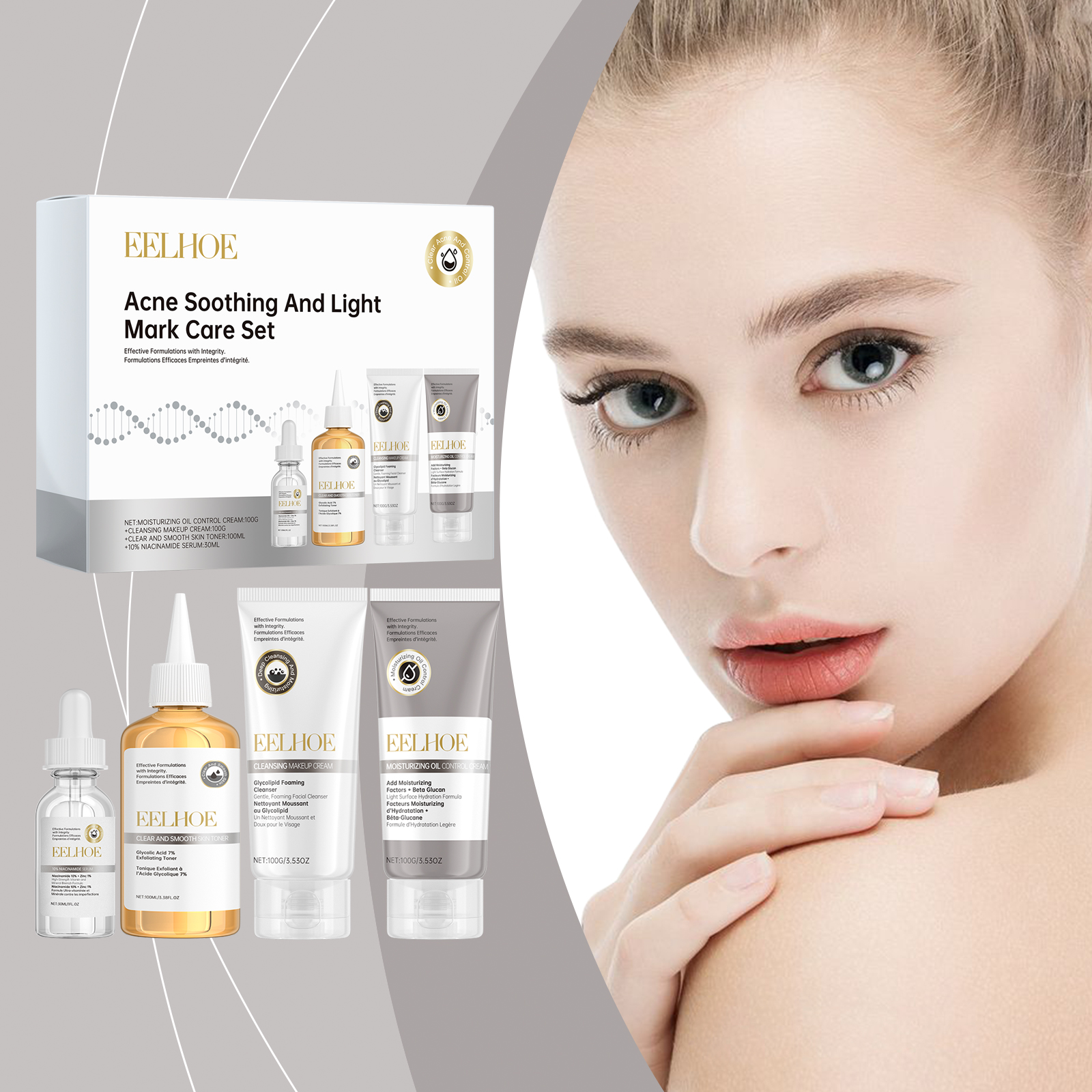 Our acne Light Print care kit contains 7% glycolic acid toner: ginseng extract, glycolic acid; Natural moisturizing factor + β-glucan moisturizing cream: ceramide EOS, glucan; Biological sophora sugar fat cleanser: hyaluronic acid, sugar fat; 10% nicotinamide serum: Glycerin, nicotinamide. It can increase the water content of the skin and maintain the balance of water and oil. The way to use it is very simple: open the package and apply the anti-acne light print care set directly to the face. And can speed up pigment metabolism, gradually fade acne scars.