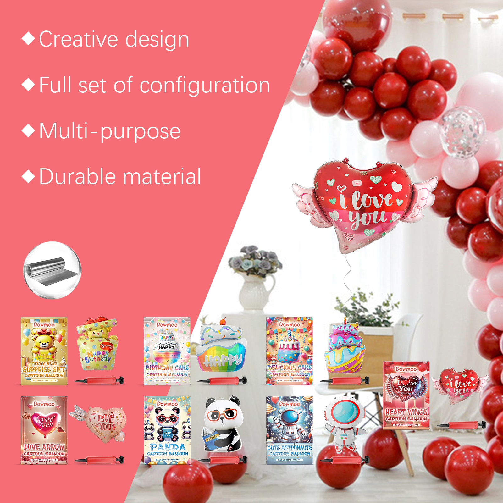 Our balloon kit contains nylon foil. It can be colorful and glossy, enhance the effect of holiday decoration, and improve the overall beauty. Its use method is very simple: 1. Put the balloon flat on the ground, and then unfold it to find the location of the air nozzle. 2. Put the inclined end of the pump up and slowly insert the air nozzle. Take care to insert the pump under the color film. 3. Hold the front end of the pump tightly and inflate evenly. 4. You can tell that inflation is complete by gently pressing the balloon and finding the bounce. 5. Fold and hide the air nozzle with tape to make the balloon stronger and better gas retention. Beautiful design and bright colors, suitable for children's birthday parties to add a happy atmosphere.