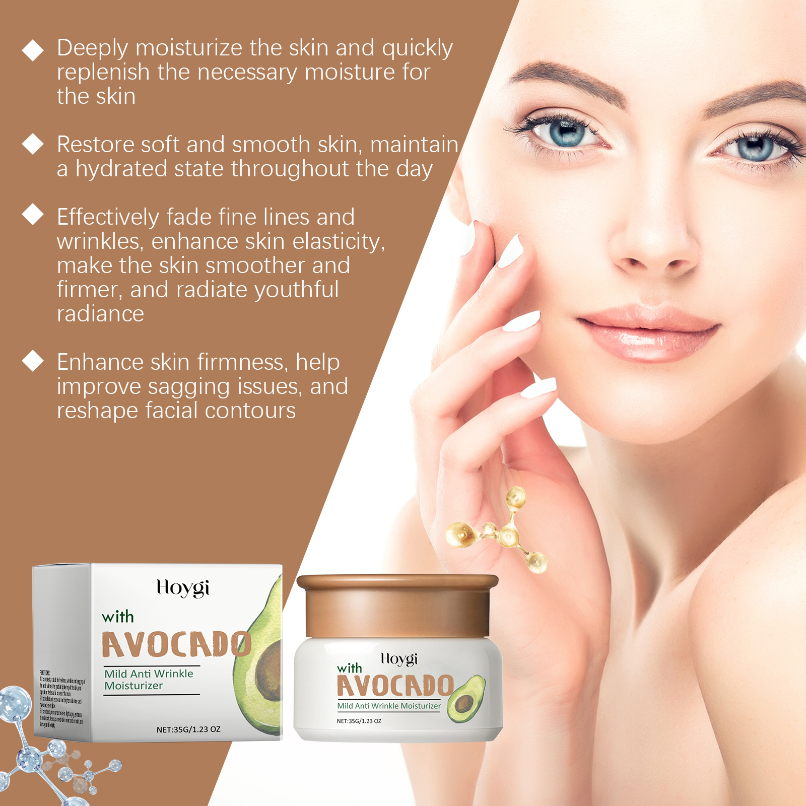 Our avocado moisturizing cream contains avocado fruit extract, vitamin C(ascorbic acid), vitamin E(tocopherol). It can help lighten and improve skin tone! Skin tone. Helps increase skin elasticity and reduce the formation of wrinkles. Its use method is very simple: 1. Wash your face. 2. Apply appropriate amount to face evenly. 3. Gently massage the eye sockets to promote absorption. Rich in nutrients to help maintain the health and vitality of the skin. After use, the skin can feel instant moisture, and the long-term use effect is more significant.
