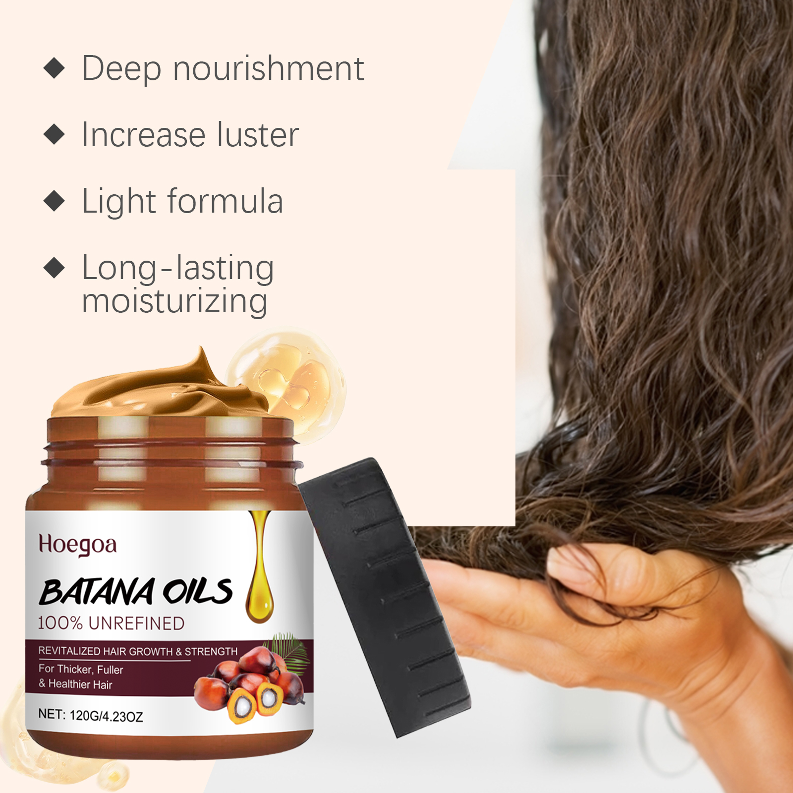 Our Batana Oil hair balm contains palm oil, tocopherol (vitamin E), castor oil. It can deeply nourish hair and repair damaged hair. Gives hair a natural shine and makes hair smoother and brighter. Its use method is very simple: 1. Moisturize hair; 2. Apply appropriate amount to hair evenly; 3. Gently massage until absorbed, then rinse with water. Deeply nourish and repair damaged skin.