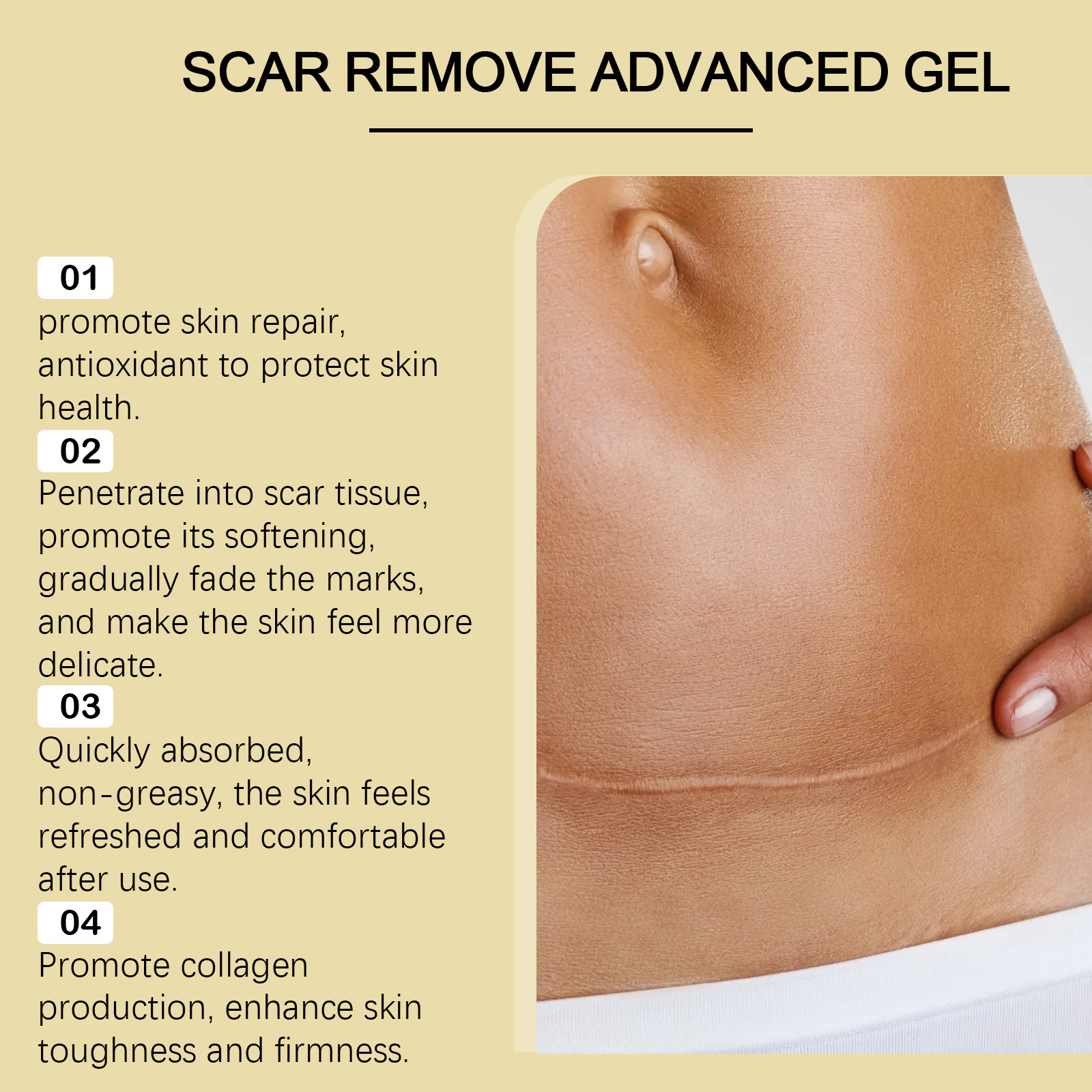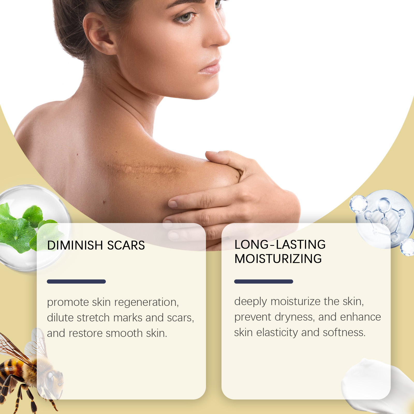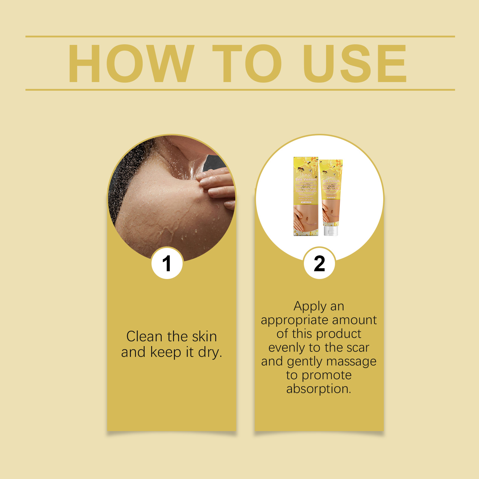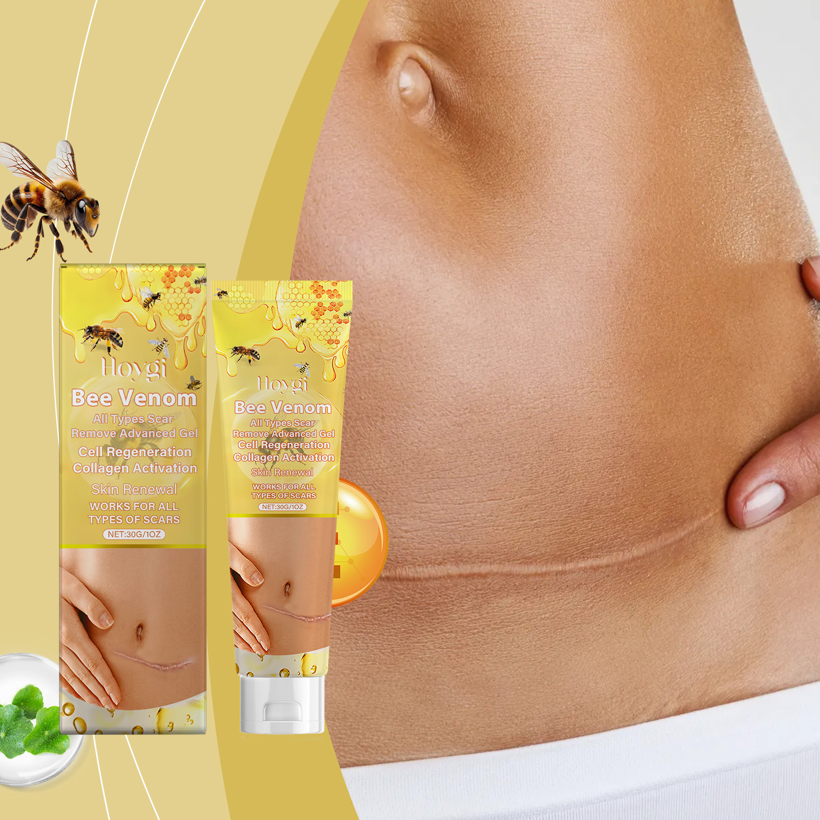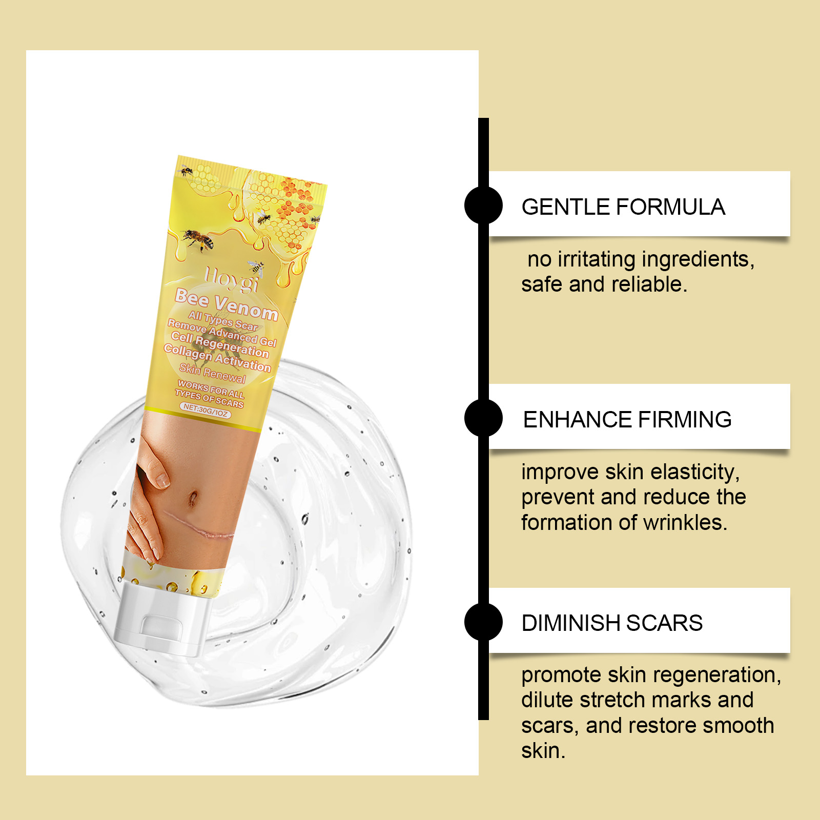 Our body care gel contains bee venom, garlic extract, and Asiaticum herb extract. It can promote skin regeneration, fade stretch marks and scars, and restore smooth skin. The way to use it is simple: 1. Clean your skin and keep it dry. 2. Apply appropriate amount of the product evenly on the skin, gently massage to promote absorption. It deeply moisturizes the skin, dryness, and enhances elasticity and softness.