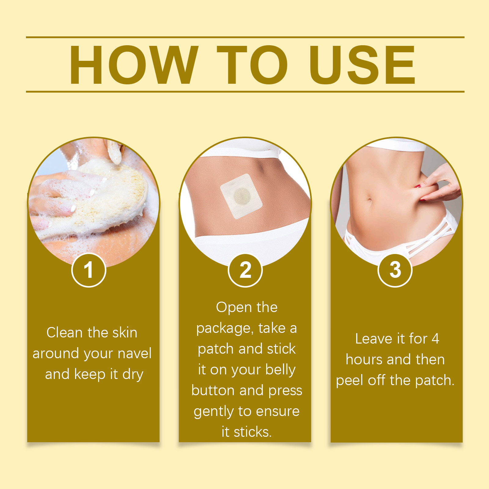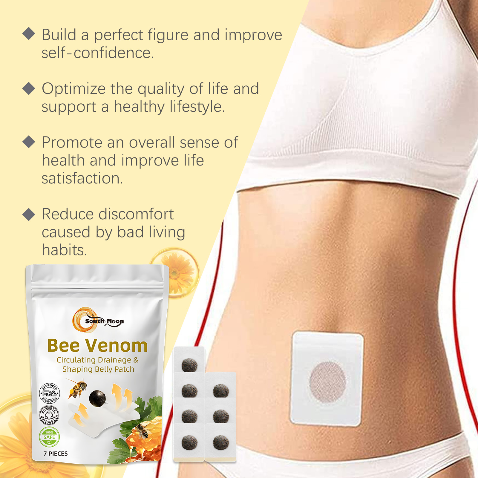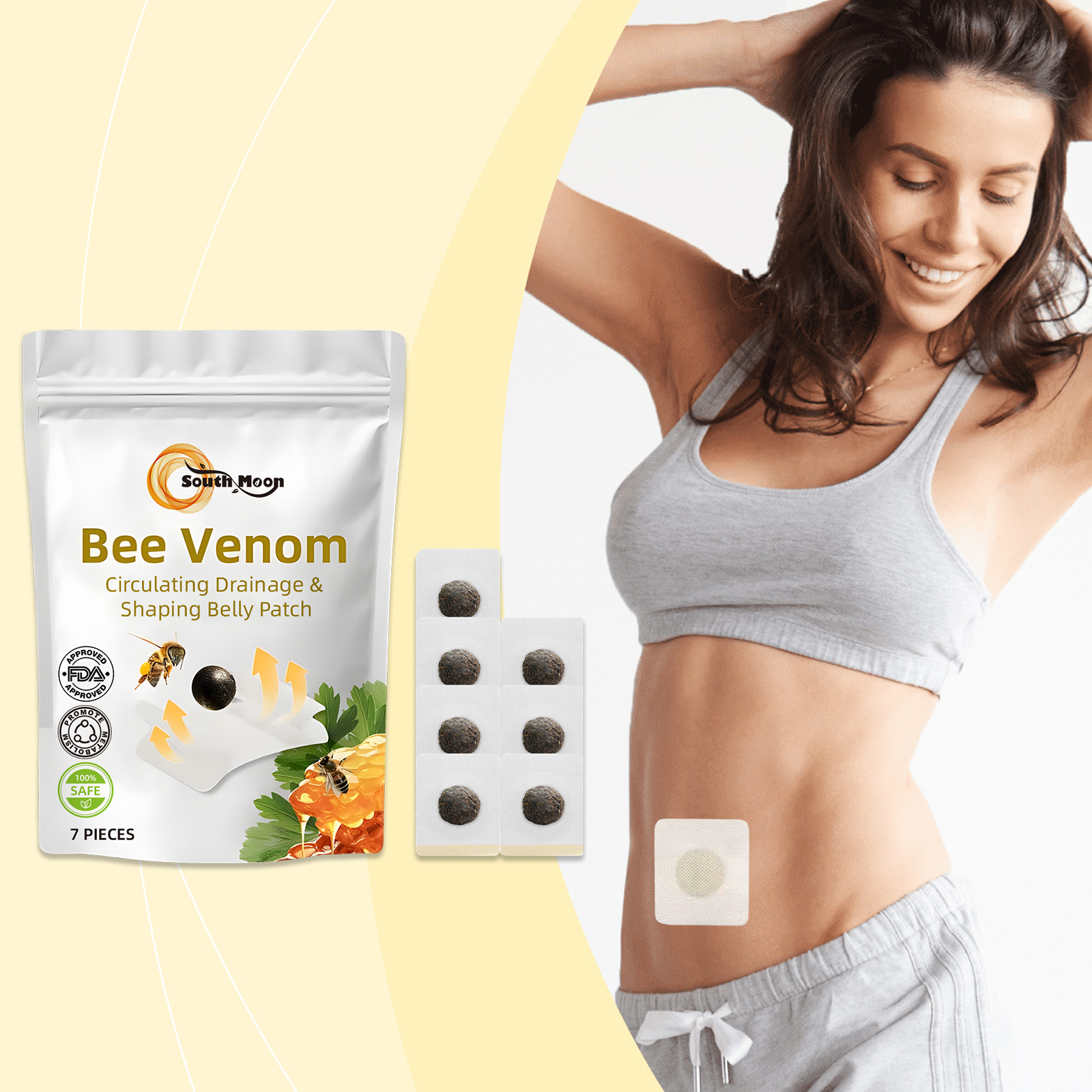 Our bee Venom Body Sculpting patch contains bee venom, calendula extract and safflower flower extract. It can promote collagen production and improve skin elasticity; Boost metabolism, improve firming effect. Improve skin blood circulation, increase skin edema. Its application method is simple: 1. Clean the skin around the belly button and keep it dry; 2. Open the package, stick the patch on your belly button, and press firmly until it is well attached. 3. Let it sit for 4 hours, then remove the patch. Bee Venom Body Shaping Patch uses active ingredients to effectively accelerate your body's metabolism. Boost metabolism, fat accumulation, and make your body healthier and more energetic. For both men and women, no gender restrictions.