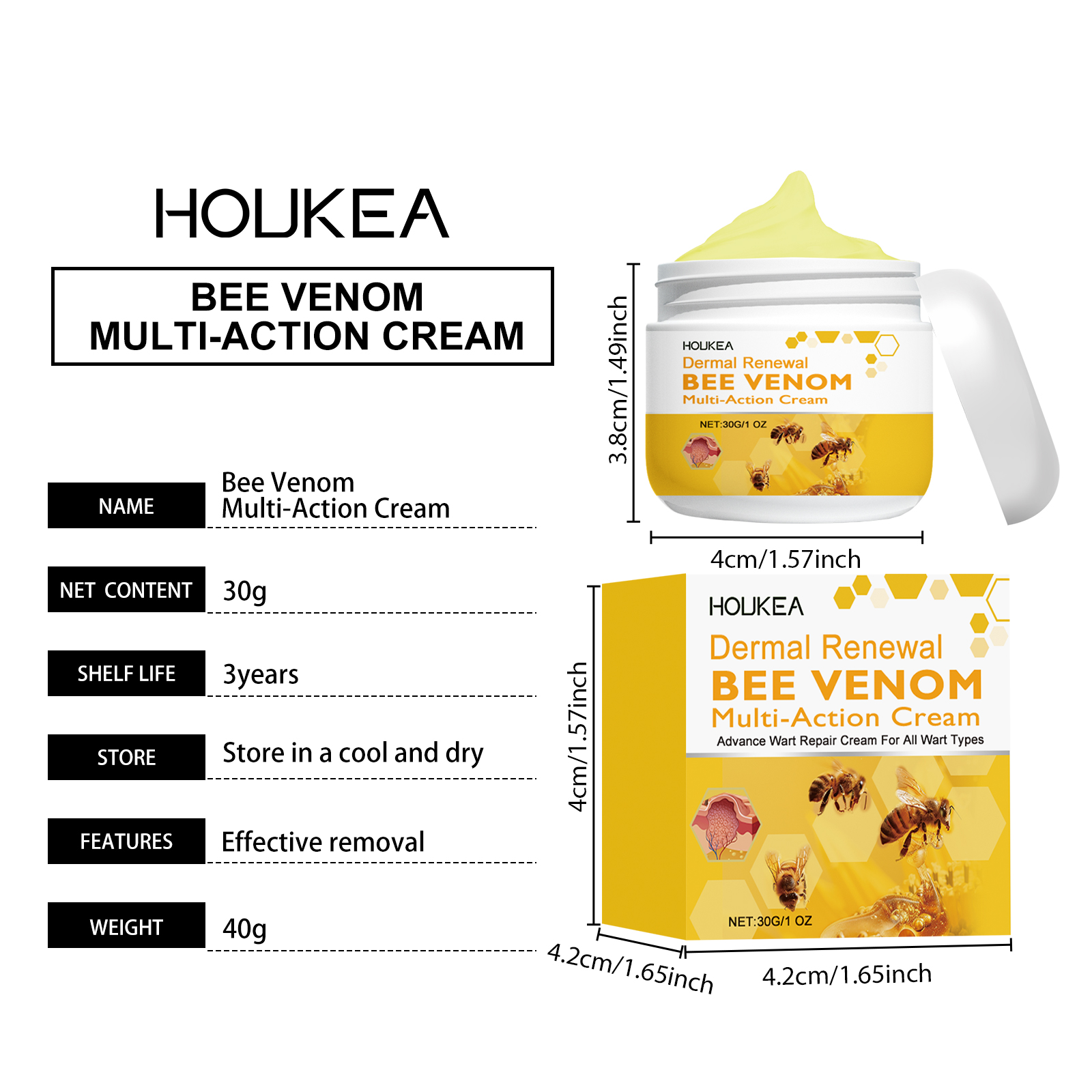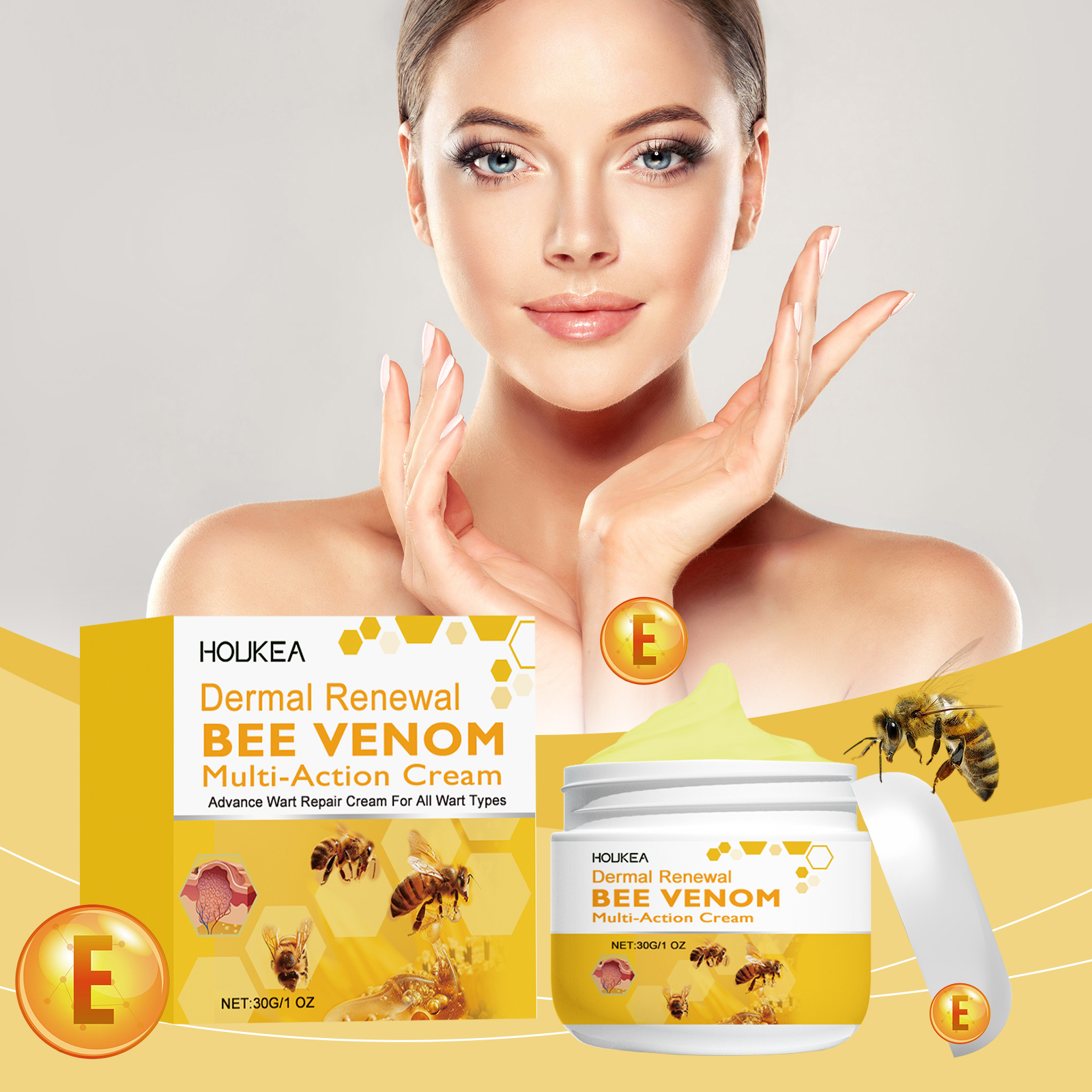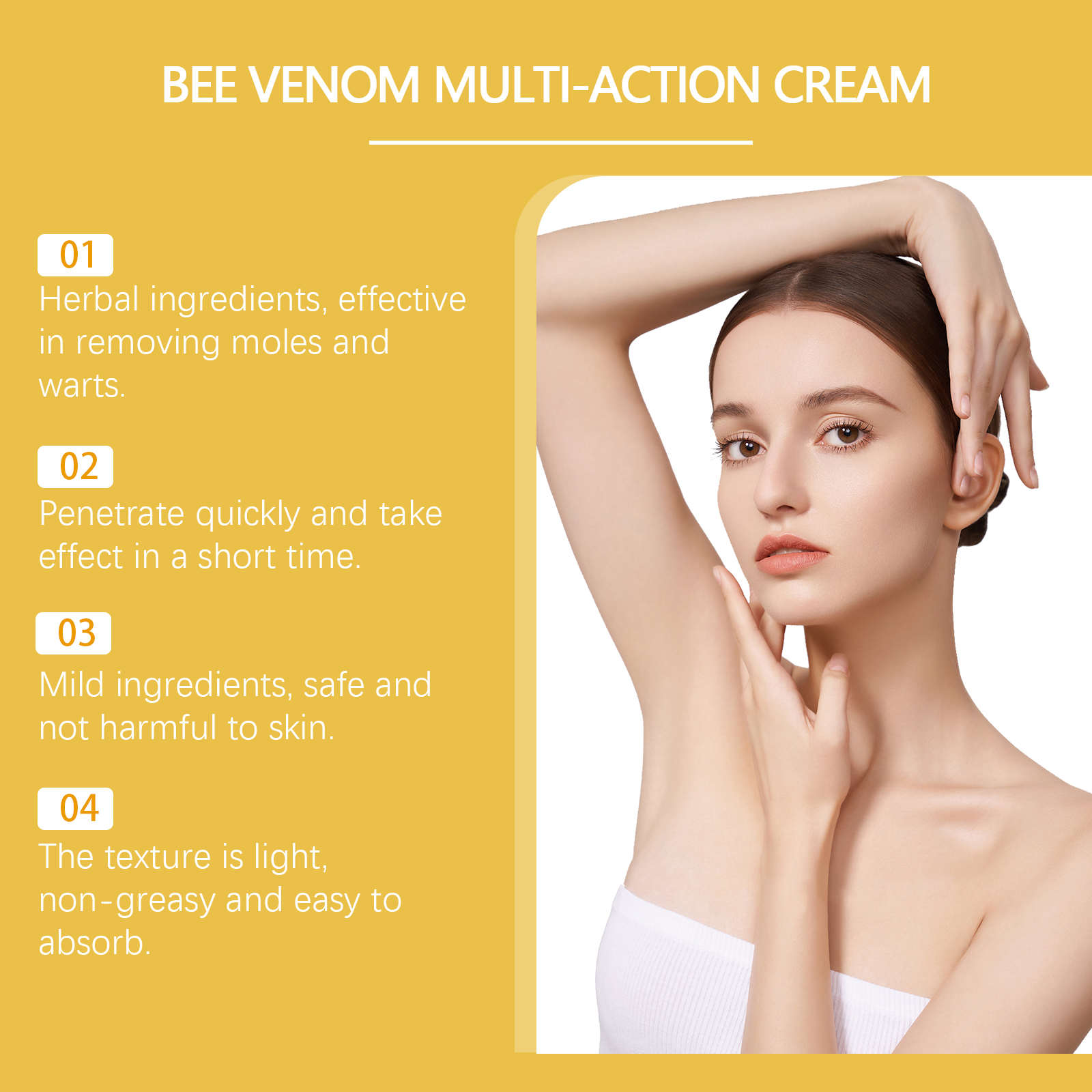Our bee Venom Relief cream contains bee venom, tea oil and tocopherol (vitamin E). It can remove moles and warts quickly, with remarkable results. The way to use it is simple: clean the skin. Apply an appropriate amount of cream to warts and moles, then apply evenly and wait for absorption. And herbal ingredients, mild and non-irritating, suitable for all skin types.