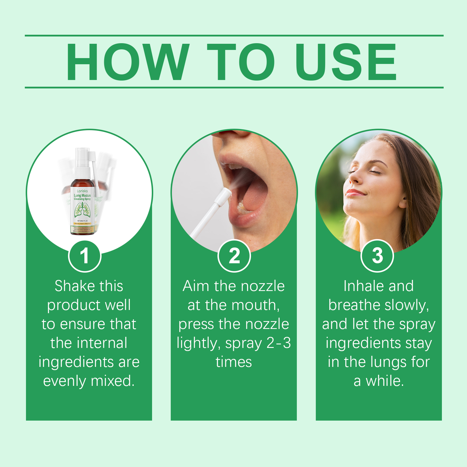 Our lung mucus cleaning spray contains gluconolactone, vitamin B1, mint leaves. It can effectively clear mucus from the respiratory tract, help improve respiratory function, and make breathing more smooth. The way to use it is simple: shake the product to ensure that the internal ingredients are evenly mixed, aim the nozzle at the mouth, gently press the nozzle, spray 2-3 times slowly inhale and breathe, and let the spray ingredients stay in the lungs for a while. And can improve the discomfort caused by mucus buildup by cleaning the airways.
