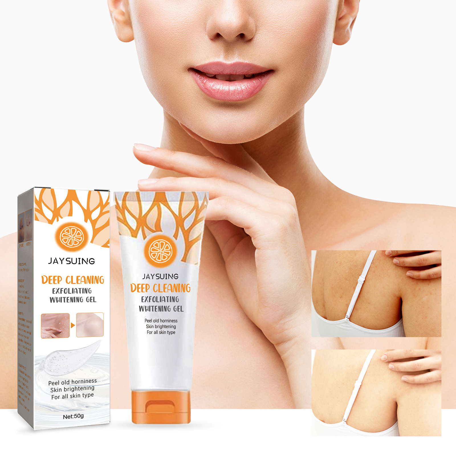 Our body exfoliating gel contains citrus extract, niacinamide, vitamin C. It can peel deeply, improve the dull skin caused by excessive keratin, improve the uneven skin color caused by melanin deposition, soften the keratin, deeply nourish, and save dry and rough skin. Its use method is very simple: clean and dry the face, take appropriate amount of gel evenly apply to the skin skin, massage in a circular motion until the cuticle softens; Rinse with clean water. Nourishes the skin, gently exfoliates, removes dirt and dead skin cells.