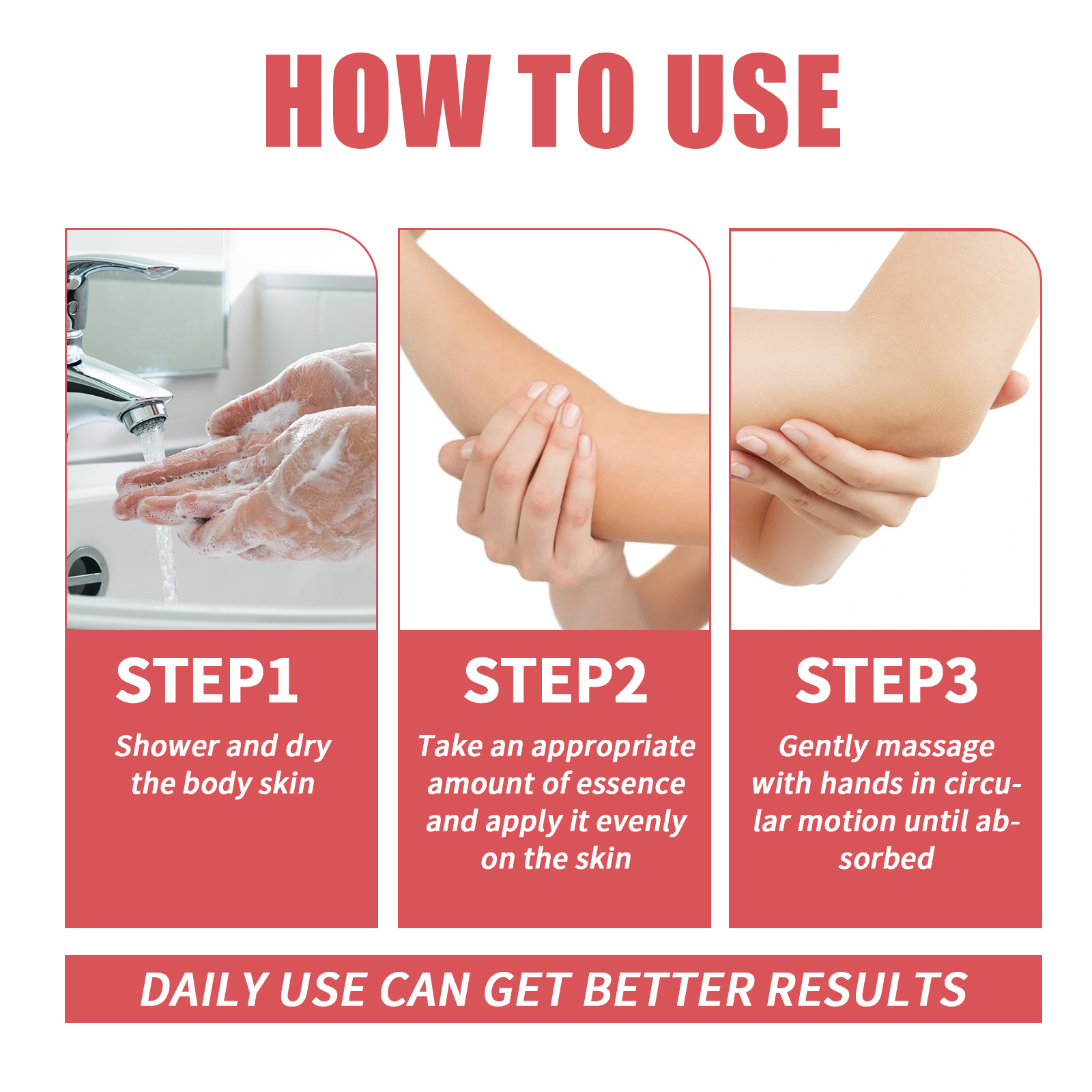 Our brightening serum contains peony root extract and sodium hyaluronate. It can lighten dark spots and uneven skin tone, make skin appear natural shine, gently exfoliate skin, make skin more tender, maintain skin acid-base balance. Its application method is very simple: shower and dry the body skin, take the appropriate amount of serum: evenly apply to the skin, gently massage with both hands until absorbed. It can also repair and moisturize the skin, resulting in a more even and glowing complexion.