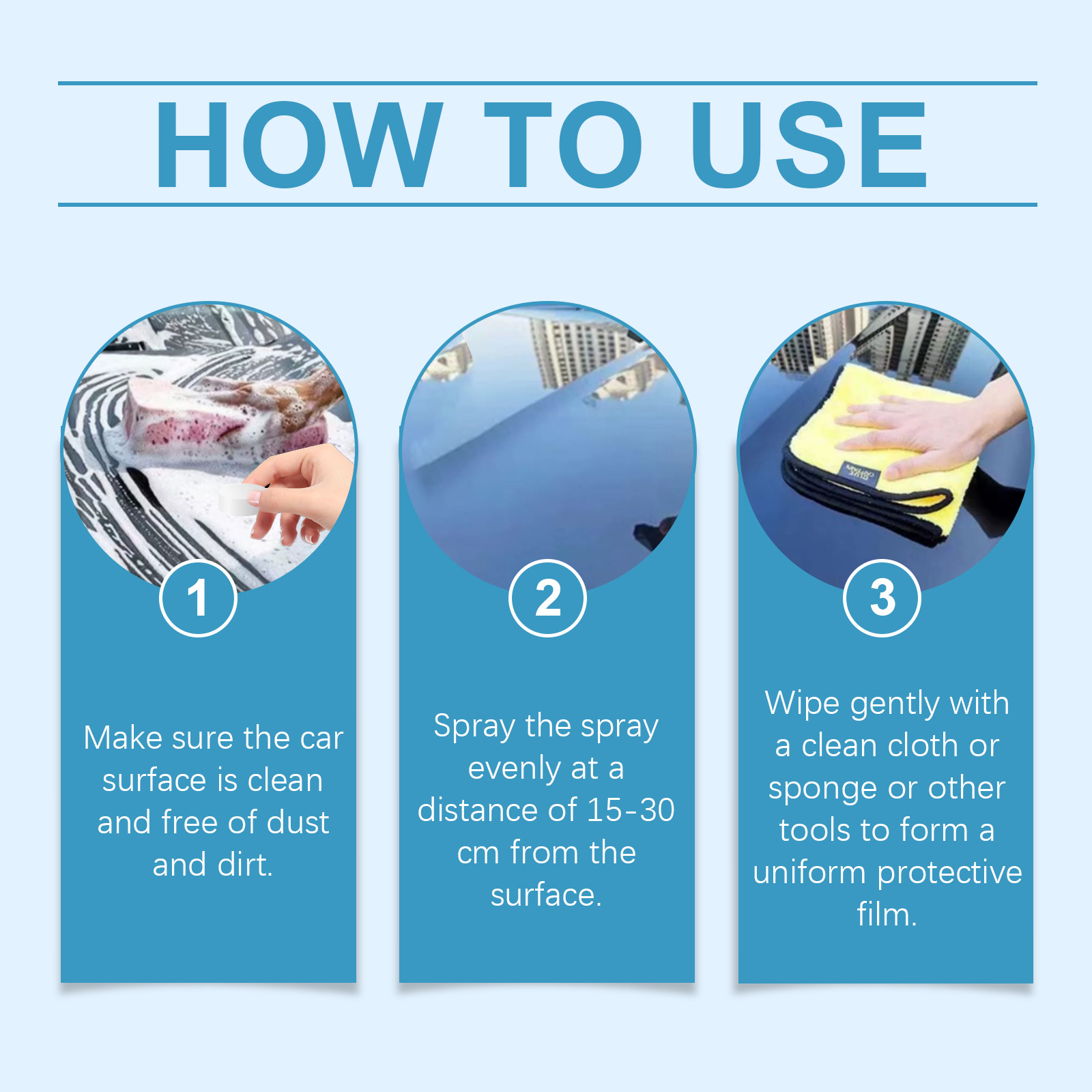Our automotive coating sprays contain isopropyl alcohol, propanediol butyl ether and lauryl ether 7. It can effectively clean the car paint, remove grease and stains. Its use method is very simple: ensure that the surface of the car is clean, no dust and dirt, spray the spray evenly at a distance of 15-30 cm from the surface, wipe gently with a clean cloth or sponge or other tools to form a protective film of the spoon. And can improve the gloss of the car paint, so that its service life is longer.