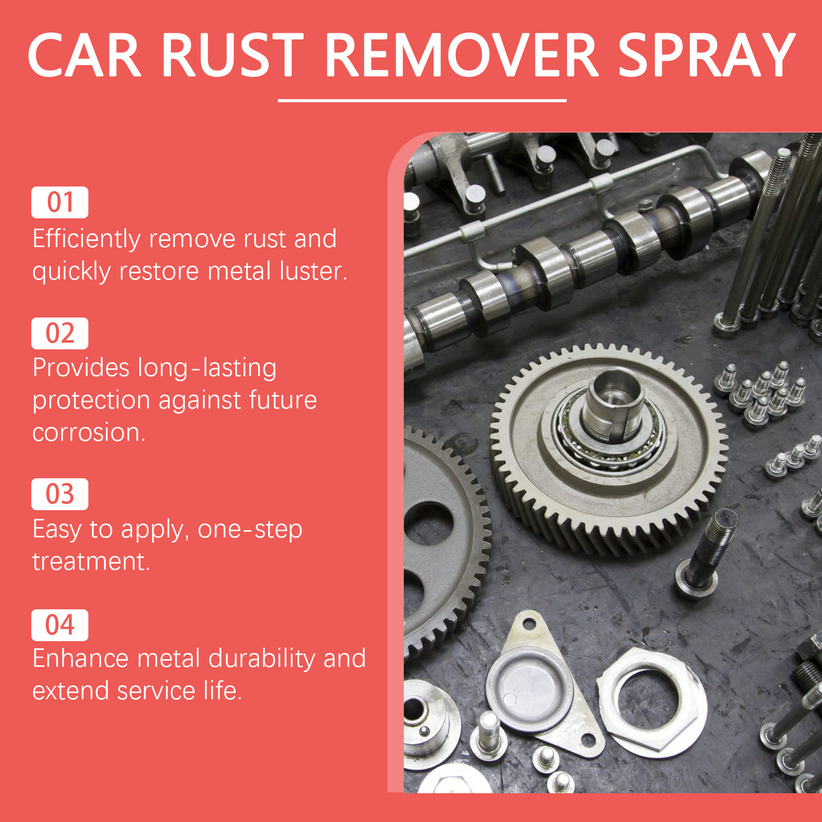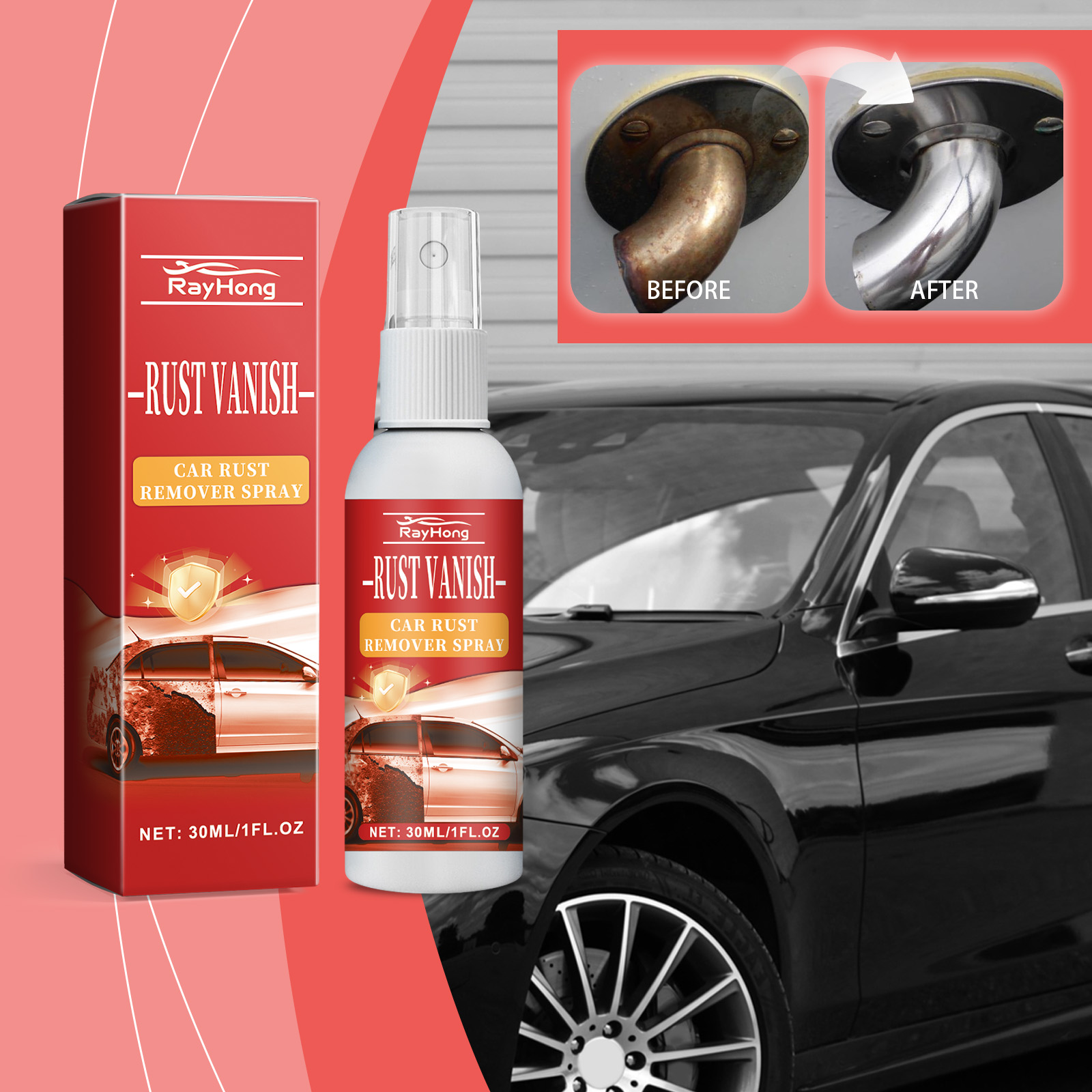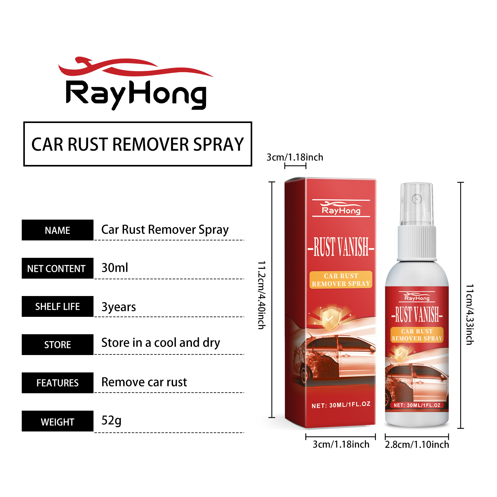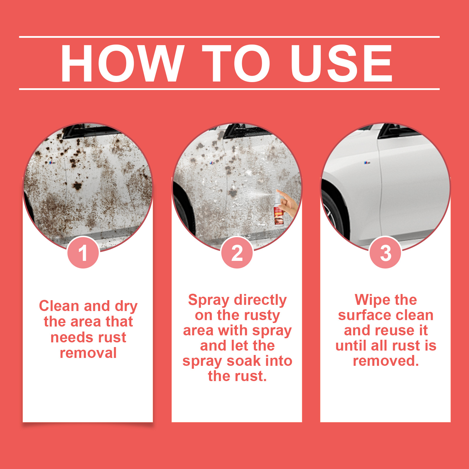 Our Car Rust Remover Spray contains citric acid, sodium carbonate, and disodium EDTA. It can quickly react with the corrosion of the metal surface, effectively remove the rust layer, restore the smoothness of the metal surface, and form a strong protective film on the metal surface, effectively isolate the air and moisture, the metal from rusting again, and extend the service life. The way to use it is simple: clean and dry the areas that need to be removed, spray the rusty area directly with a spray, let the spray dip into the rusty area, wipe the surface clean, and reuse until all the rust is removed. It can efficiently remove rust, quickly restore metal luster, provide lasting protection for future corrosion, enhance metal durability, and extend service life.
