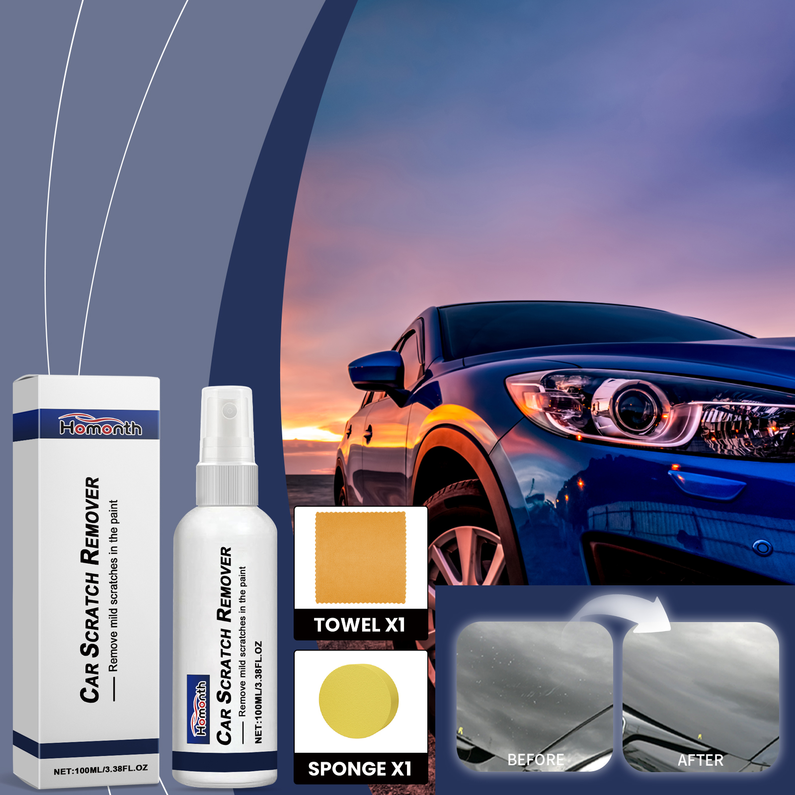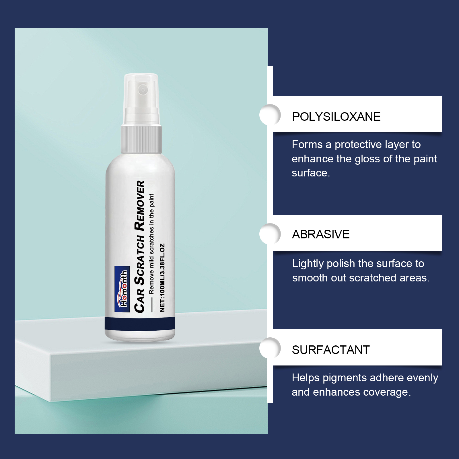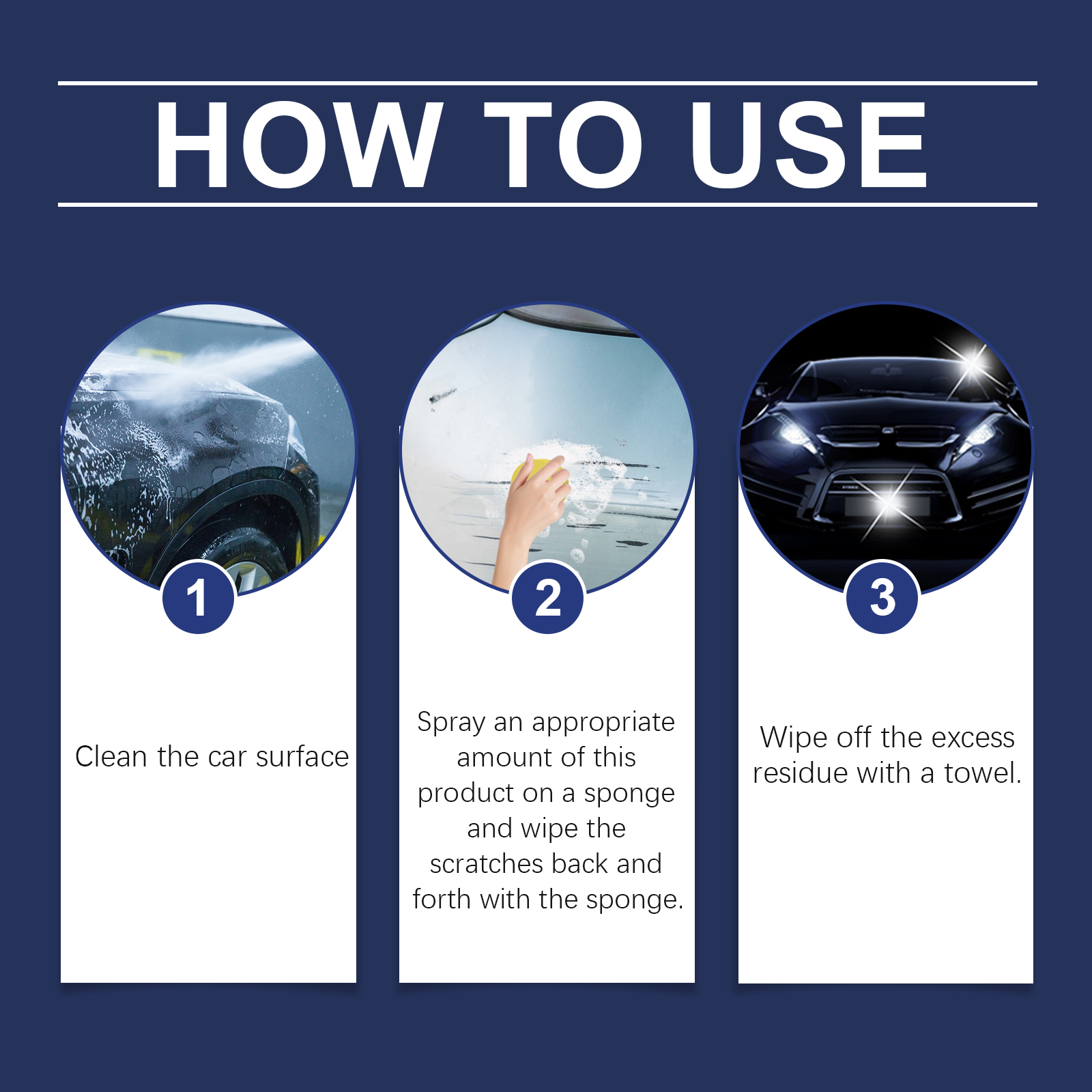 Our car scratch spray contains propylene glycol methyl ether and sodium silicate. It can not damage the original paint and keep your car safe. The way to use it is simple: clean your car. Spray the spray onto a sponge and use the sponge to evenly wipe away the scratch and restore it to its original flawless state. And easy to operate, simple to use does not require professional skills, easy to get started.