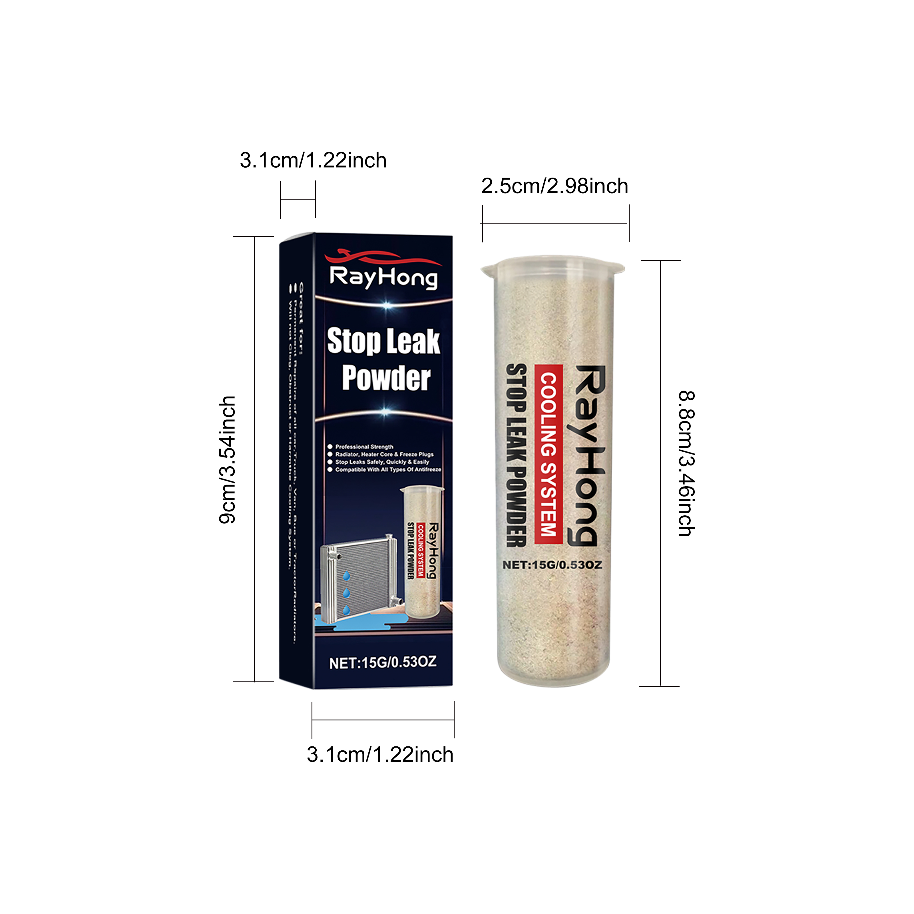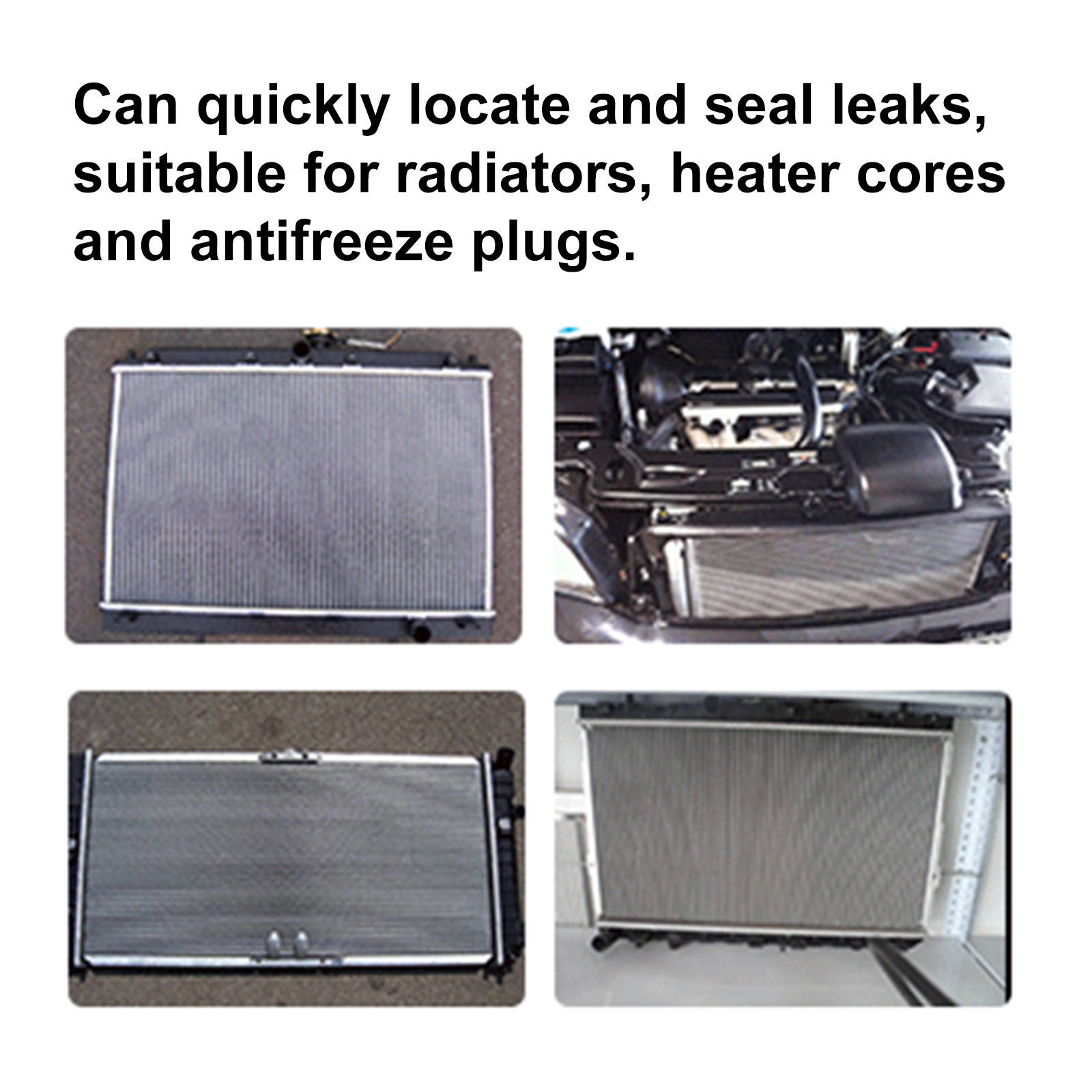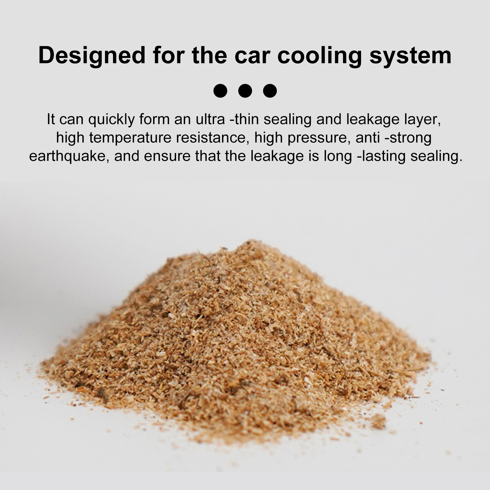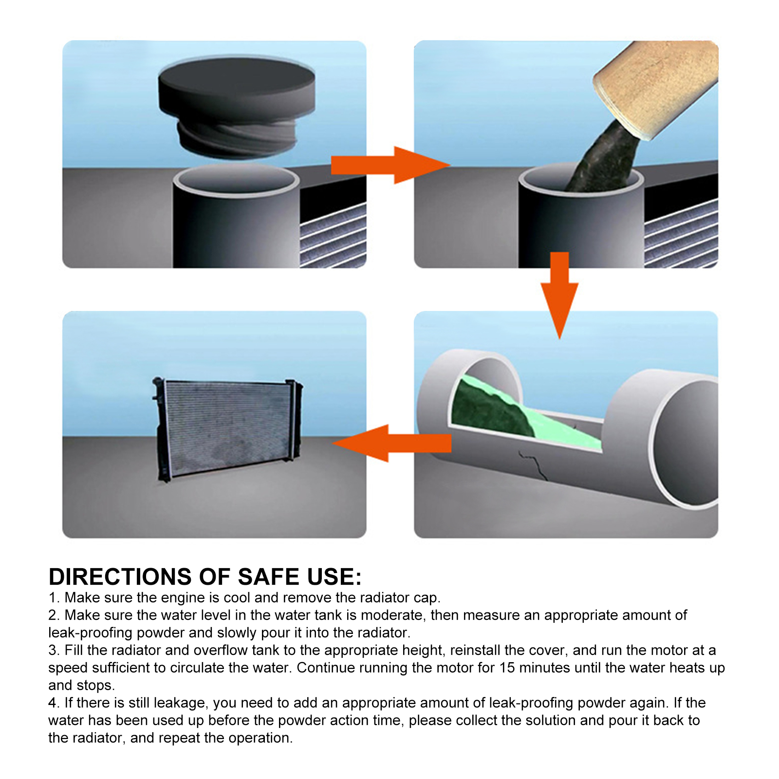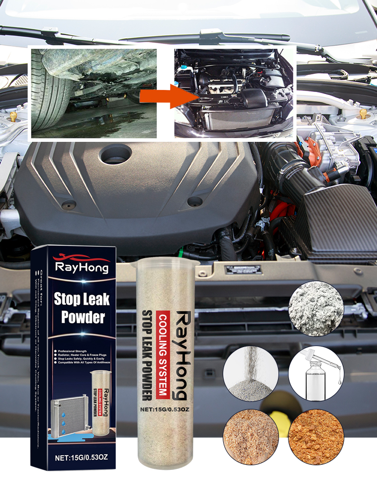Our car water tank leak repair powder contains wood powder, wood chips, metal corrosion inhibitors. It can quickly locate and seal leaks and is suitable for radiators, heater cores and anti-freeze plugs. Its use method is very simple: 1. Ensure that the engine has cooled, and remove the radiator cover. 2. Ensure that the water level in the water tank is moderate, and then amount an appropriate amount of anti-leakage powder, slowly pour into the radiator. 3. Fill the radiator and overflow tank to the appropriate height, reinstall the cover, and run the motor at sufficient speed to circulate the water. Continue running the motor for 15 minutes until the water heats up and stops. 4. If there is still leakage, re-add appropriate amount of leak-proof powder. If the water has been used before the powder action time, collect the solution and pour it back into the radiator and repeat. It can quickly form an ultra-thin sealing and leakage layer, resistant to high temperature, high pressure, strong shock, and ensure a durable seal of leakage.