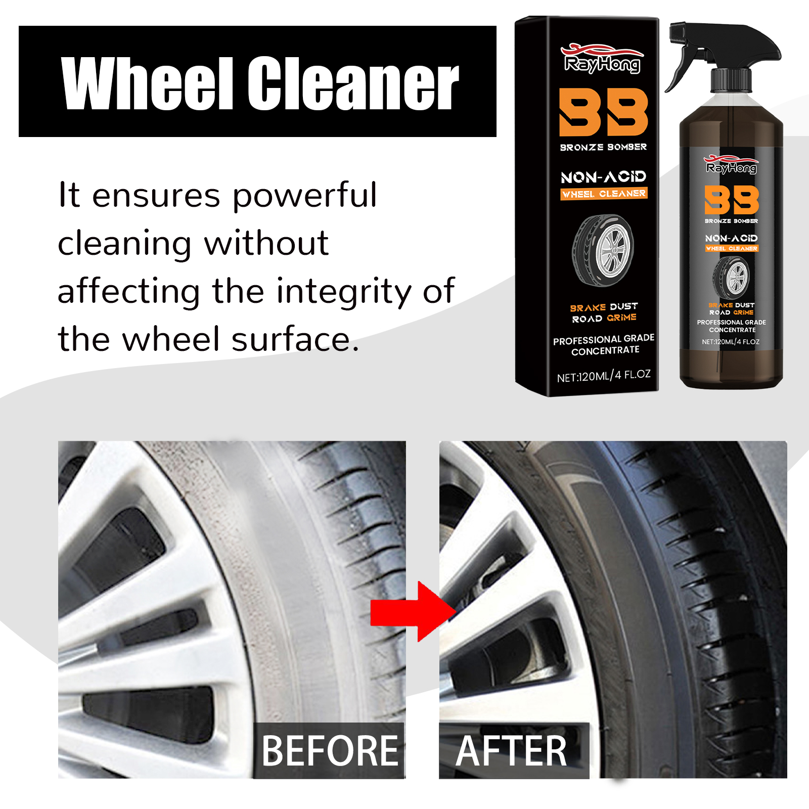 Our car wheel cleaner contains fatty alcohol polyether-9 and fatty alcohol polyether-3. It can easily resolve the dirt attached to the tires and make your wheels look brand new. Its use method is very simple: spray the product on the wheel surface that needs to be cleaned, just wipe it back and forth with a cloth. And clean the car.