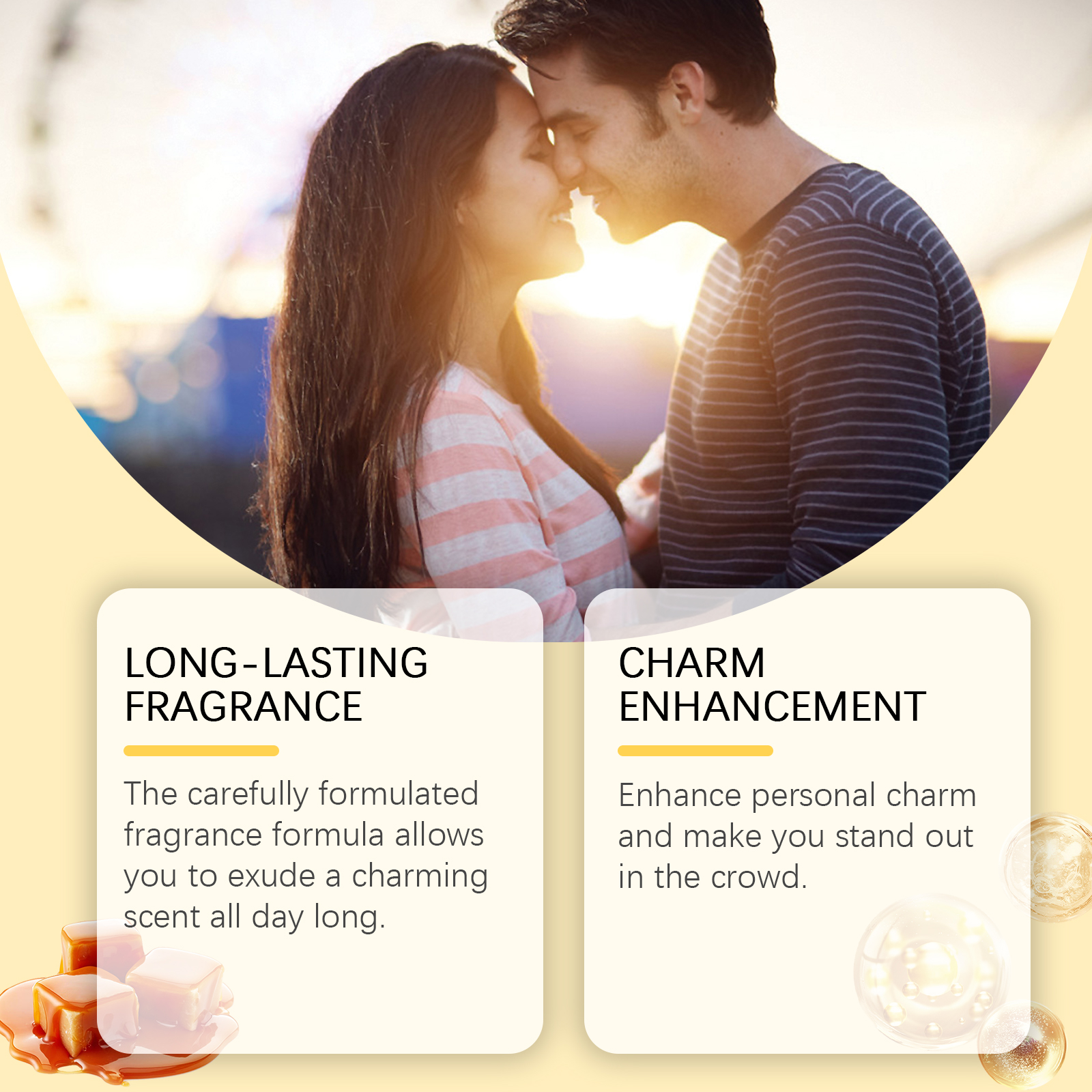 Our caramel perfume spray contains glycerin, PCA sodium. It can provide warmth and sweetness while giving the product a light color and visual appeal. It can add a harmonious fragrance to the perfume and enhance the complexity and layer of the perfume. How to use it is very simple: 1. Open the bottle cap. 2. Press the sprayer and spray the product on your neck, wrists or other parts of your body. Brings a warm, sweet aroma. Increases the lasting scent of the perfume and has a soothing and stress-relieving effect. The unique caramel aroma gives the user an elegant temperament. Suitable for all occasions to create a charming atmosphere.