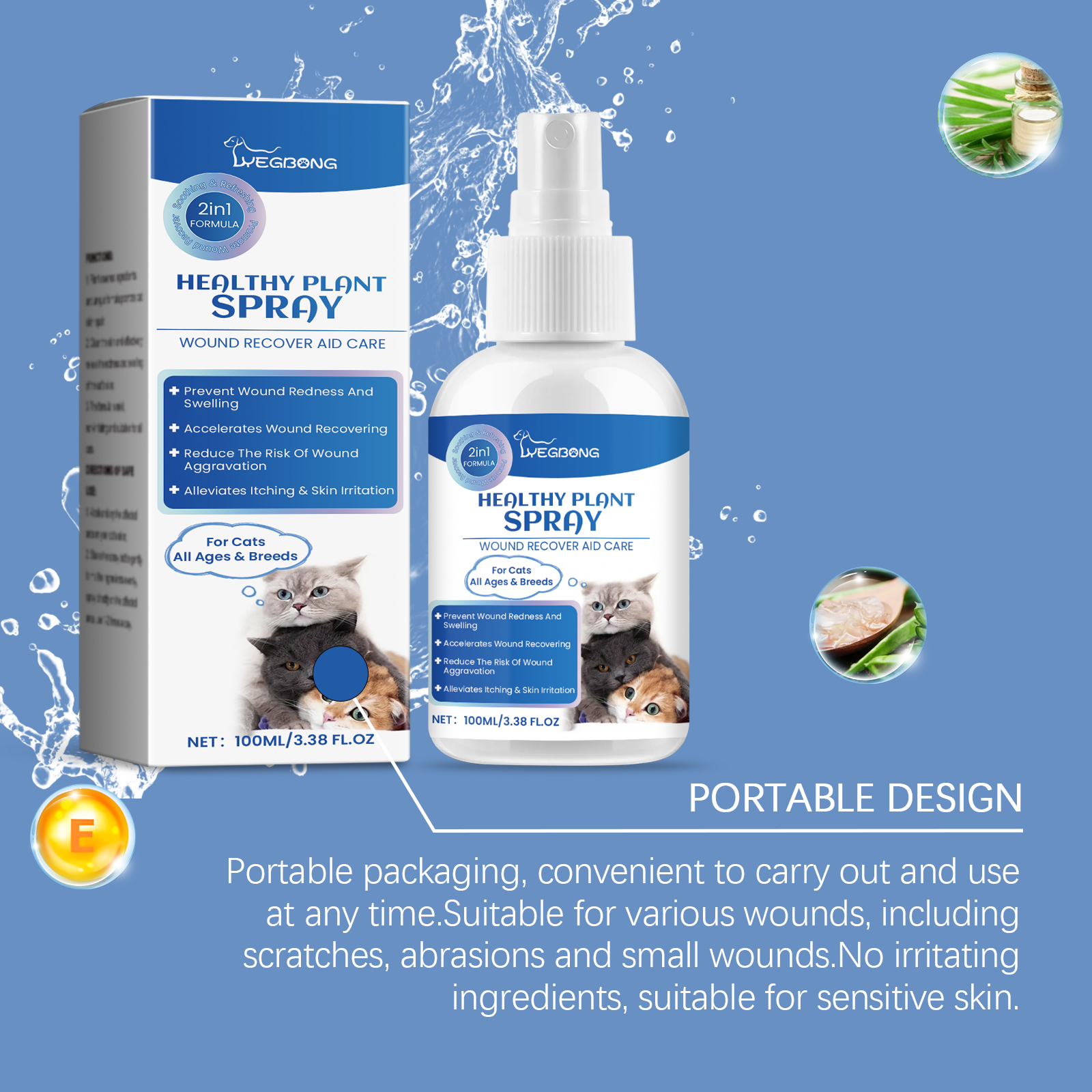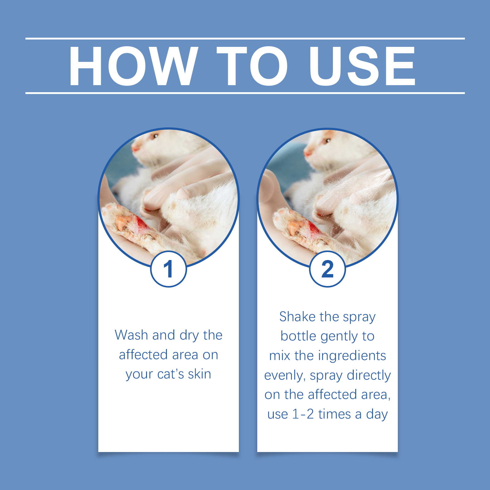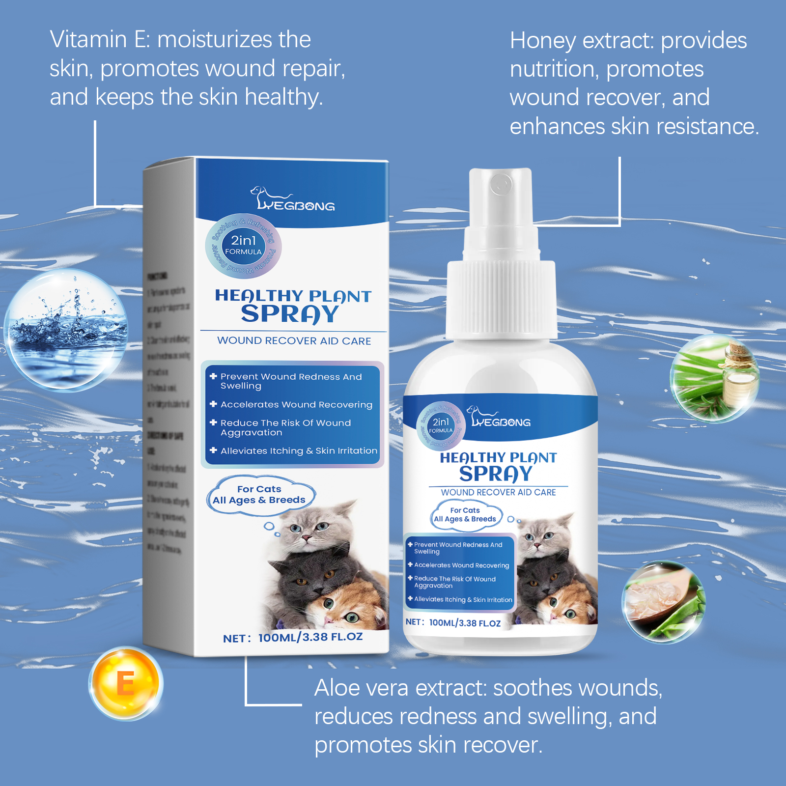 Our anti-bacterial wound care spray for cats contains vitamin E and honey extract. It can promote wound repair and reduce redness and pain. Effective in relieving allergic reactions. Its application is simple: wash and dry the affected area on your cat's skin; Gently shake the spray bottle to blend the ingredients and spray directly onto the affected area 1-2 times daily. And it can improve the cat's quality of life. Quickly soothes skin and relieves pain.