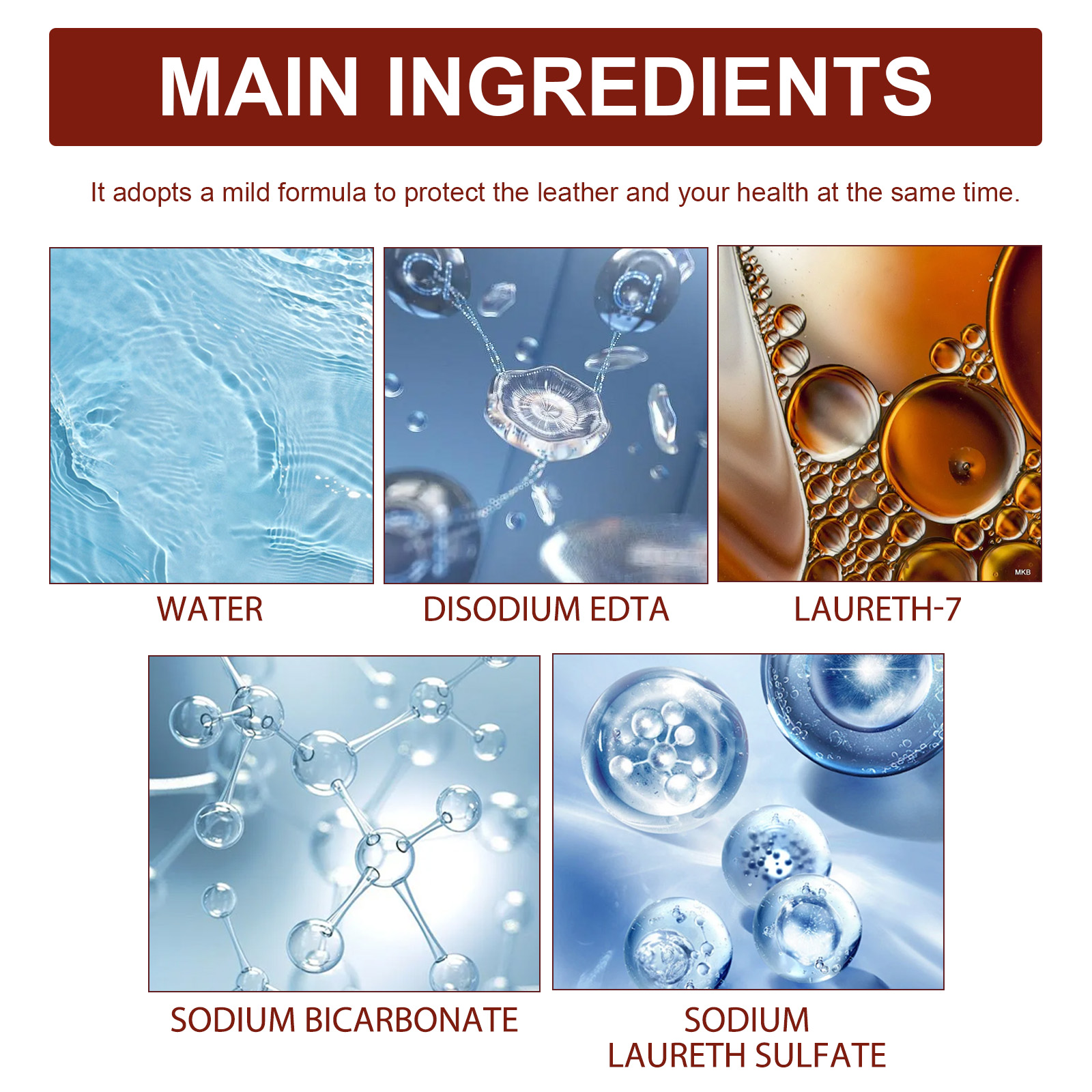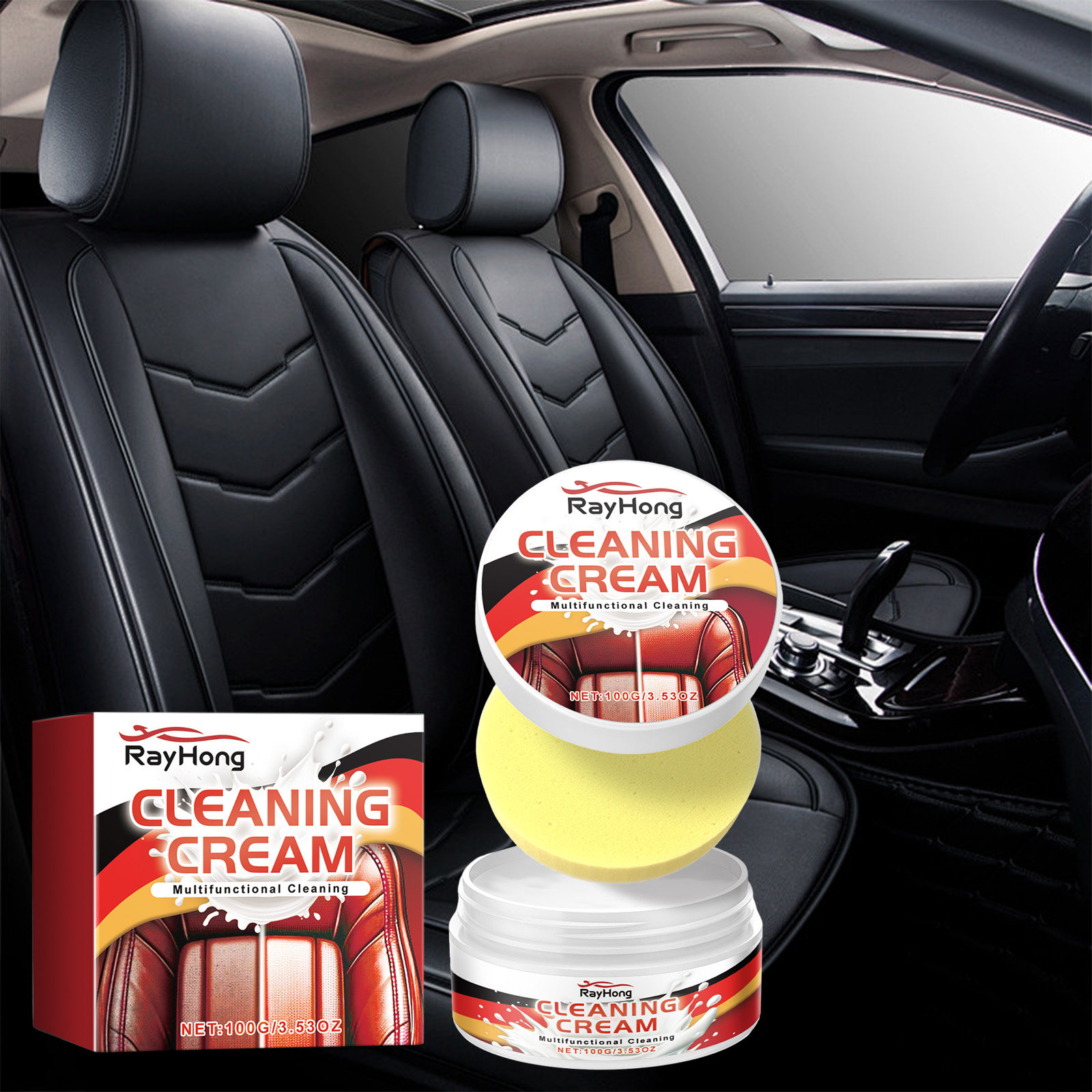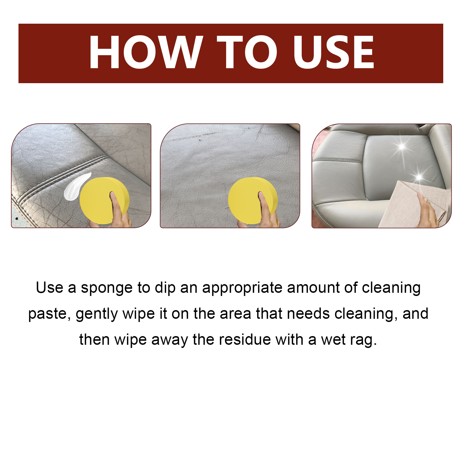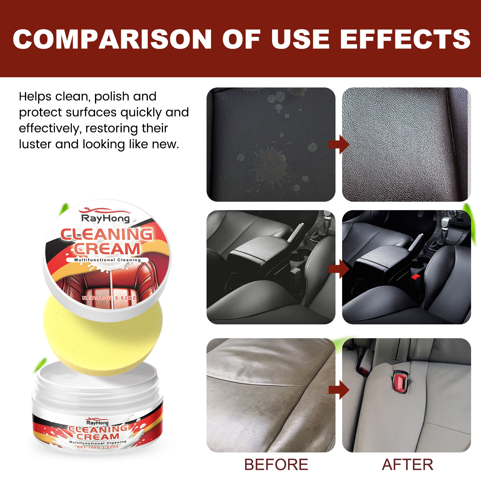 Our Cleaning Cream contains disodium EDTA, sodium bicarbonate and lauryl ether 7. It can have a deep moisturizing and protective effect on automotive leather, preventing drying, fading and aging. Its use method is very simple: use a sponge to dip an appropriate amount of cleaning paste, gently wipe on the part that needs to be cleaned, and then wipe off the residue with a wet rag. It can help clean, polish and protect surfaces quickly and efficiently, restoring their shine and looking like new.