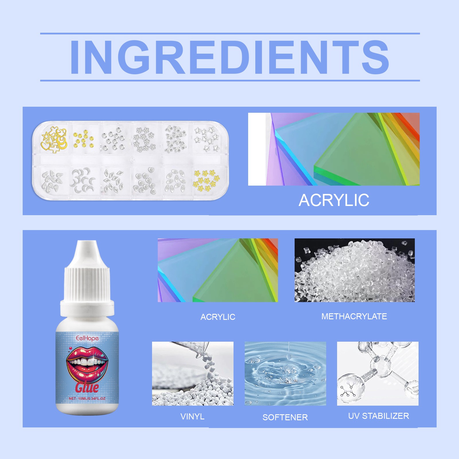Our dental beauty kits contain acrylic, acrylic and methacrylate. It can cure glue quickly. Diverse selection of gemstones, personalized tooth decoration. The glue is durable and stable, and the decorative effect is lasting. Its use is simple: 1. Open your mouth and put a tampon in your mouth; 2. Clean your teeth with cotton swabs. Open the glue, use the gem pen to remove the tooth gem, dip in the glue; 3. Stick gems on your teeth; 4. Dry the glue with ultraviolet light. Material safety, no harm to the body, create a confident smile with peace of mind. Meet the decoration needs of fast pace life. Be creative and make your smile unique.