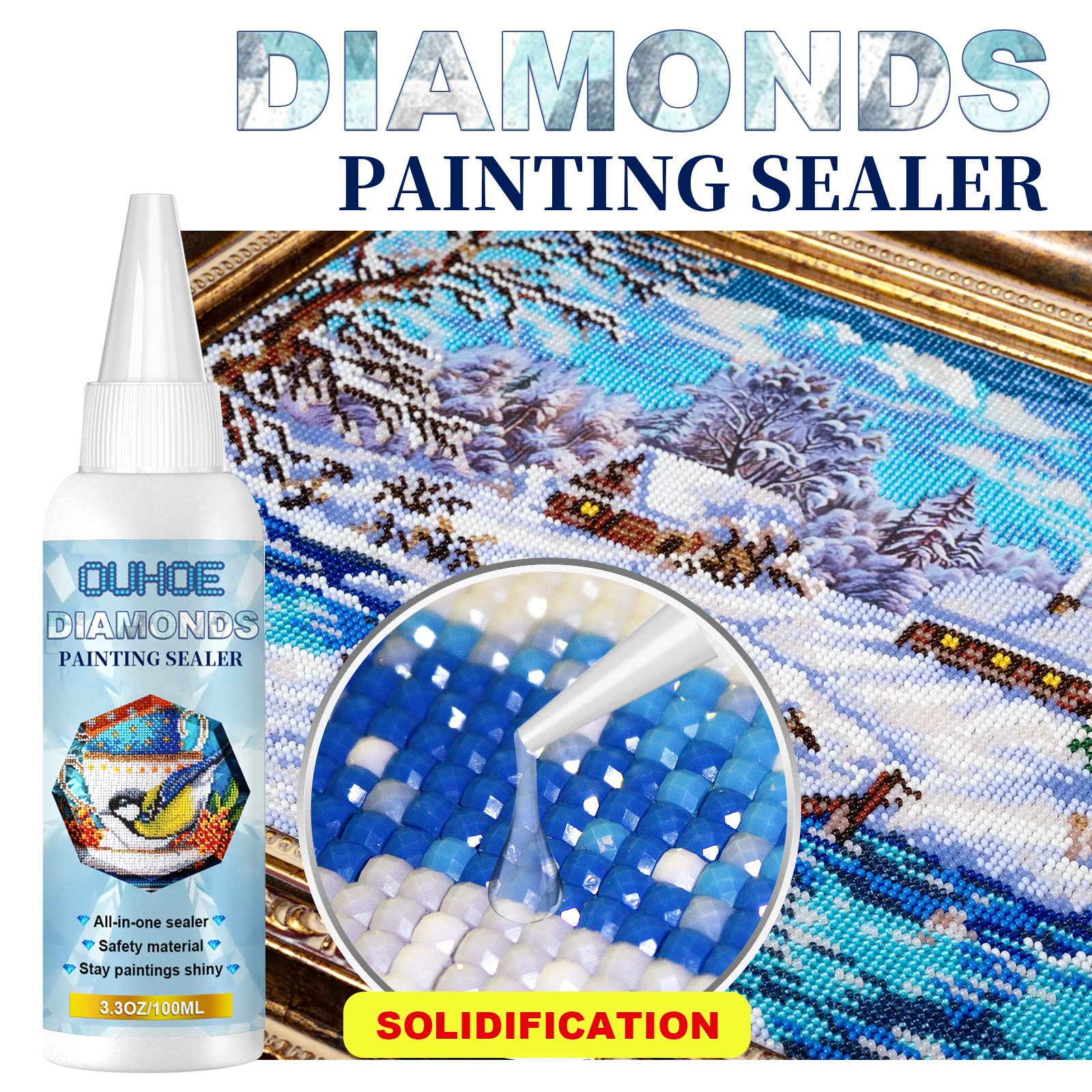 Our diamond painting sealant contains resin glue, polydimethylsiloxane, quartz. It can moisture-proof mildew, anti-oxidation and yellowing. After the surface is coated with glue, the gloss is significantly improved. Its use method is simple: according to the paint area extrusion suitable product evenly applied to the surface of the diamond paint to dry, wait at least 30 minutes for it to completely. And it can fix the diamond painting, keep the gloss and dust protection.