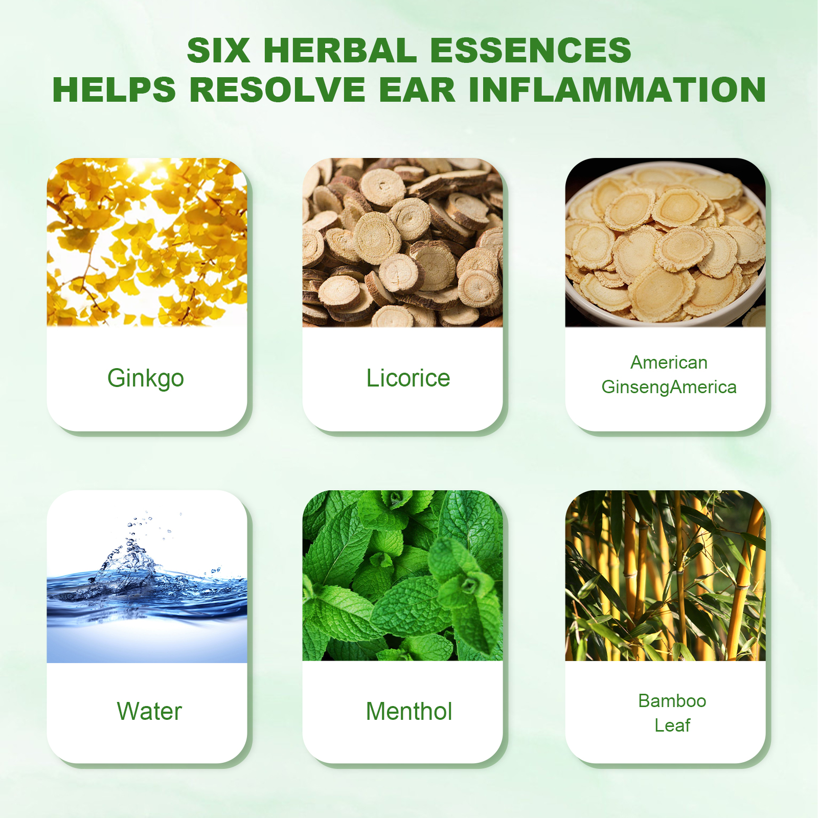 Our ear soothers contain ginkgo biloba, licorice, American ginseng. It can hearing impairment, restore hearing, tinnitus symptoms, quickly remove deep dirt and blockage in the ear, effectively ear inflammation, and pain. Its use method is very simple: first tear the package, drop 2-3 drops of this product from the side of the head to the affected area, lie on your side for 15 minutes, let the solution fully permeate, use 2-3 times a day. After use, it can ear discomfort, reduce tinnitus, improve sleep and quality of life, reduce ear noise, improve ear blood circulation, and protect ear nerves.