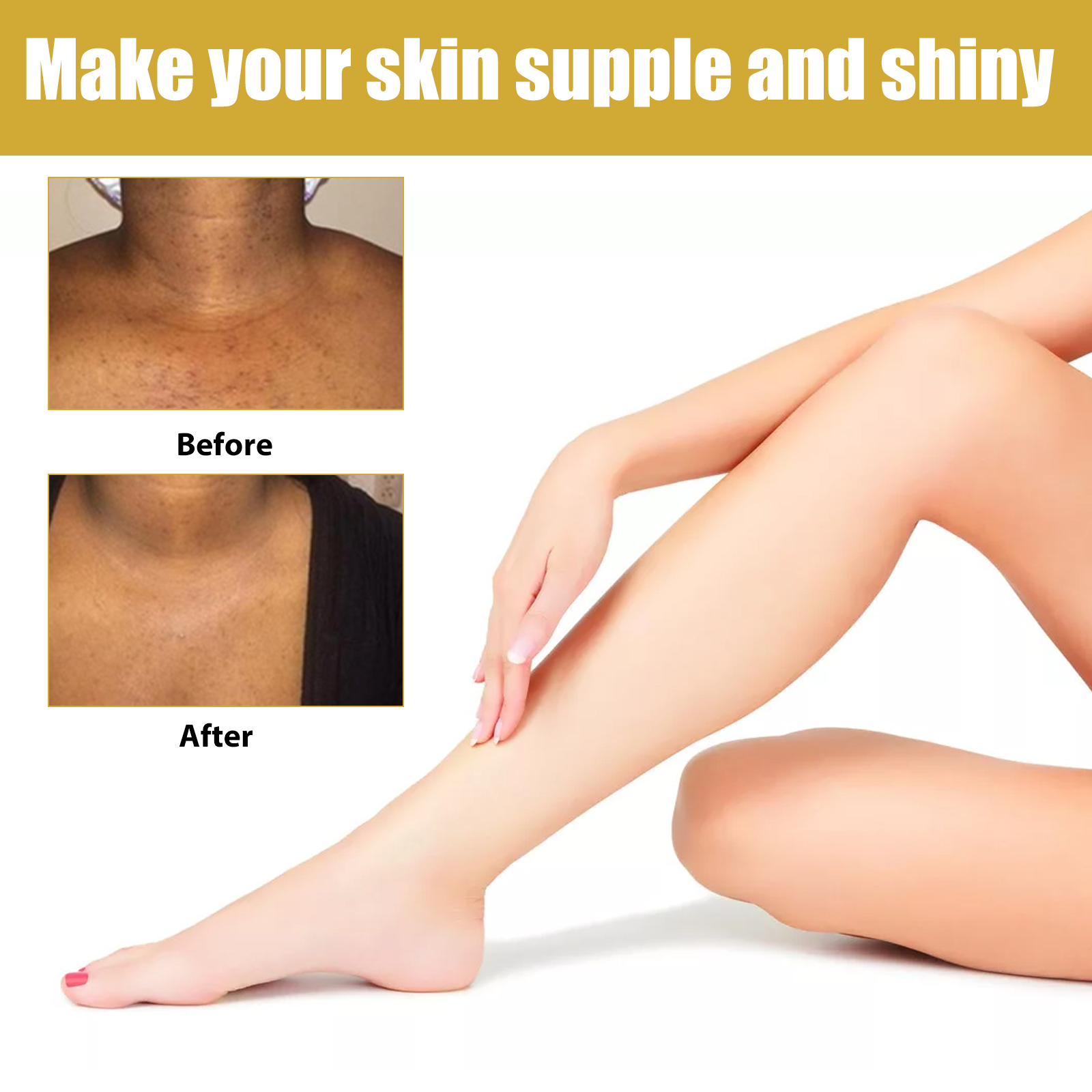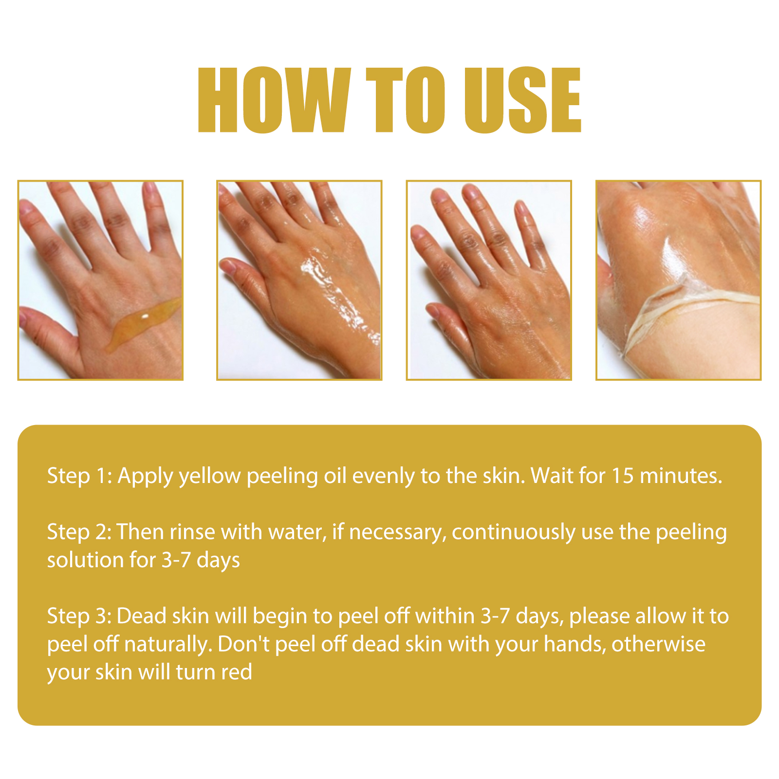 Our body care oils contain sodium hyaluronate, Asiaticum extract, licorice extract. It can remove the dead skin, cuticle and dirt of hands and feet, lighten the skin, moisturize and smooth the skin. Its use method is very simple: first of all, apply yellow peeling oil evenly on the skin, wait for 15 minutes, then rinse with water, if necessary, you can continue to use the peeling liquid for 3-7 days, dead skin will begin to peel within 3-7 days, please let it naturally peel off. Do not peel the dead skin with your hands, or the skin will turn red. After use, it penetrates deep into the skin, enhances the fullness, firmness and elasticity of the skin, cleans pores, and helps keep the skin clean and transparent.
