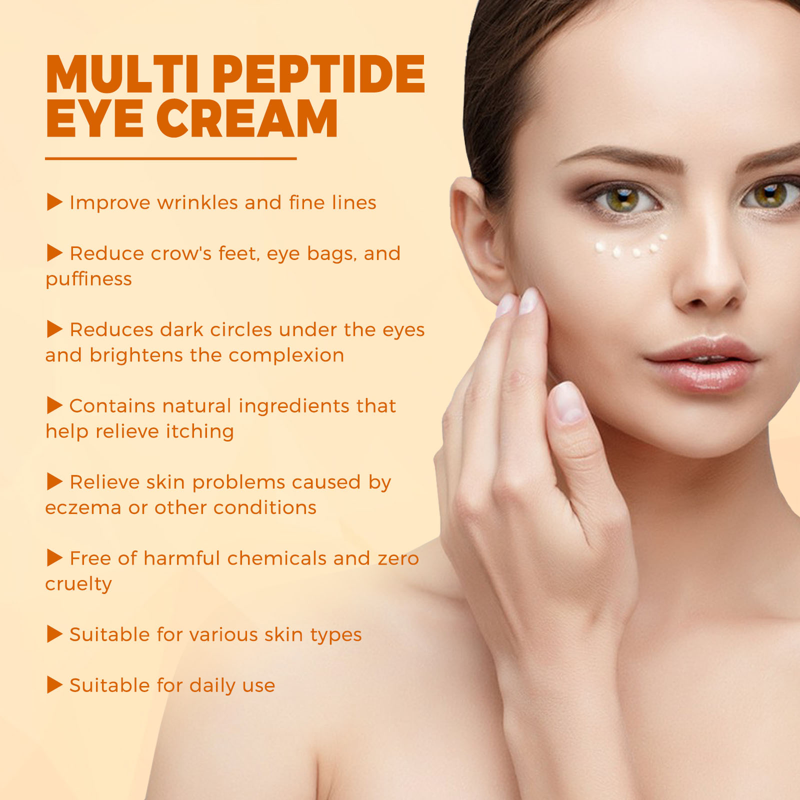 Our honey peptide eye cream contain honey, shea butter, rose oil. It can improve wrinkles and fine lines, reduce crow's feet, eye bags, and excess flesh, reduce dark circles under the eyes, brighten the skin tone, alleviate itching, alleviate skin problems caused by eczema or other diseases. Its usage is simple: After cleaning and drying the skin, apply an appropriate amount of this product evenly to the skin around the eyes, and gently massage until it is completely absorbed by the skin. Reduce eye skin problems such as dark circles, swelling, fine lines, eye bags, wrinkles, and crow's feet, making you look younger.
