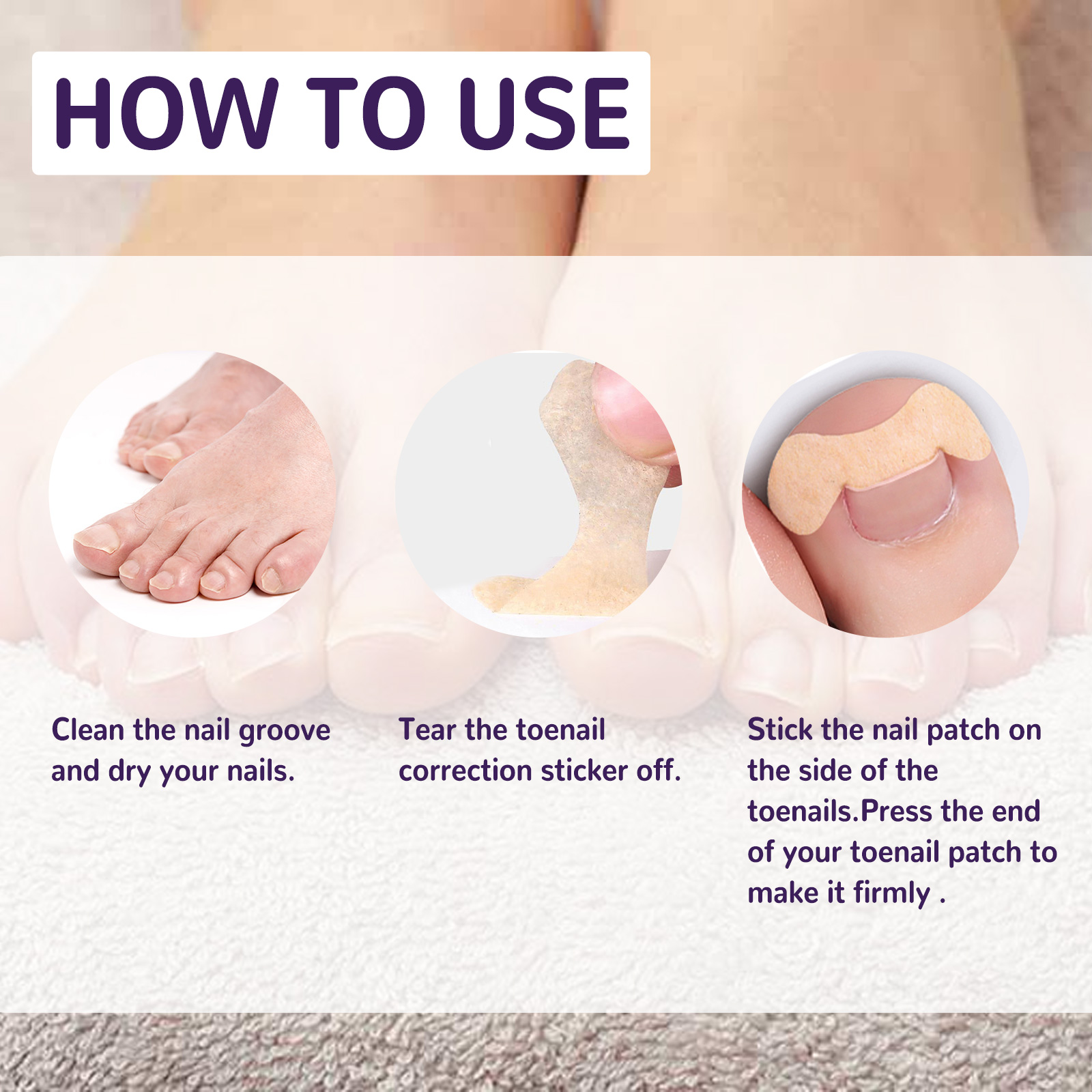 Our elastic toenail correction strips contain non-woven materials. It helps with inlaid toenail correction. The way to use it is very simple: clean the nail groove, dry the finger field. Remove the toenail correction tape and place the nail on the side of the toenail. Press down on the end of your toenail patch to make it firm. Keep our toenails healthy after use.