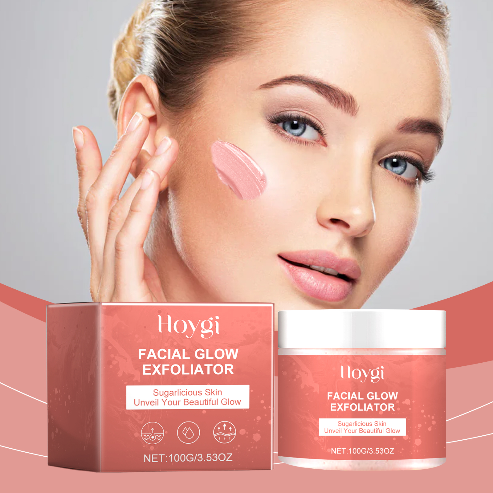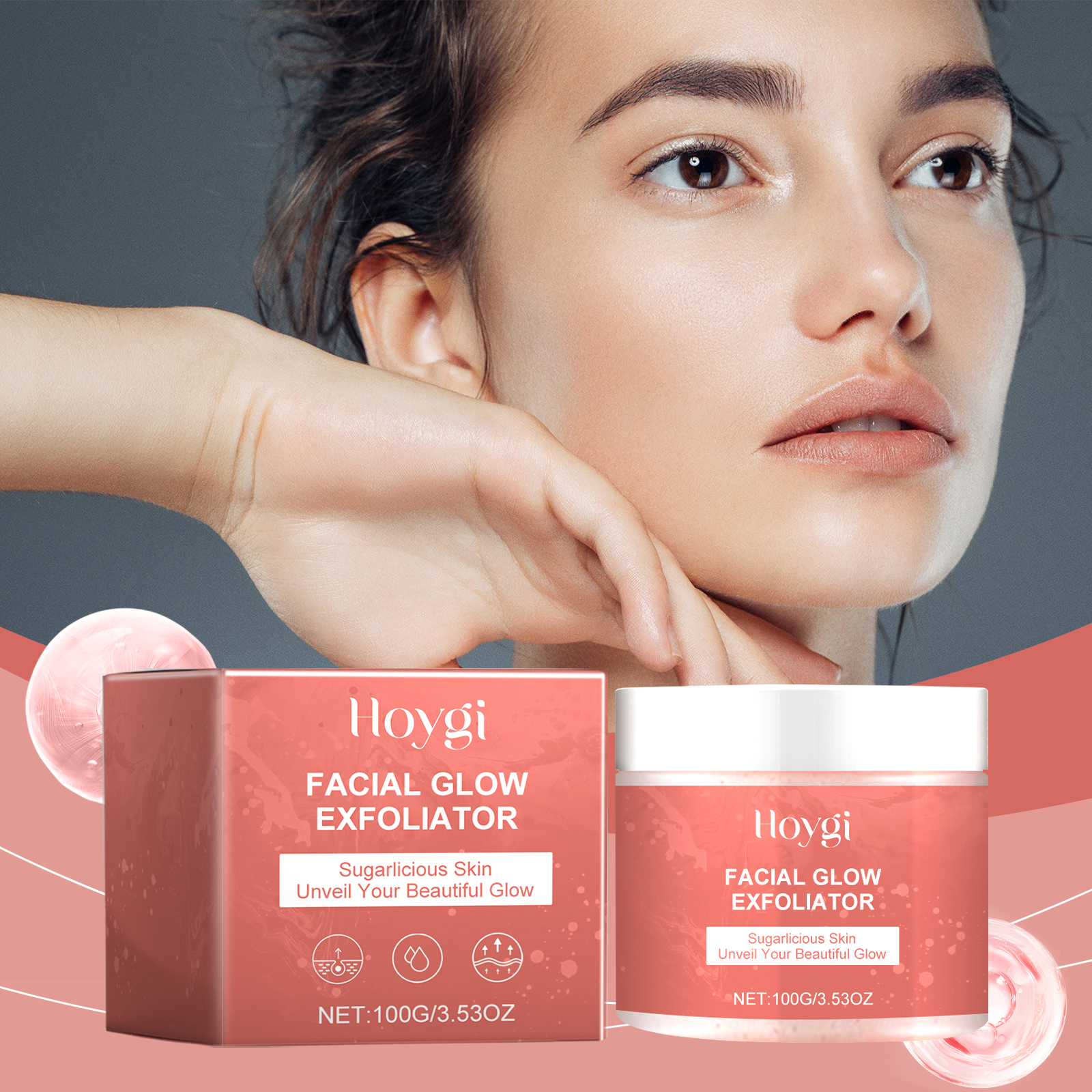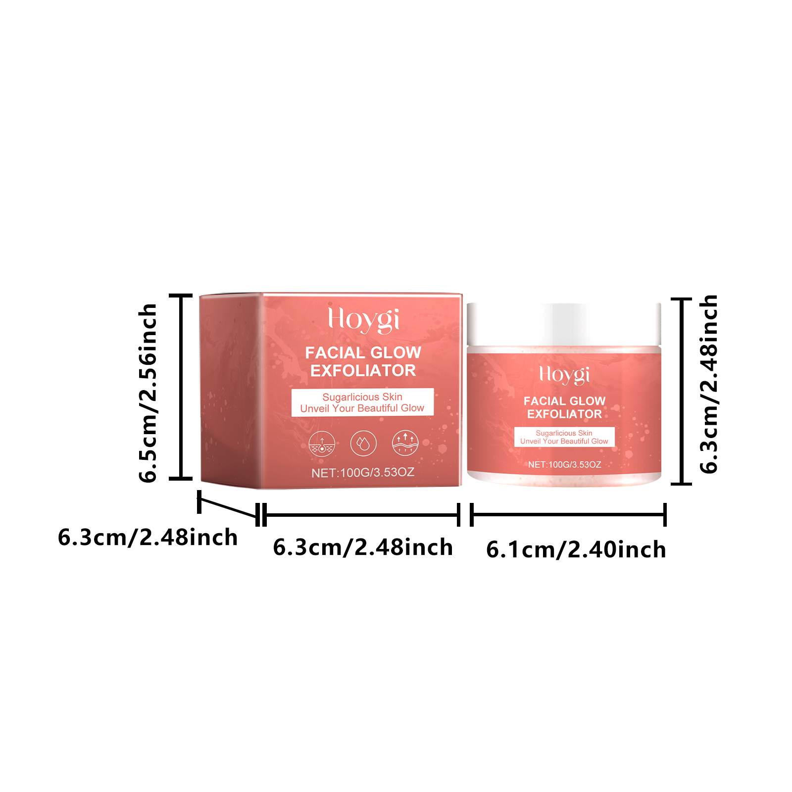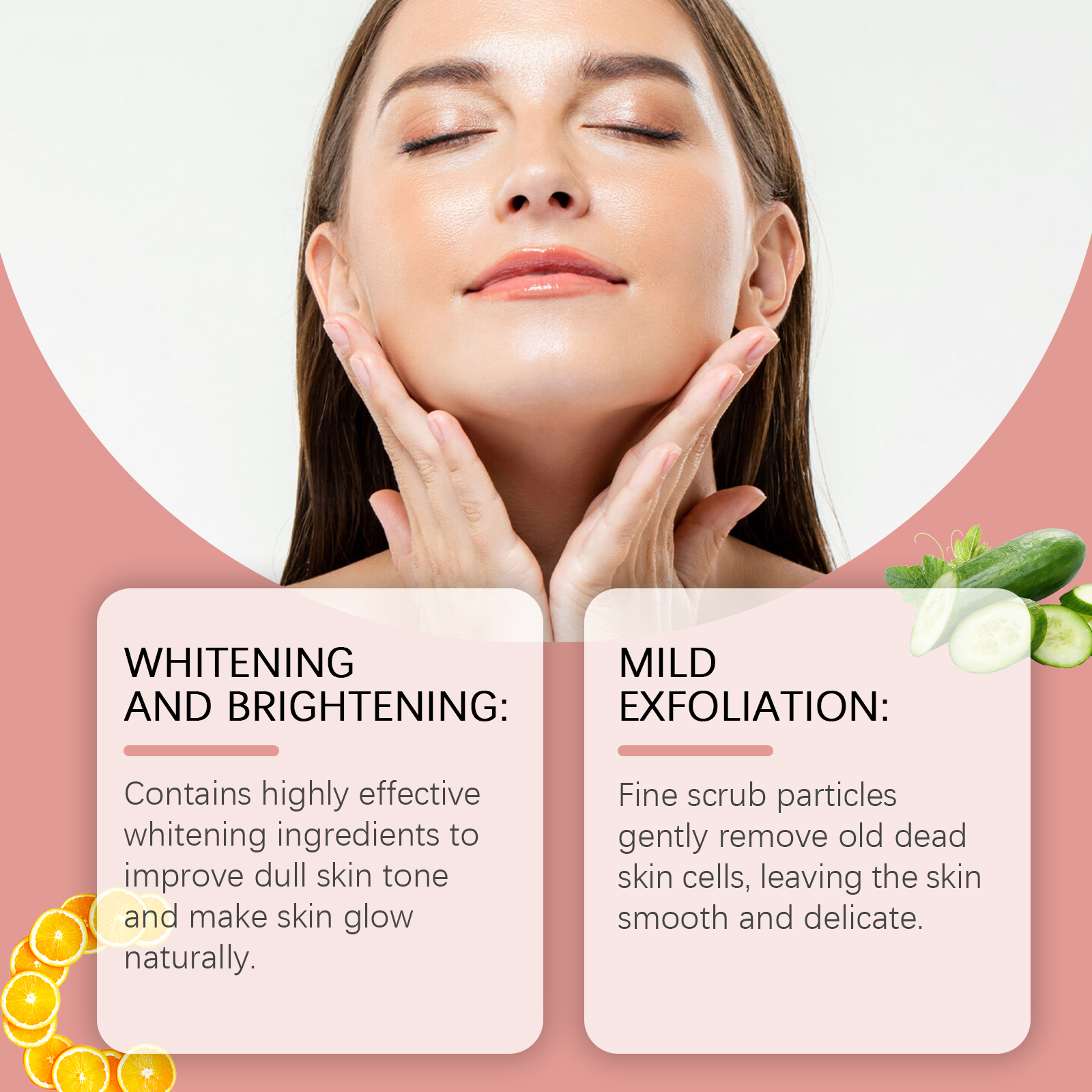 Our facial exfoliating scrub contains sucrose, cucumber extract, ascorbic acid (vitamin C). It can deeply clean pores and dirt, blackheads and pimples, and keep skin clean. Its use method is very simple: 1. Take a layer of this product wet face, scrub in circles; 2. Rinse with water, dry skin; 3. Use 2-3 times a week as needed. Facial exfoliating scrub contains highly effective whitening ingredients to improve dull skin tones and leave skin glowing naturally. Fine scrub particles gently remove old dead skin cells, leaving skin smooth and delicate.