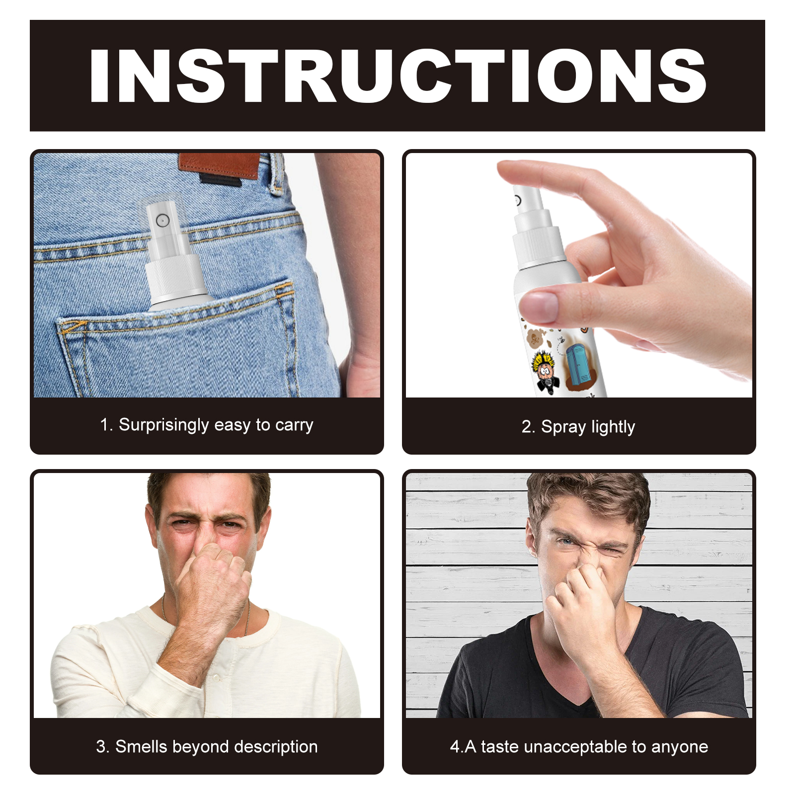 Our stink fart spray contains fermented soy, fermented houttuynia. It can hide bottles, perfect pranks, smelly, effective, effective props in pranks. The way to use it is simple: 1. Surprisingly easy to carry; 2. Spray wine lightly; 3. The taste is indescribable; 4. Smells that are unacceptable to anyone. And can provide instant impact. And it can be smelly and lasting.