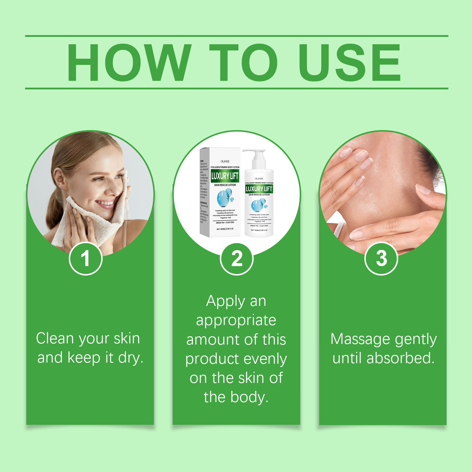 Our firming body lotion contains glycerin, vitamin E (tocopherol). It can stimulate skin vitality, give skin shine, enhance skin elasticity. Its use is simple: clean skin, keep skin dry; Apply appropriate amount of the product evenly on the skin of the body; Gently massage until absorbed. And it can resist the invasion of the external environment, making the skin healthier and brighter.