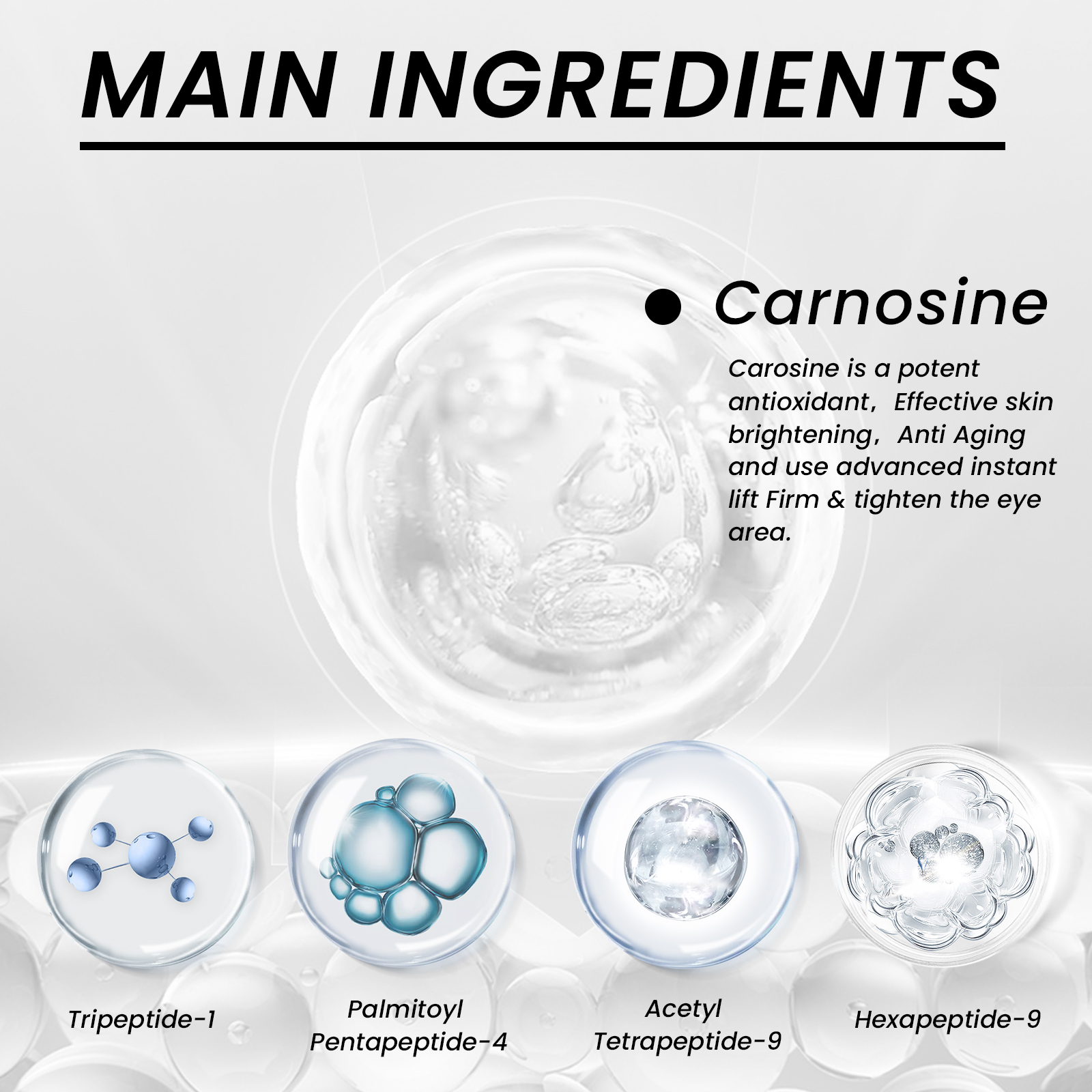 Our firming eye cream contains carnosine, tripeptide-1, palmitoyl pentapeptide-4. It can bring soothing moisture to your dry skin. Experience radiant, dense skin hydration for a new glow. Its application method is very simple: before use, please clean and dry your face, apply appropriate amount of this product to the eyes, gently massage until absorbed. Quickly remove bags under the eyes, tighten the delicate skin around the eyes, smooth crow's feet, fade dark circles, puffiness, fine lines