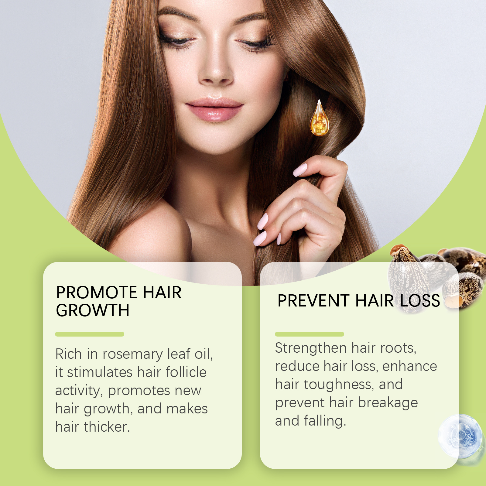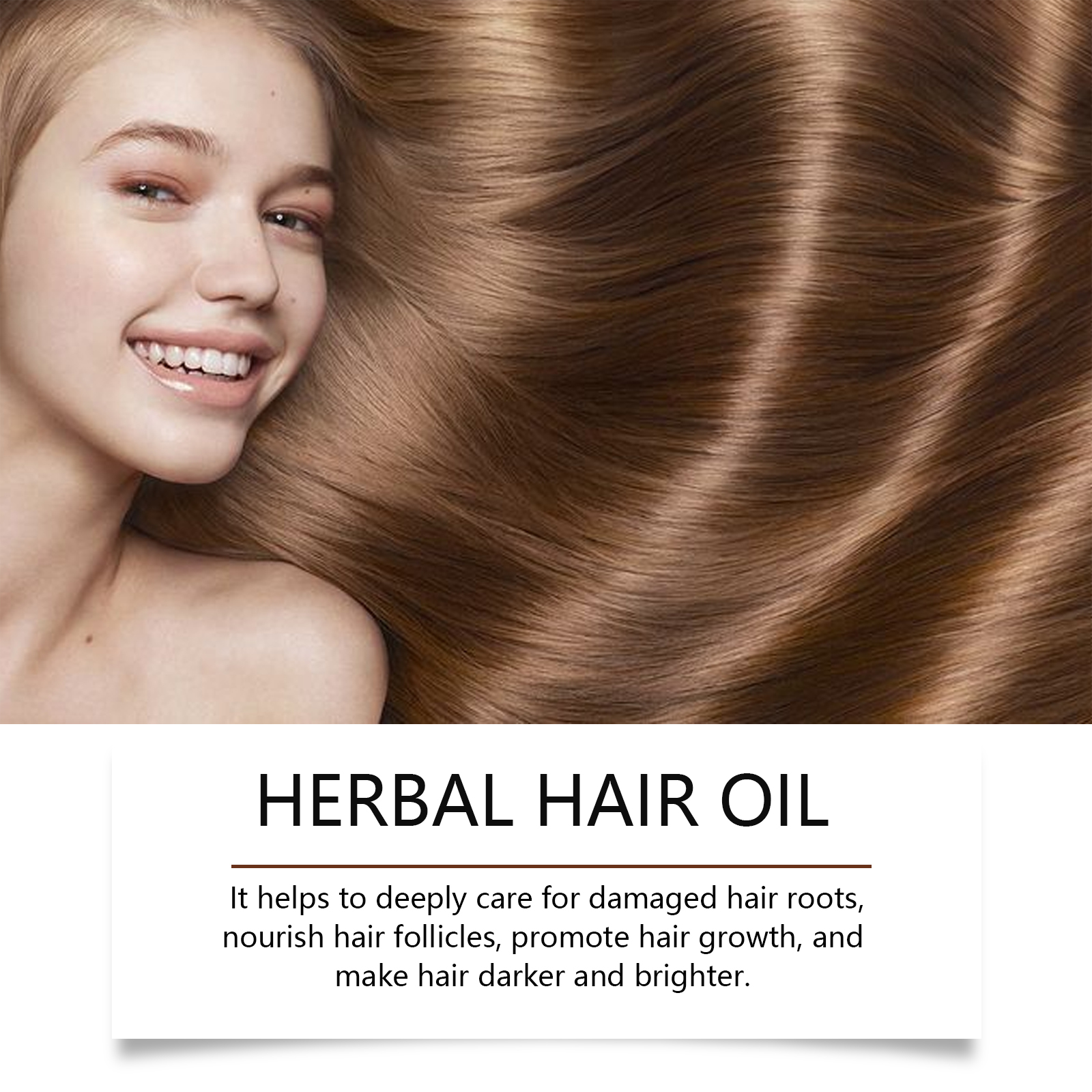 Our herbal hair oil contains rosemary leaf oil, castor seed oil, purslane extract. It can stimulate hair follicle activity, promote new hair growth, and make hair thicker. The way to use it is simple: clean your hair and scalp and dry them. Apply appropriate amount of this product evenly to the scalp and gently massage to promote better absorption. Wash off after at least 2 hours or leave overnight. Use 3 times a week to help nourish hair and restore shine. And it can strengthen the hair root, reduce hair loss, enhance hair toughness, and prevent hair breakage and loss.