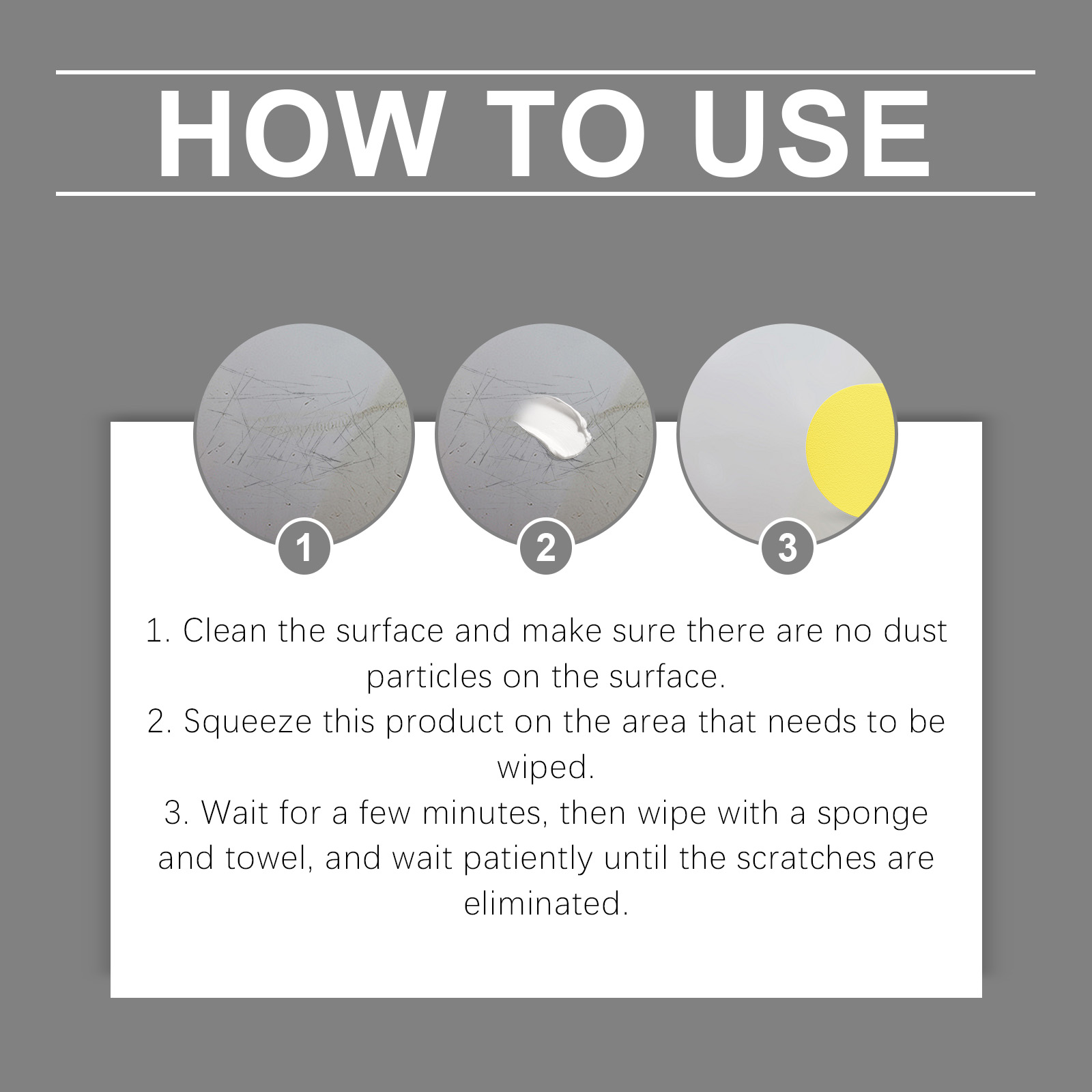 Our car scratch wax finish solution contains calcium carbonate and glycerin. It can quickly repair scratches and defects in the paint of the car, making the body look new and restore the original shine. Its use method is very simple: 1. Clean the surface to ensure that there are no dust particles on the surface. 2. Squeeze the product on the part that needs to be wiped. 3. Wait a few minutes, then wipe with a sponge and towel and wait patiently until the scratch is gone. And can completely remove all kinds of stubborn stains on the surface of the car, restore the bright color of the car paint.
