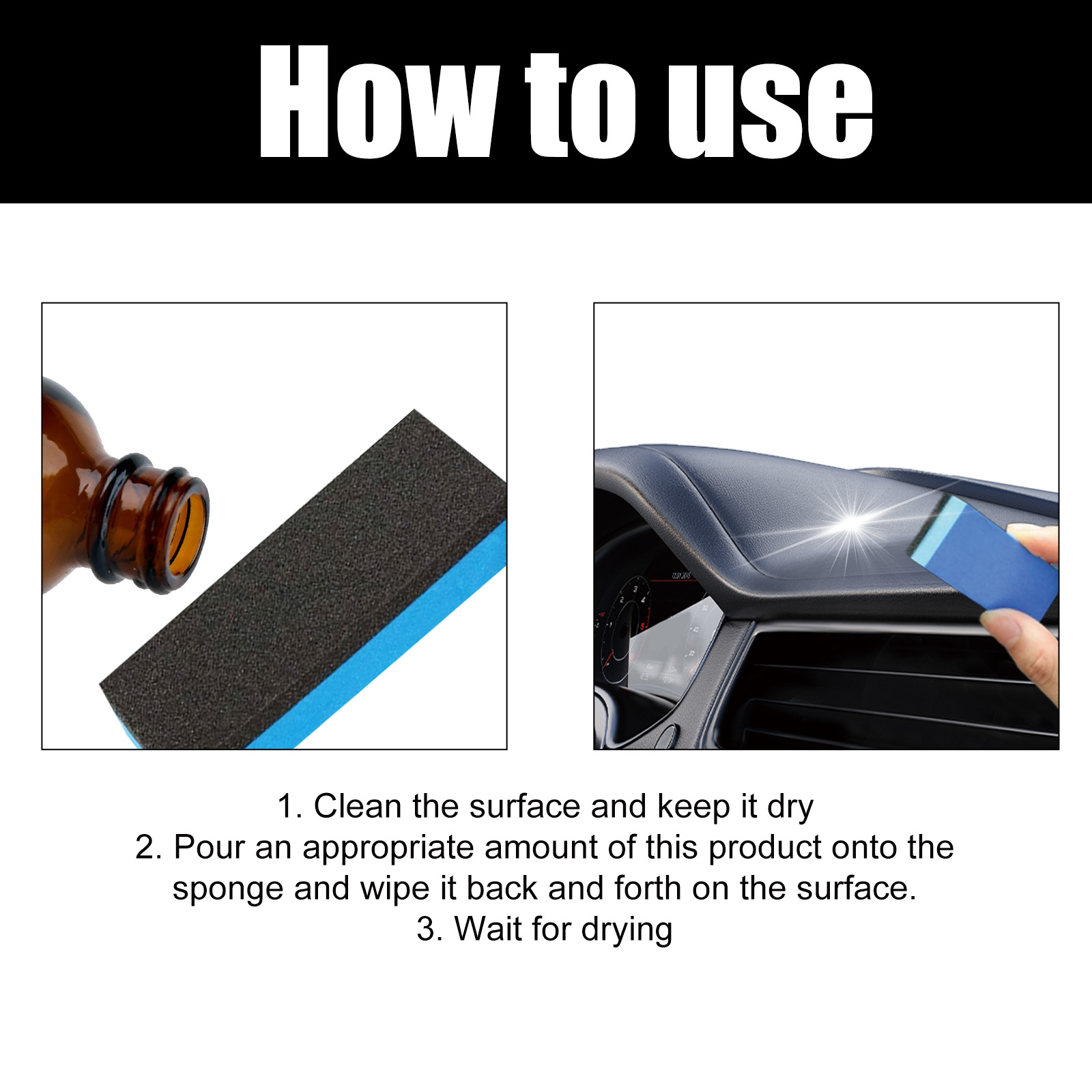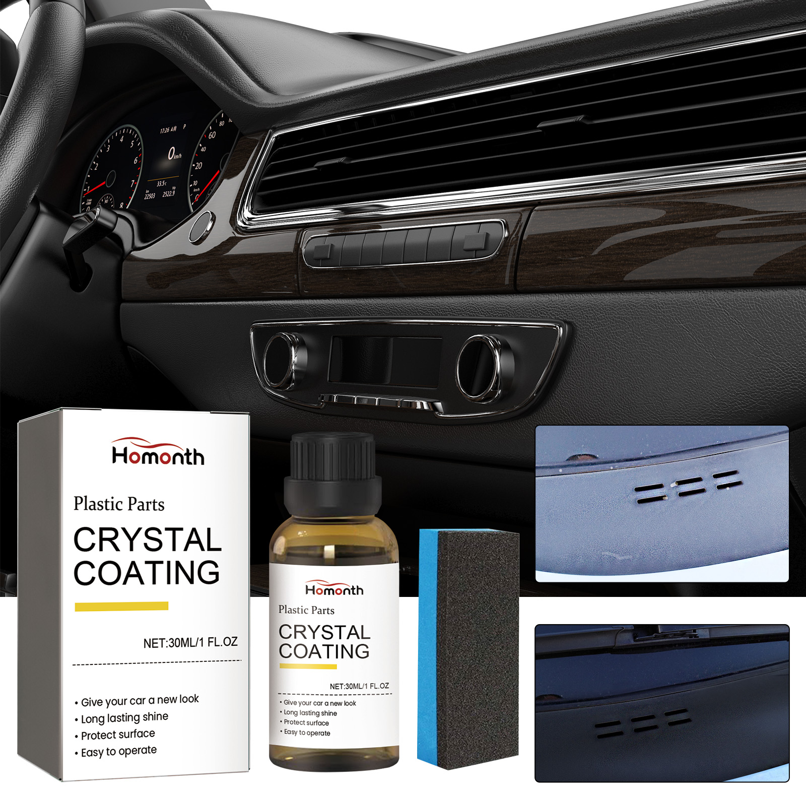Our Plastic Parts Crystal Coating contains disodium EDTA, sodium bicarbonate, lauryl ether 7. It can effectively remove surface oil, dust, fingerprints and stains, form an invisible coating on the surface, protect the surface, prevent fading, cracking and wear, and make the dull car interior sparkling. Its use method is very simple: clean the surface and keep dry, pour the appropriate amount of this product on the sponge, wipe back and forth on the surface, wait for dry. Internal scratches and defects can be refurbished to improve the overall aesthetics of the interior.