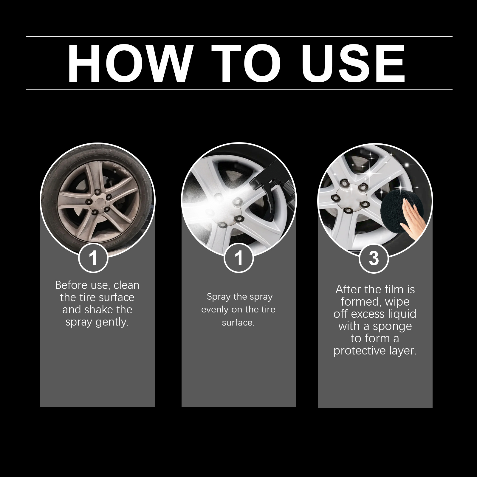 Our tire gloss spray contains polysiloxane and carnauba wax. It can quickly restore the shine to the tires and give the car a new look. Its application is simple: before use, clean the tire surface and gently shake the spray. Apply the spray evenly to the tire surface. Once the film has formed, sponge away the excess liquid to form a protective layer. It also provides a moist sheen to the tires and rims, ensuring a long-lasting visual effect.