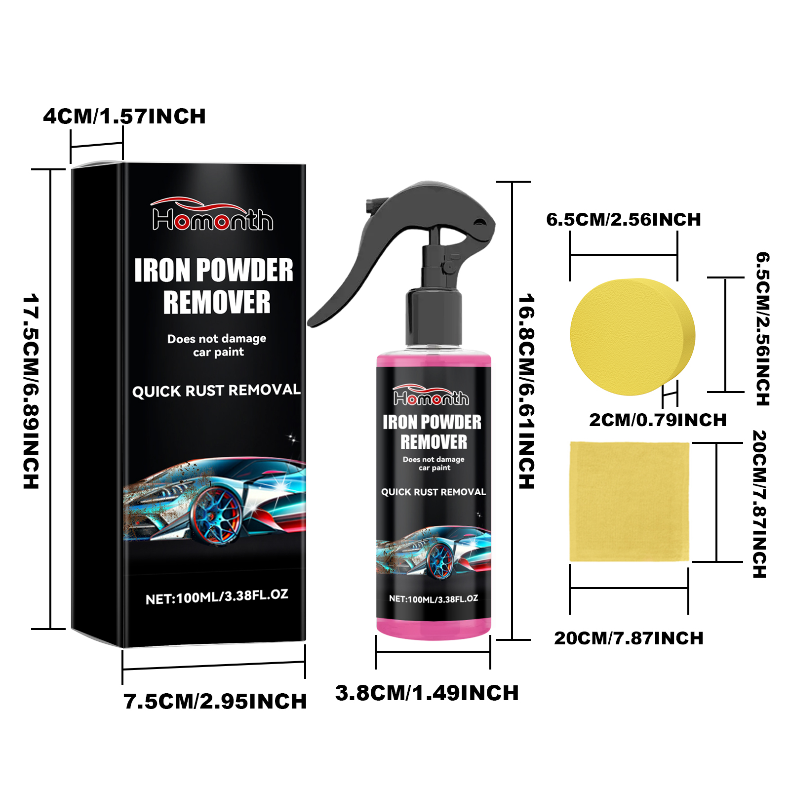 Our Iron Powder Remover contains citric acid, sodium carbonate, and disodium EDTA. It can effectively remove iron powder rust spots and other metal particles on the surface of the car, provide a certain protective layer for the surface of the car paint, and reduce the adhesion of stains in the future. Its use method is very simple: first rinse off the sediment with clean water, then spray the product on the car, scrub repeatedly with a sponge to promote the dissolution of the stain, rinse the stain with clean water, and finally dry it with a towel. It can remove iron powder at the same time, but also provide a certain protective layer for the surface of the car paint, not only for cars, but also for motorcycles, bicycles, boats and other vehicles.