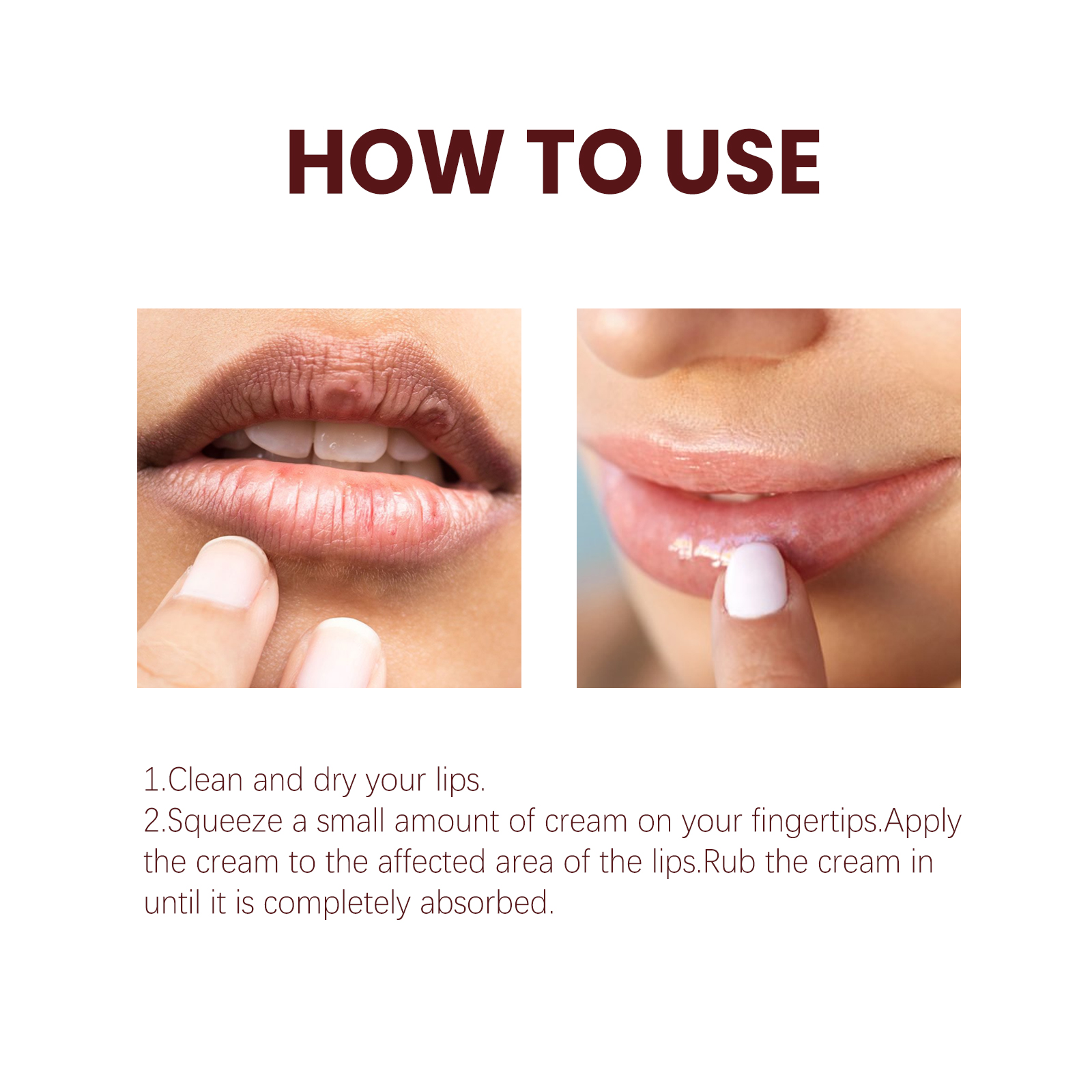 Our lip repair cream contains lysine, vitamin C, and seaweed extract. It repairs damaged skin, provides a protective barrier, and contains antiviral drugs that kill the herpes simplex virus. Delicate lips need your care anytime, anywhere. How to use it is simple: 1. Clean and dry your lips. 2. Squeeze a little cream onto your fingertips. Apply the cream to the affected area of your lips. Rub the ointment until it is completely absorbed. Lip repair cream effectively and nourishes lips, targeting the root causes of cold sores and cheilitis. Soft paste, quick repair, clear and non-stick, giving your lips 24 hours of gentle care.