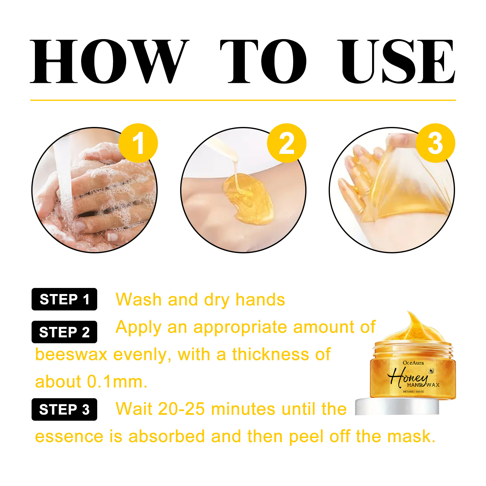 Our Milk Honey Hand Wax contains glycerin, hyaluronic acid and honey extract. It can deeply moisturize and nourish the skin, moisturize for a long time, and make hands soft and smooth. Its use method is very simple: wash hands and wipe, take an appropriate amount of this product evenly spread, the thickness of about 0.1 mm. Wait 20-25 minutes until the essence is absorbed and then peel off. It tightens the skin, improves skin elasticity, and helps keep your hands in tip-top condition.