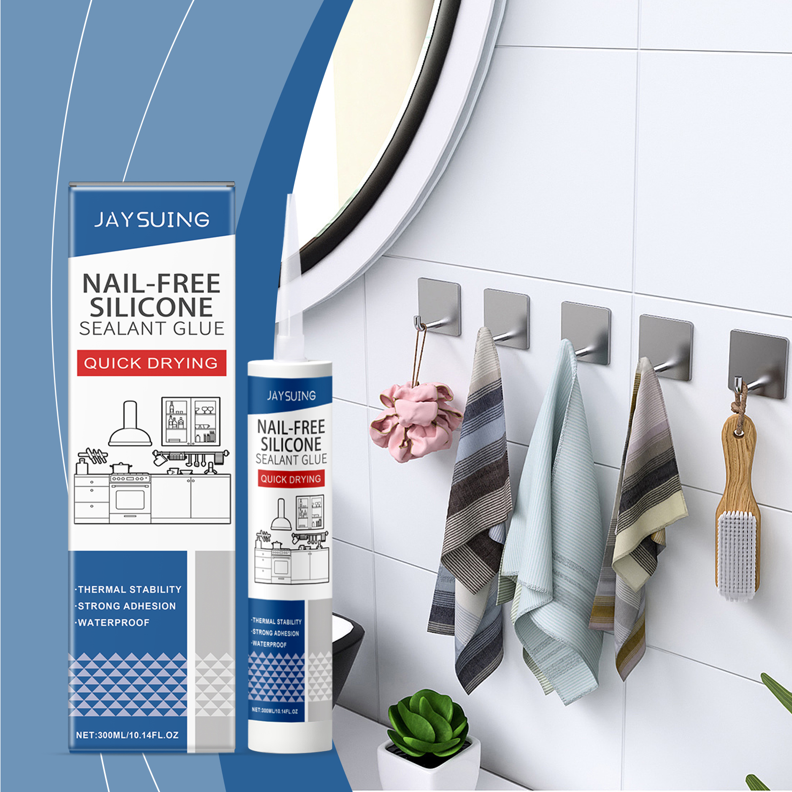 Our nail-free silicone sealant contains silicone polymer, acrylic polymer, defoamer. It can effectively prevent water penetration and protect the structure from moisture; Silicone polymer is combined with acrylic polymer to ensure strong adhesion. Its use method is simple: 1. Clean the walls and keep them dry; 2. Evenly apply the non-nail adhesive on the back of the item to be pasted, in the form of dots or strips; 3. After applying, let dry for 24 hours, and then can be used permanently. The precise formula ensures excellent sealing effect and improves construction quality. Suitable for residential construction, automobile and other fields.