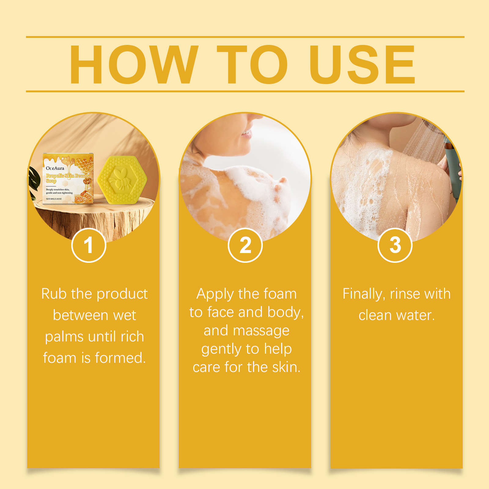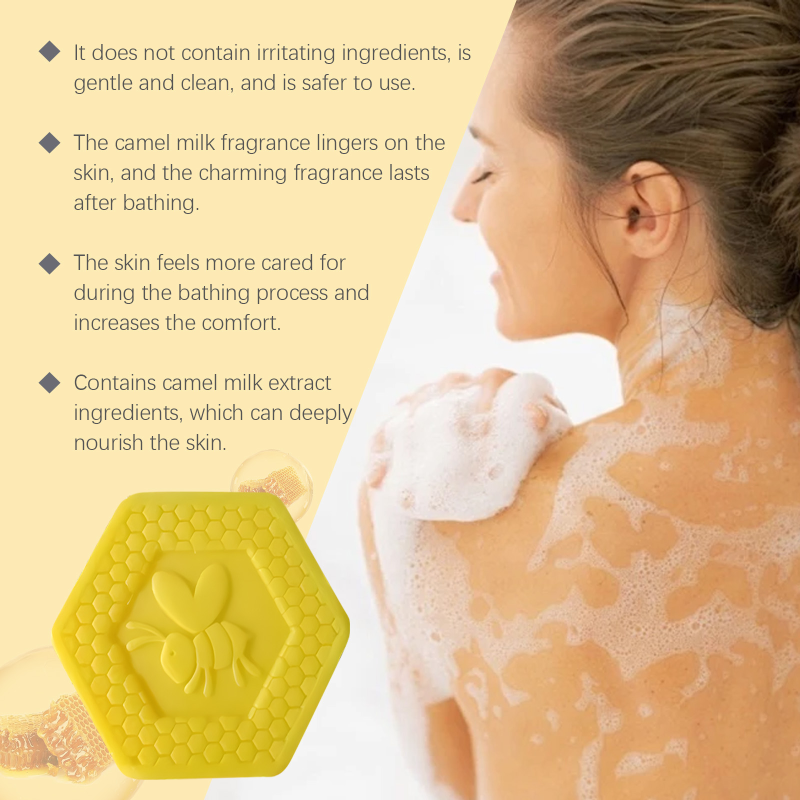 Our propolis body soap contains coconut oil and stearic acid. It can foam delicate and rich, easily cover the skin, bring cleansing enjoyment. The smell of fresh camel milk will make your bath a pleasant time. Its application is simple: Rub the product between wet palms until a rich foam forms. Apply the foam to your face and body and massage gently to help care for your skin. Rinse well with water. And can be used, the skin feels smoother, more delicate, so that it feels more comfortable.