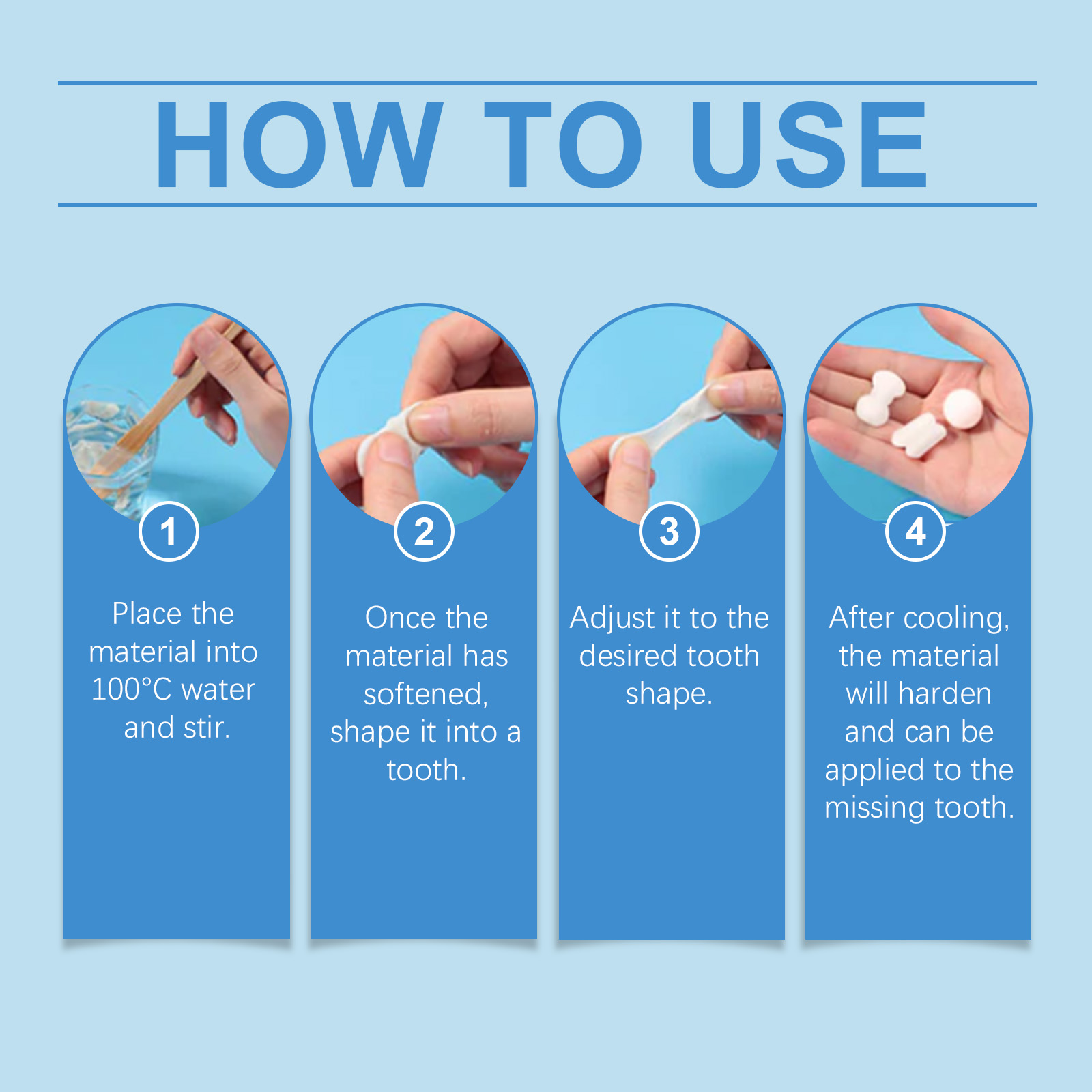 Our solid dental glue granules contain toughening agents and composite resins. It can provide stronger adhesion to stabilize dentures. Its use is simple: stir the material into 100°C water, after the material softens, shape it into a tooth, adjust it to the desired tooth shape, after cooling, the material will harden and can be applied to the missing tooth. And can extend the use of time, long service life. With excellent plasticity and durability, it can make realistic tooth models and wear comfortably.