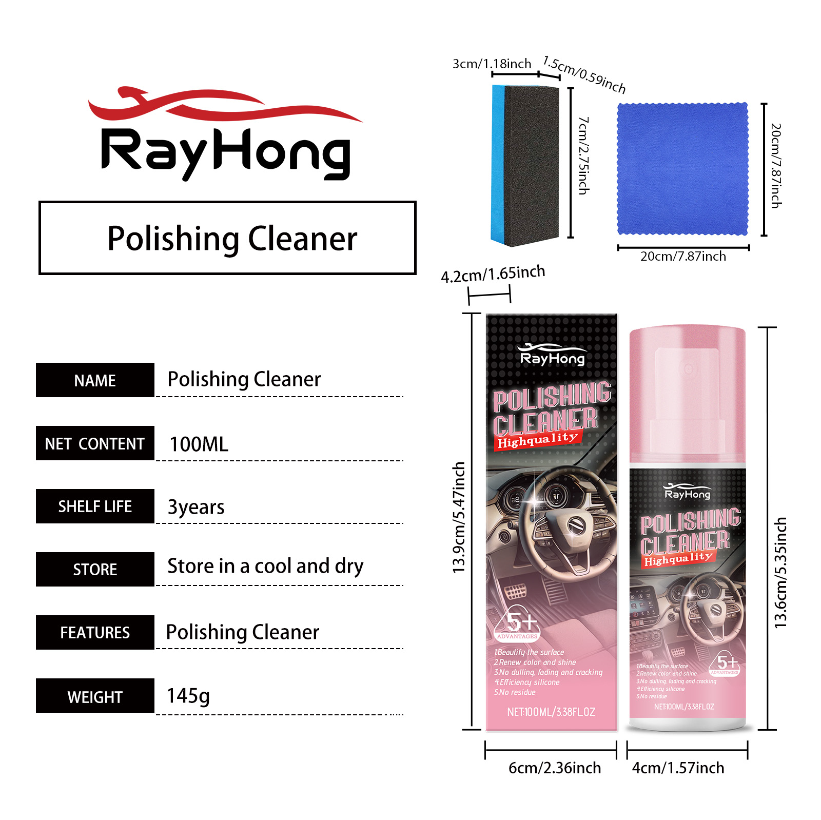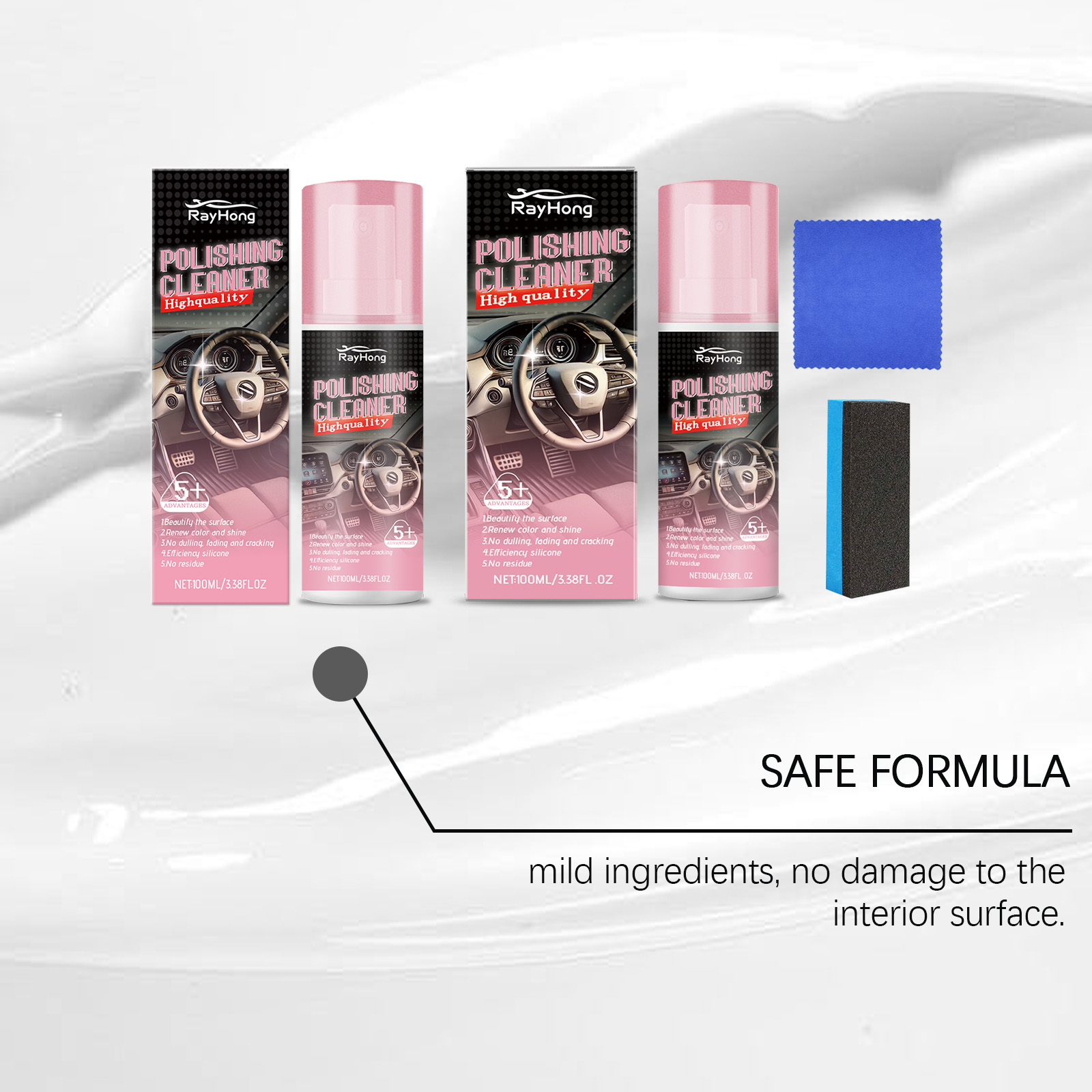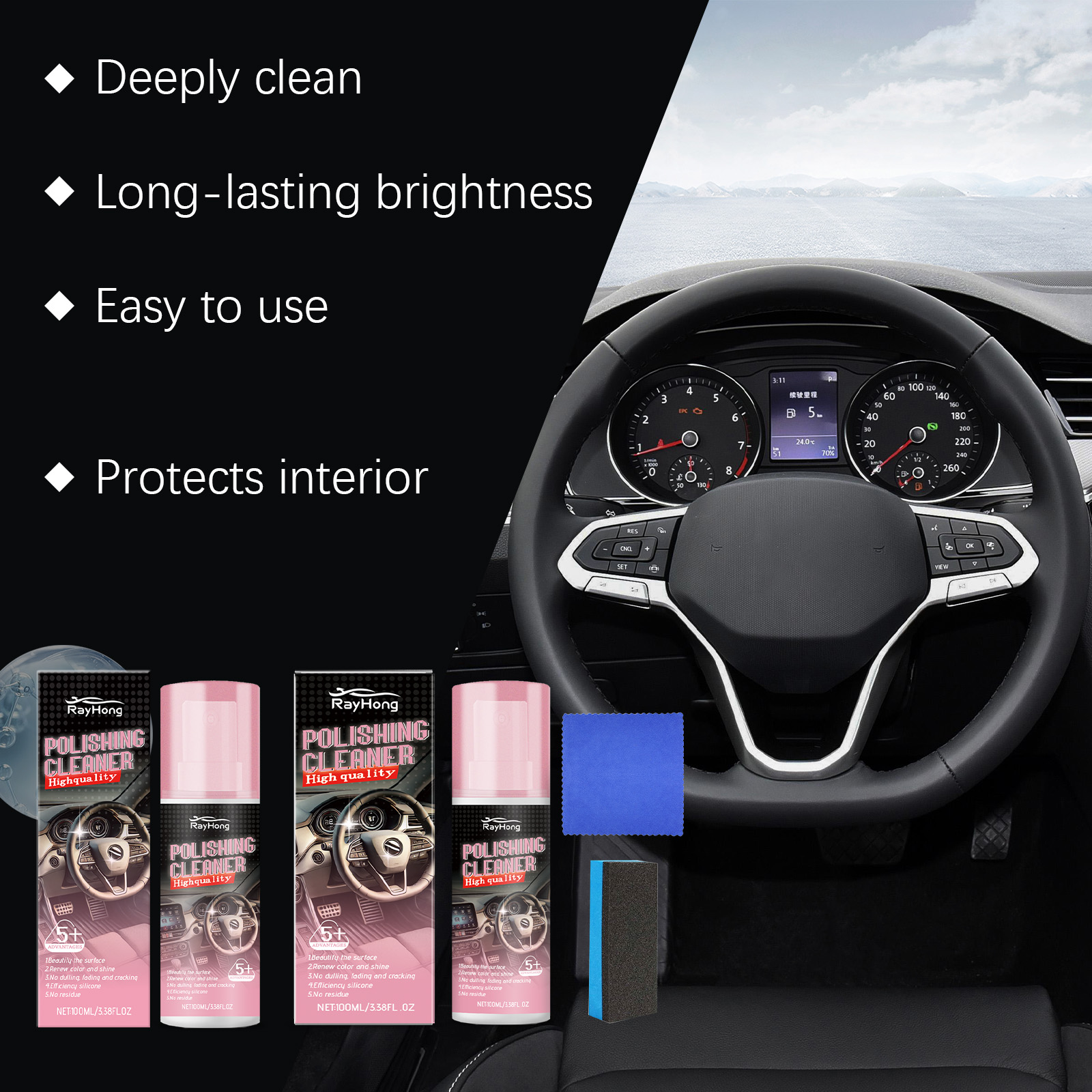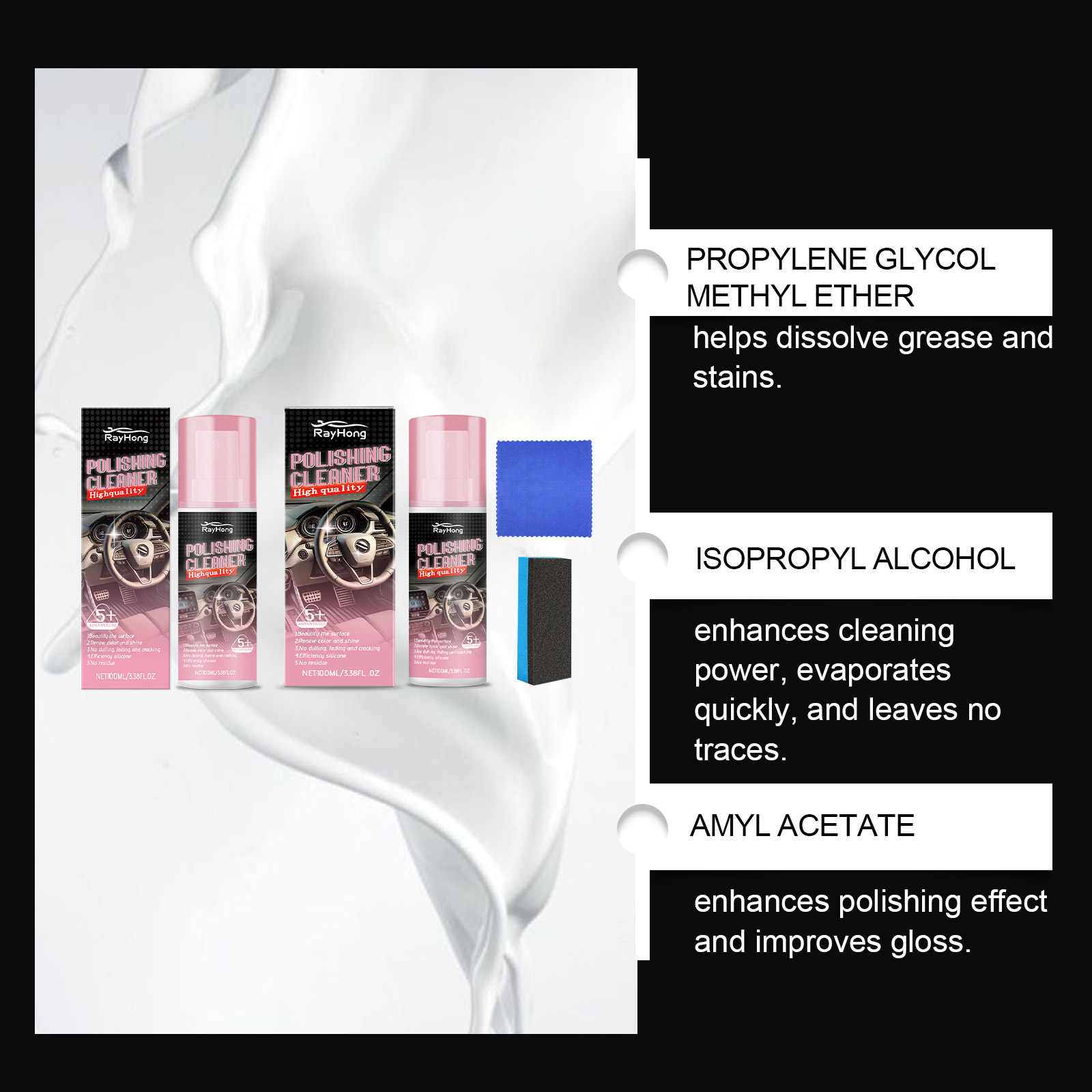 Our automotive interior polishing agent (including tools) contains propylene glycol methyl ether, isopropanol and amyl acetate. It can quickly remove stains from the interior surface. Its usage method is very simple: Make sure the clean surface is free of impurities and shake well before use. Spray the product evenly on the areas of the car that need waxing. Wait for 3 to 5 minutes, and then wipe the surface until it is smooth. And it can provide long-lasting luster protection.