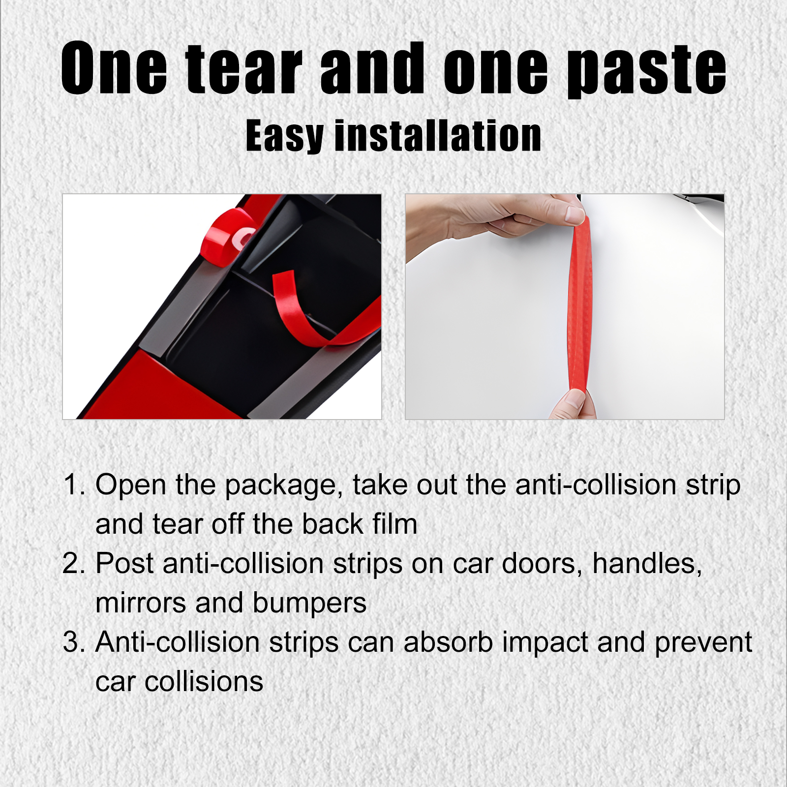 Our car crash stickers contain PVC. It can protect the car 360 degrees, absorb shock pressure, and prevent the car from causing too much damage when the collision friction. Its use method is very simple: first open the package, take out the anti-collision strip, tear off the back film, and paste the anti-collision strip on the door, handle, rearview mirror and bumper. After use, it can effectively reduce the impact caused by car collisions, increase insurance for car travel, and make travel more secure.