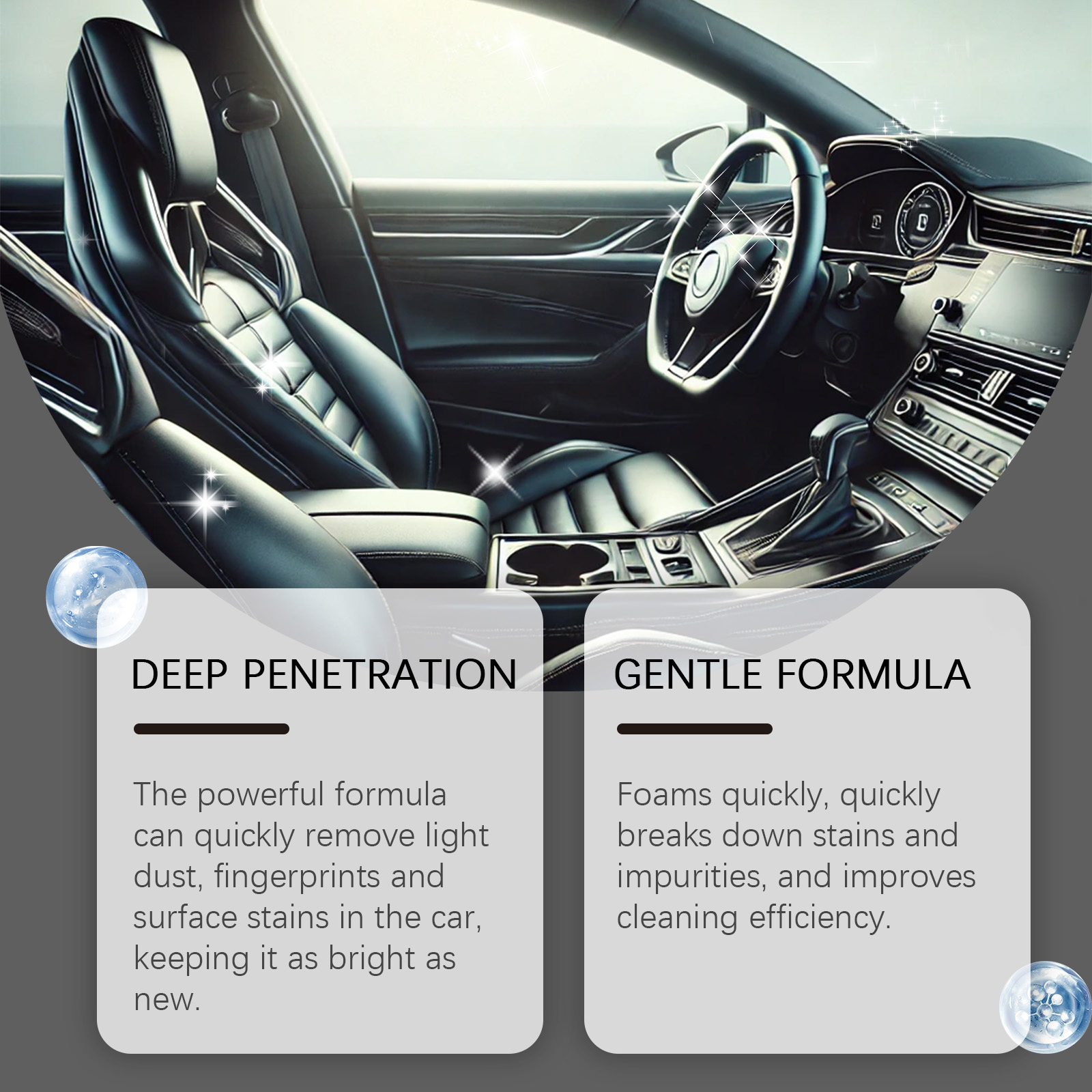 Our car interior cleaner contains tetrafluoroethylene. It can quickly break down stains and impurities, enhancing the cleaning efficiency. The usage method is very simple: make sure the cleaning surface is free of any impurities, and shake well before use. Spray a small amount of the liquid on the cleaned surface and repeat several times. Wipe with a soft and clean cloth, and use a brush for extremely dirty areas. It can also quickly remove minor dust, fingerprints and surface stains inside the car, making the car as shiny as new.