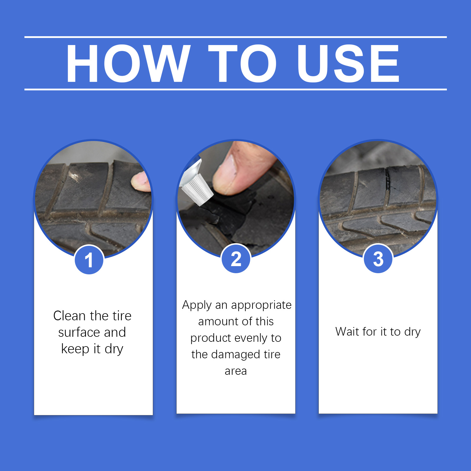 Our tire repair adhesive contains pervinyl chloride, zinc sulfide and carbon black. It can save time and effort for your tire maintenance. Its use method is very simple: clean the tire surface and keep dry, take the right amount of this product evenly apply to the tire damage, and wait for it to dry. And it can help repair tires, make tires look like new, and extend tire life.