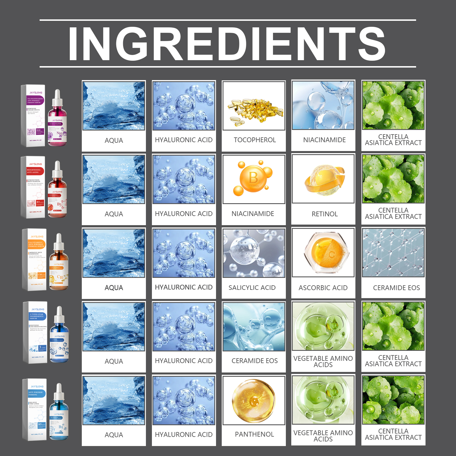 Our 5-piece serum gift set contains hyaluronic acid, niacinamide and Asiaticum asiatica extract. It can be smooth and smooth to improve the skin. Antioxidant, improve skin resistance. Lighten skin tone, even skin tone effect. Its use is simple: 1. Wash your face and keep it dry. 2. Apply appropriate amount of this product evenly on face and neck, gently massage in circular motion to promote absorption. Light, non-greasy, refreshing and comfortable. These are used in combination with targeted use to solve skin problems.