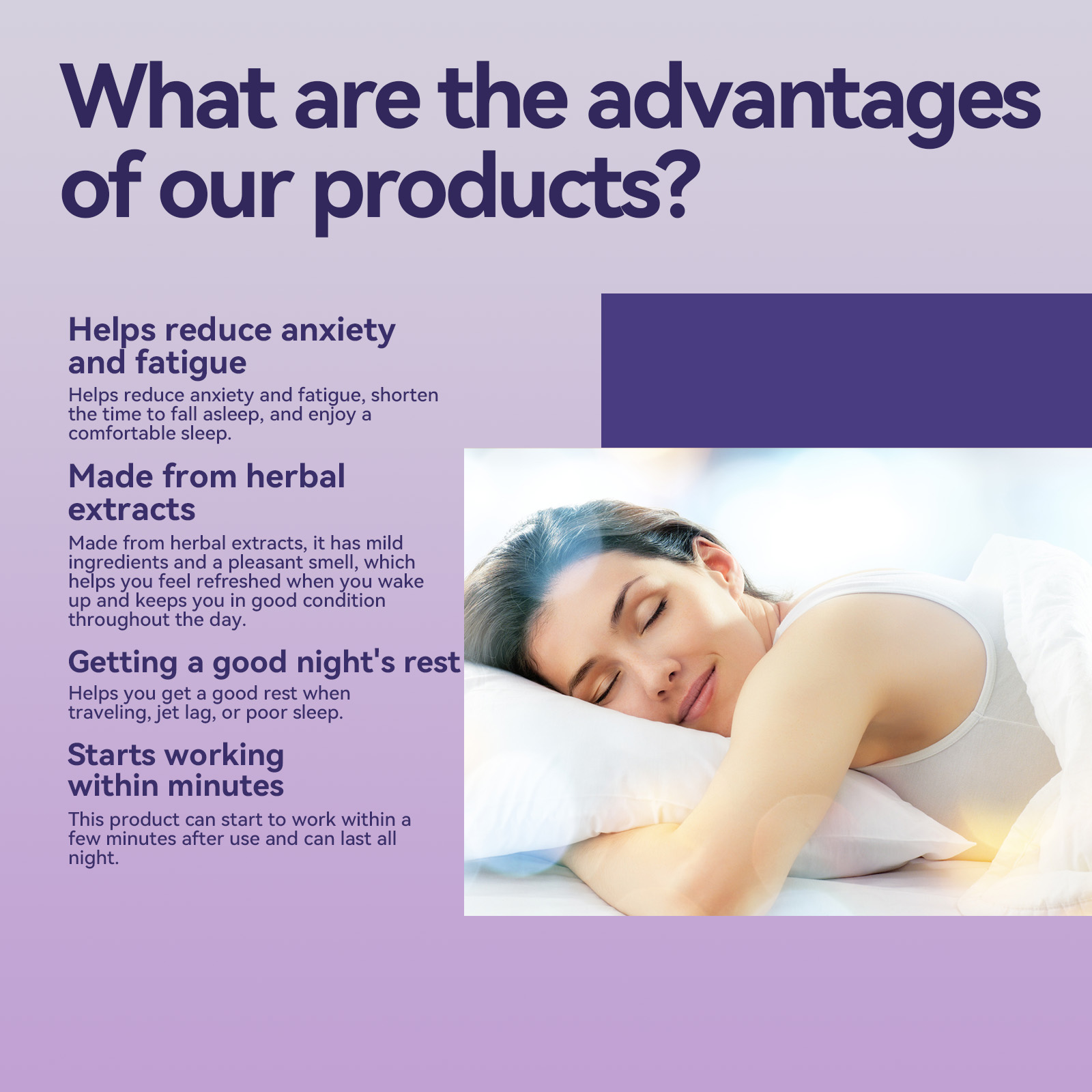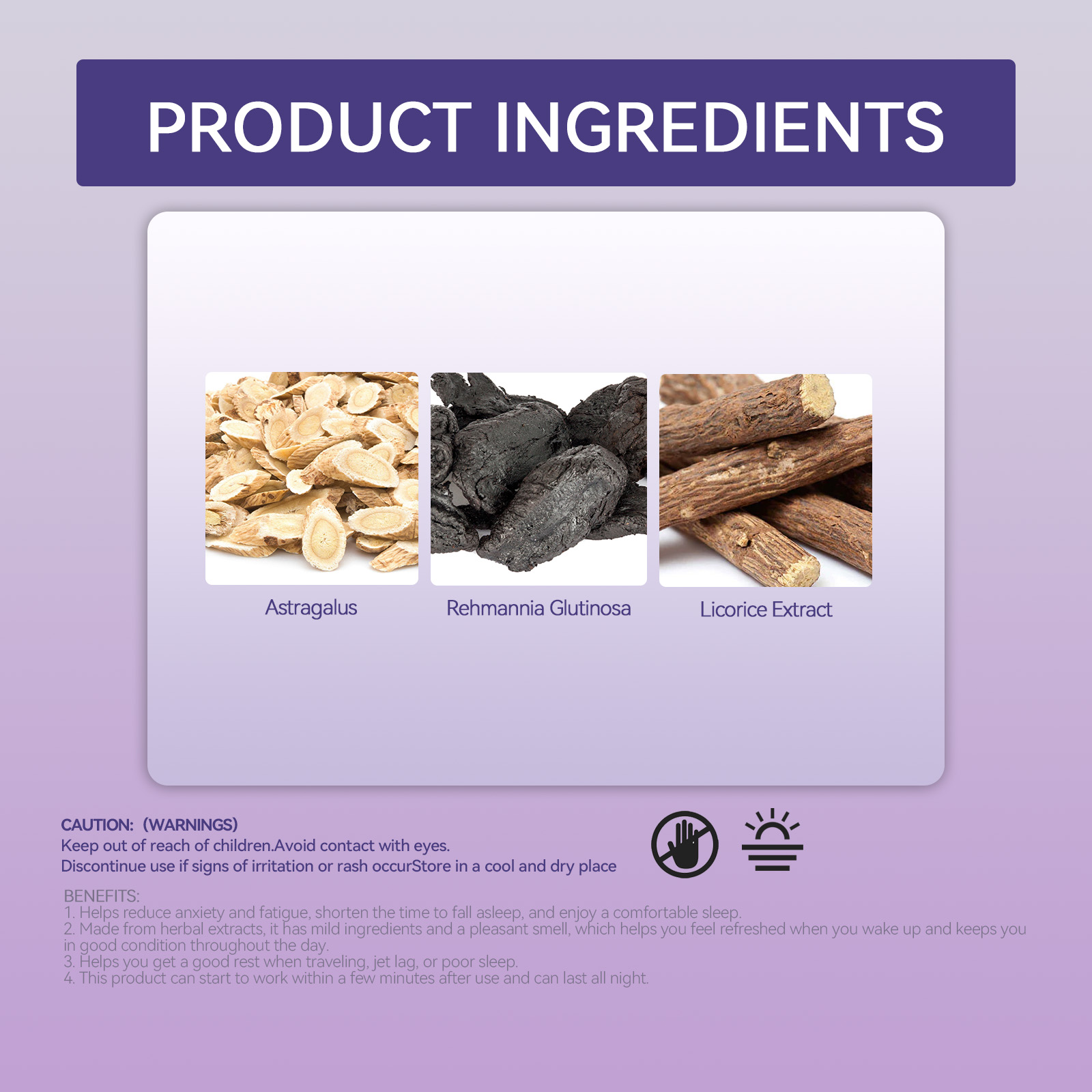Our sleep patches contain astragalus, rehmannia and licorice extracts. It can help reduce anxiety and fatigue, shorten the time it takes to fall asleep, and enjoy a comfortable sleep. Made from herbal extracts with mild ingredients and a pleasant smell, it will wake you up feeling refreshed and keep you feeling good throughout the day. Its application method is very simple: 1. Wash and dry the skin; 2. Apply to arms or wrists before bed. 3. Remove the patch after waking up; 4. Use it daily for better results. Getting a good night's sleep will help you feel well rested when traveling, jet lag, or sleep deprivation.