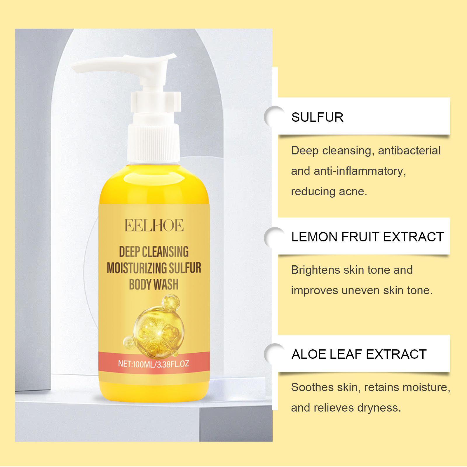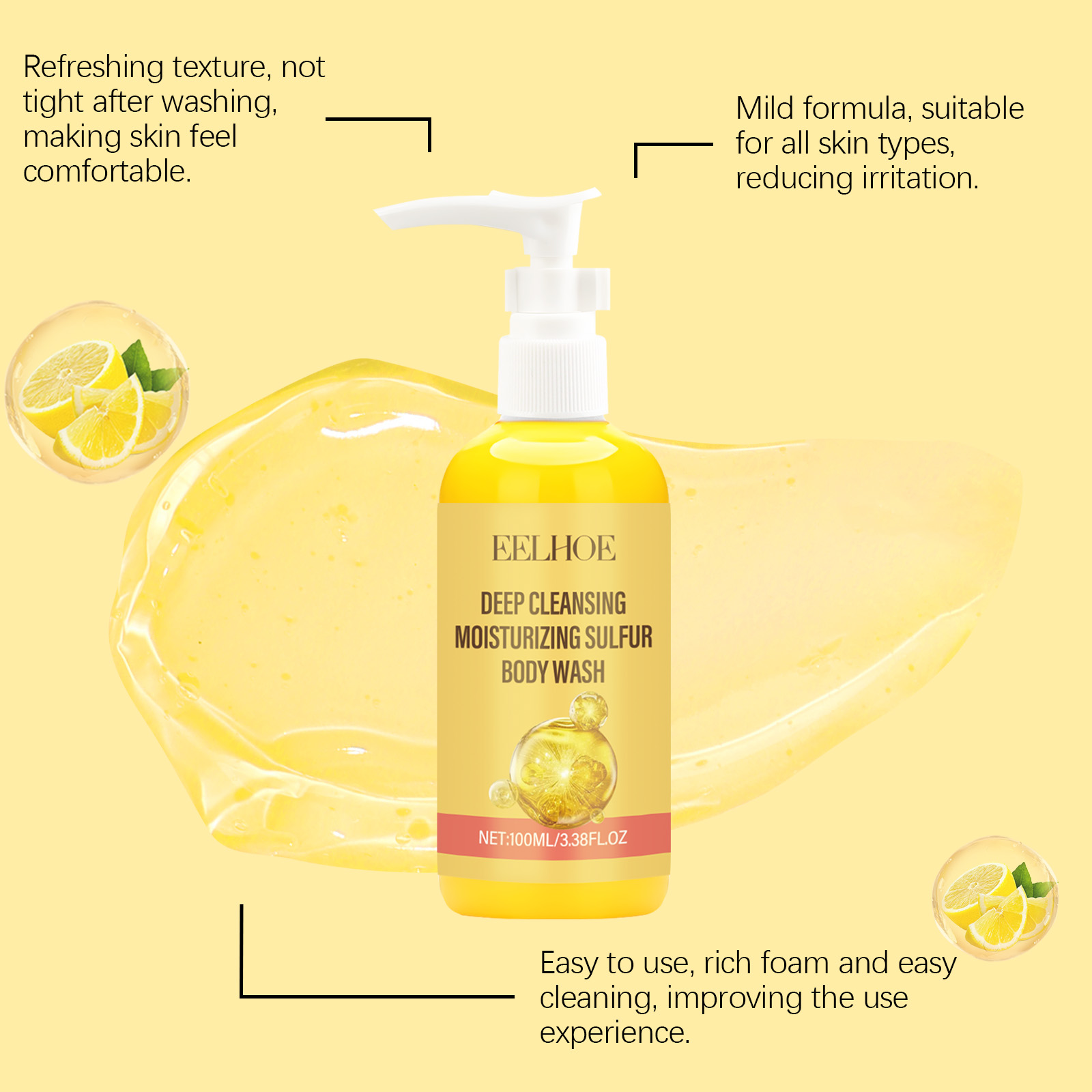 Our sulphur cleanser contains sulphur, lemon fruit extract, aloe vera leaf extract. It can effectively remove dirt from the skin surface and clean pores. Helps to reduce acne recurrence and improve skin condition. Its use method is very simple: 1. Moisturize the body skin with warm water. 2. Usage: Take appropriate amount of this product, rub into foam, evenly spread on the whole body. 3. Gently massage until thoroughly cleaned, and finally rinse with water. Aloe vera leaf extract soothes the skin, provides moisture and dryness.