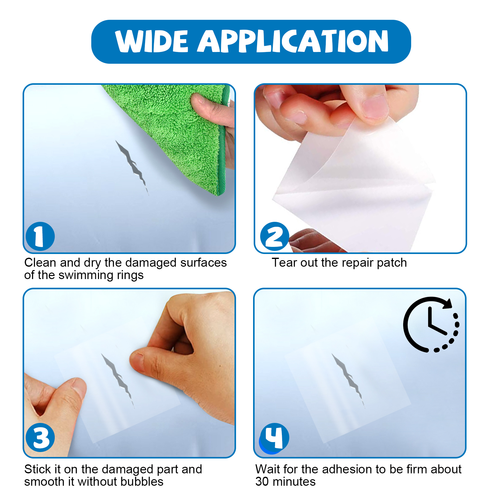 Our swim ring patch contains TPU. It can be applied to all kinds of inflatable or waterproof items: tents, swimming rings, inflatable boats, inflatable castles, inflatable toys, etc. Its use is simple: clean and dry the surface of the damaged swimming ring, remove the repair patch 34, apply it to the damaged area, and smooth it without bubbles. Wait about 30 minutes for it to bond firmly. And can repair subsidies can effectively repair the loopholes on the inflatable items, leaving no obvious repair traces.