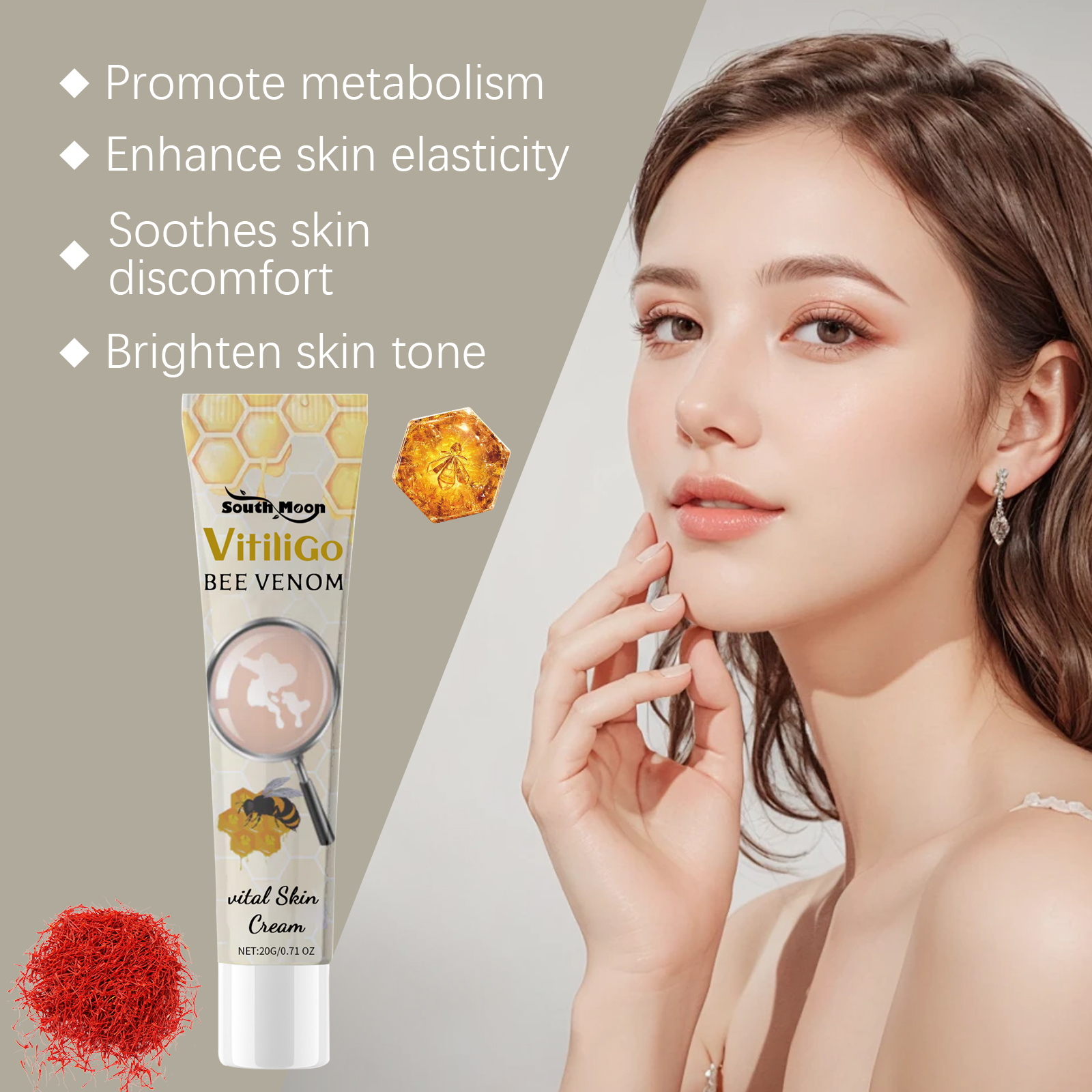 Our Vitiligo Bee Venom contains glycerin, bee venom, safflower extract. It can effectively promote the production of melanin, even skin tone, restore skin bright luster, balance skin tone, deep nourishment, promote skin regeneration, show a healthy glow. Its application method is very simple: clean dry skin, take appropriate amount of this product evenly apply to the affected area, gently massage until absorbed. It can precisely regulate the melanin, make the skin even, rich in antioxidant components, anti-free radicals, delay aging, balance the skin texture, and make the skin firmer.