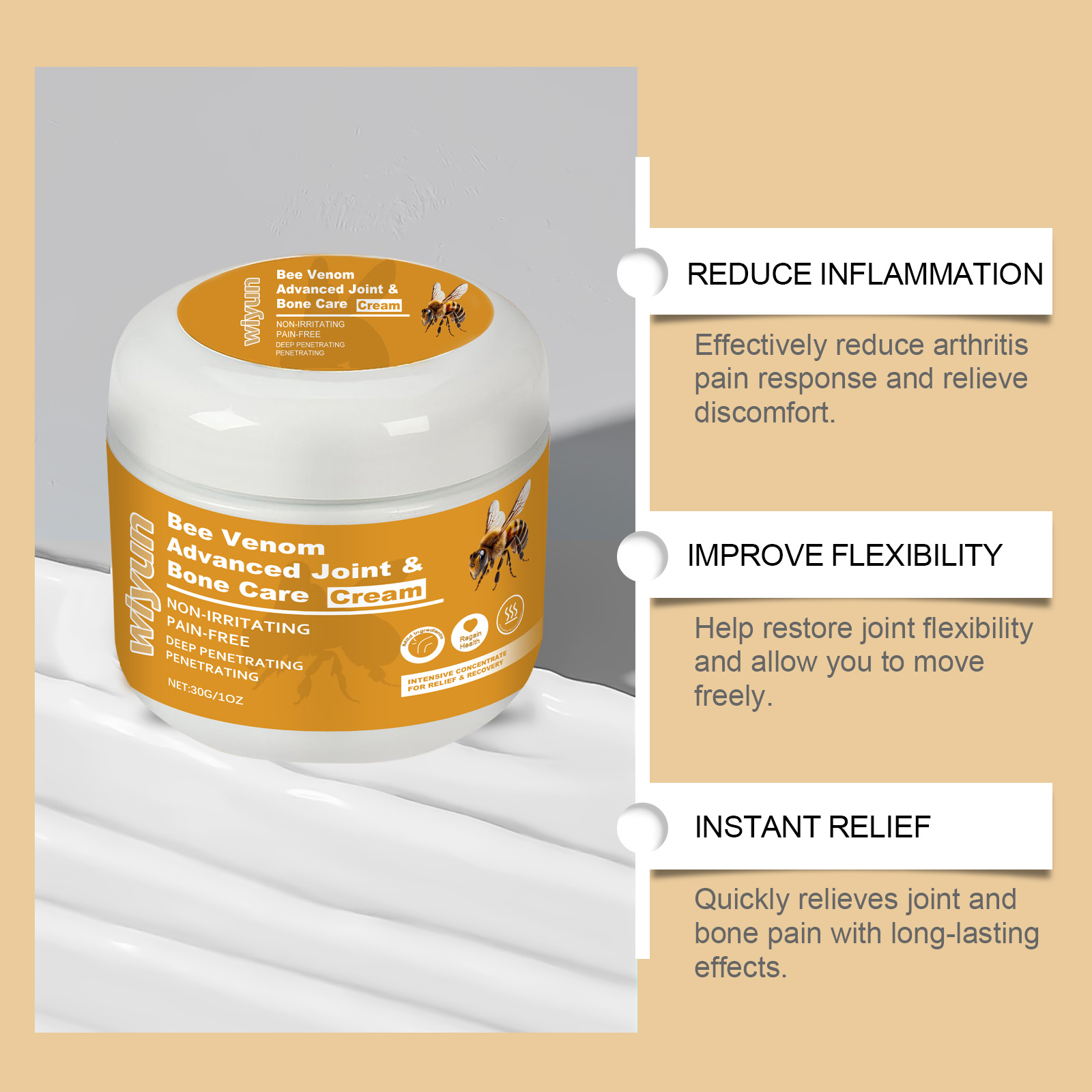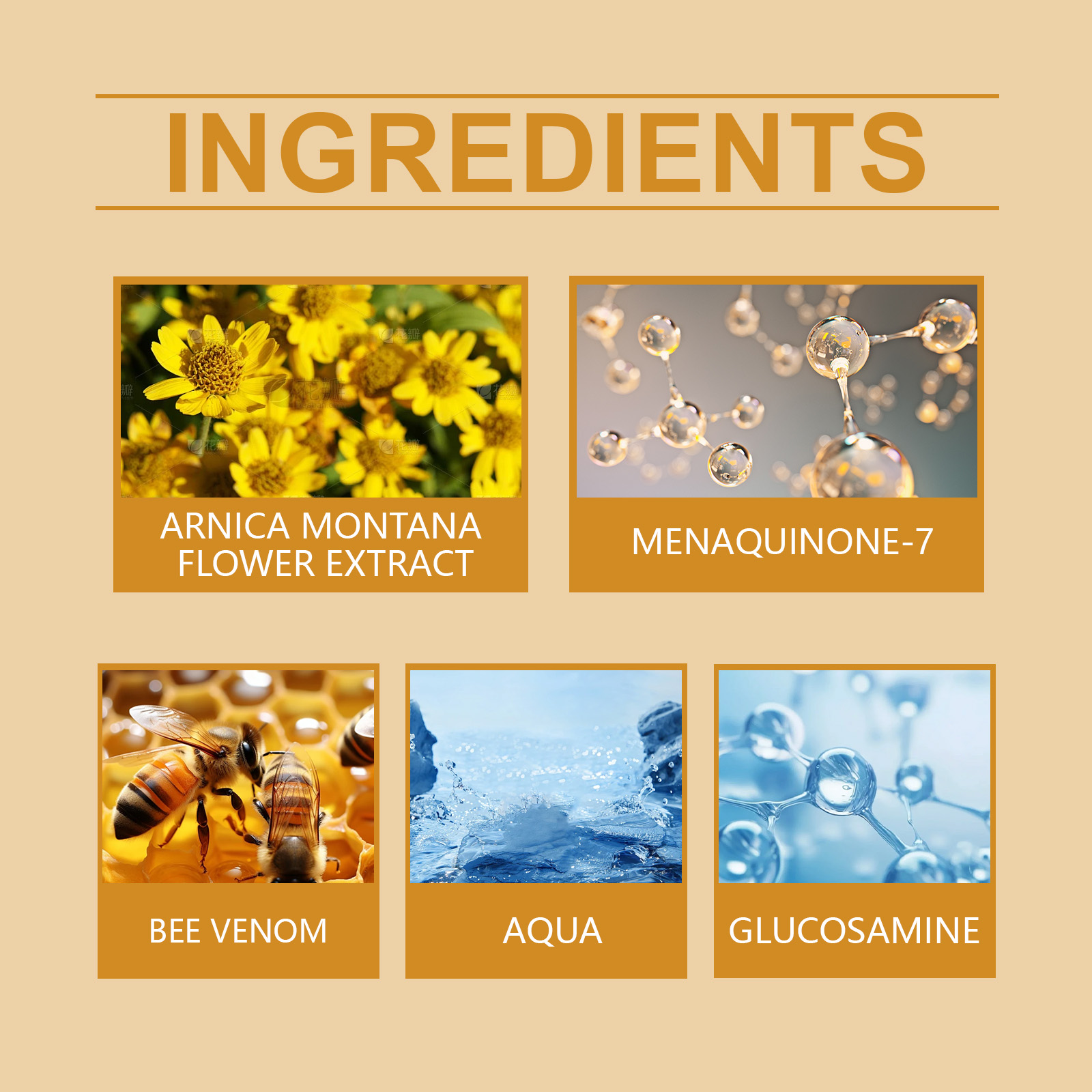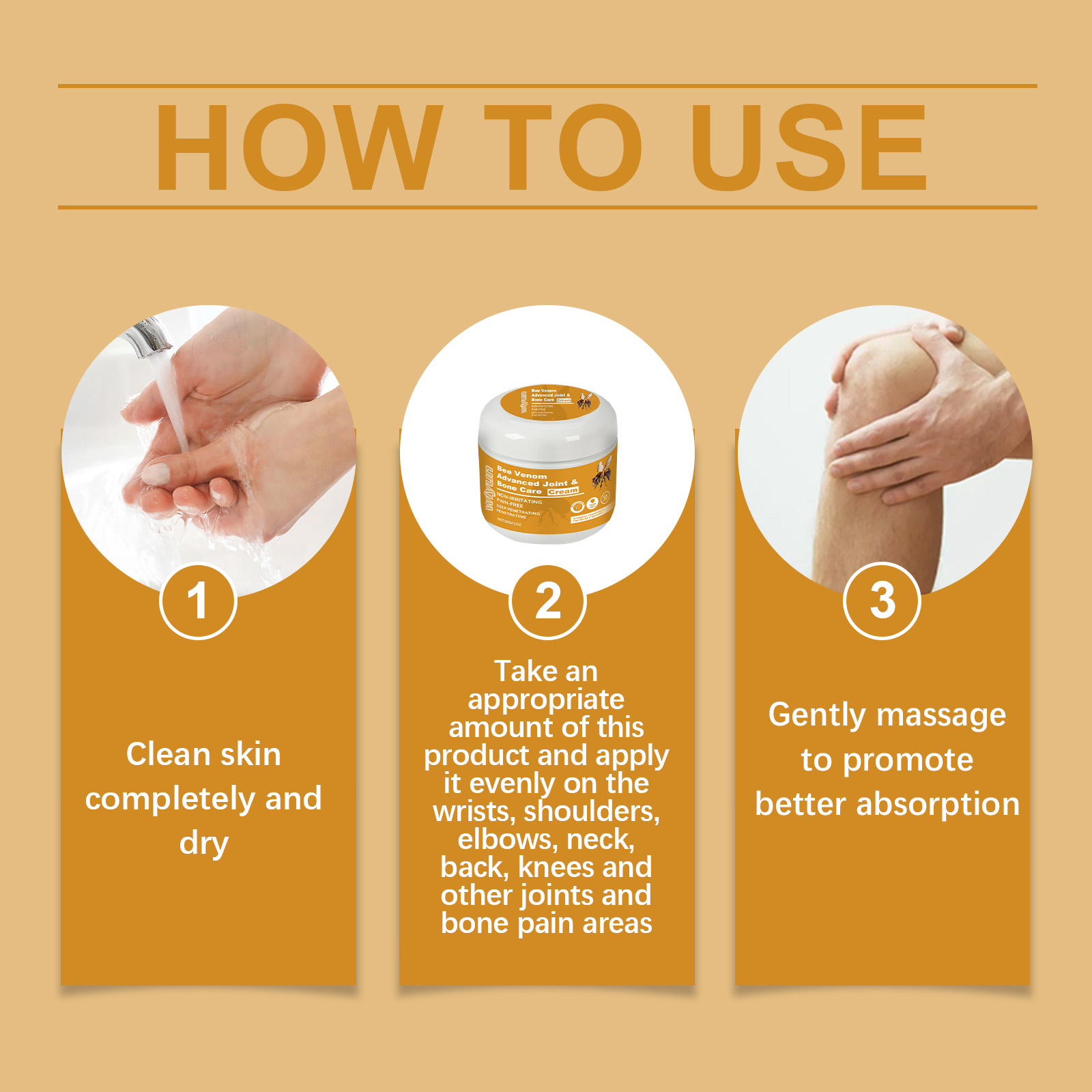 Our bee Venom joint care cream contains bee venom, vitamin K2, Arnica flower extract. It can joint and bone pain quickly and has a long-lasting effect. Penetrate deep into the skin to reach pain points and provide lasting relief. Its application method is simple: 1. Thoroughly clean and dry the skin; 2. Apply appropriate amount of this product evenly on wrists and shoulders. Elbow, neck, back, knee and other joints and bone pain; 3. Massage gently to promote better absorption. Promotes connective tissue repair and makes you more relaxed.